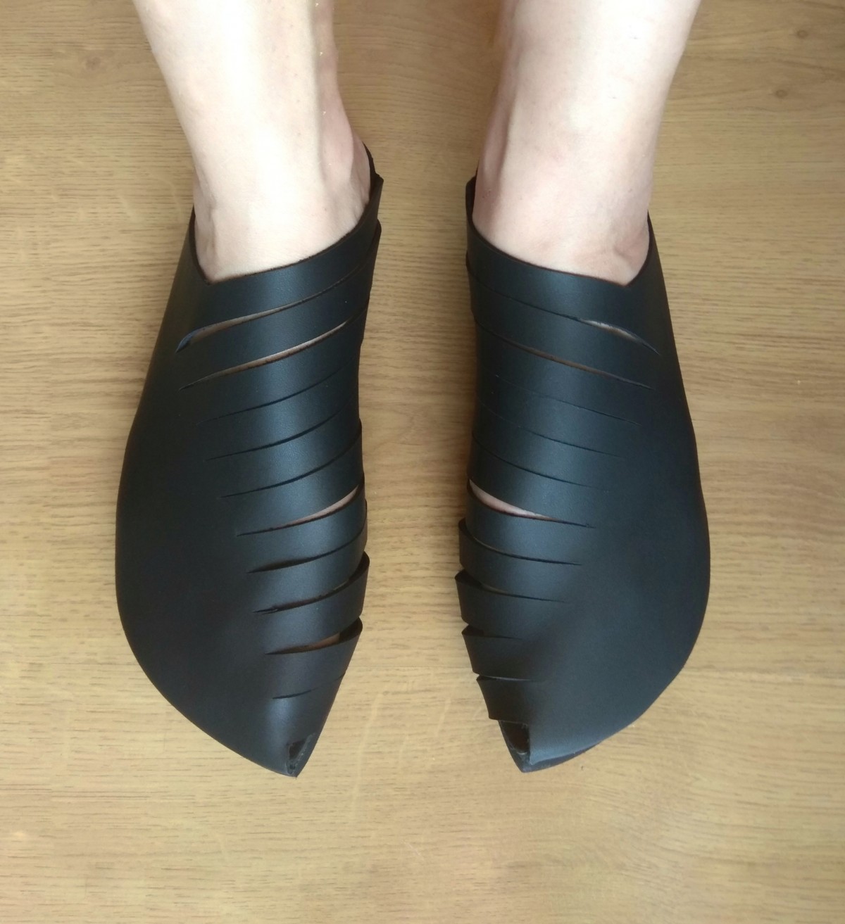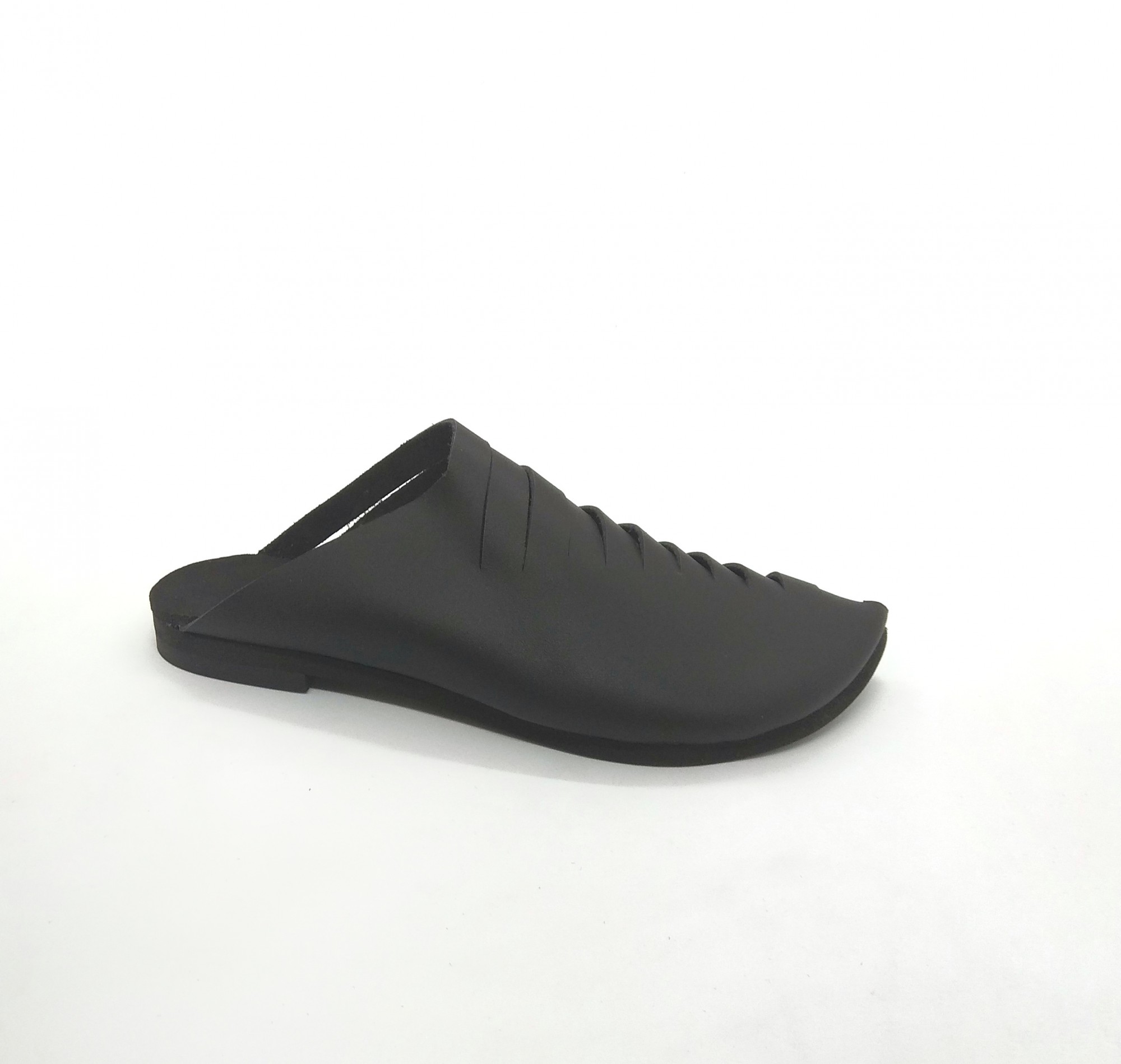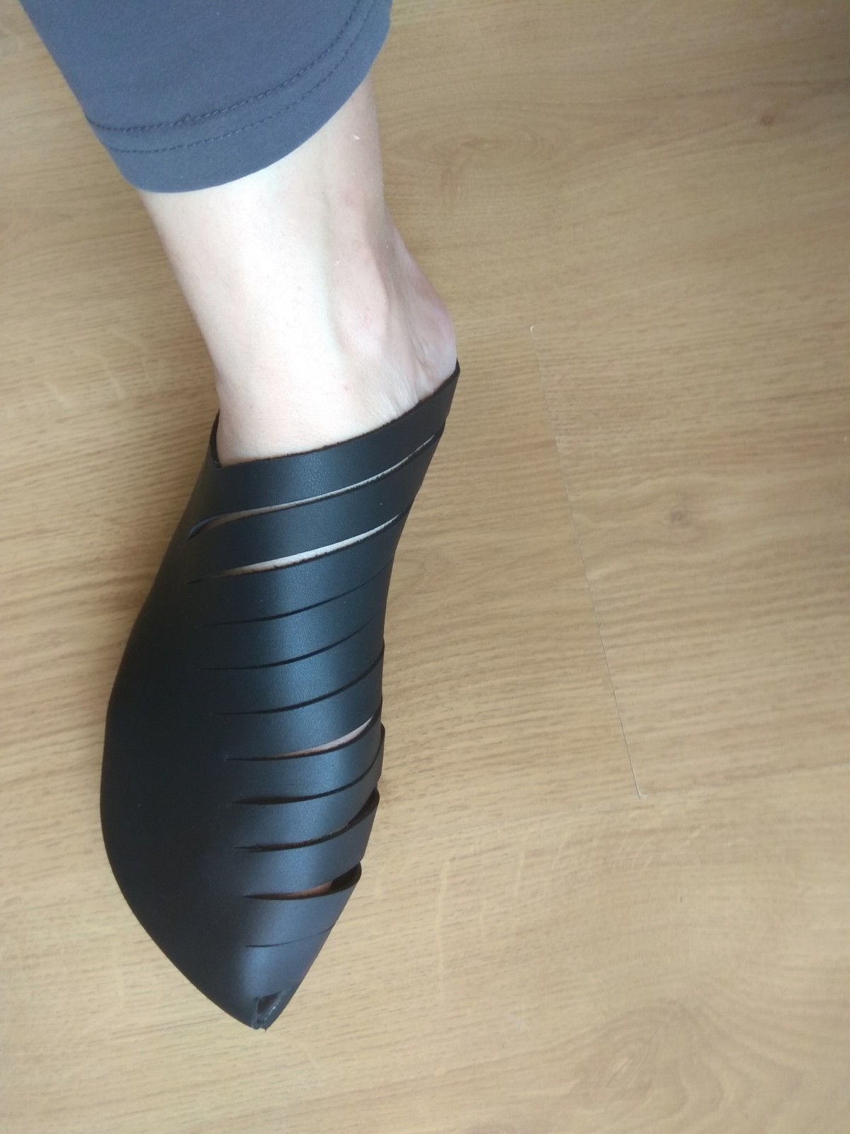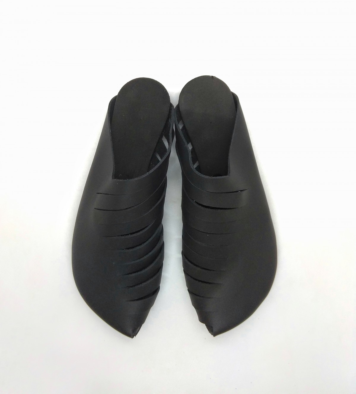 כפכף סגור עם שפיץ מקדימה, מאוורר על ידי חריצים בצד הפנימי. שיקי ואסימטרי. רפידת ספוג גומי.