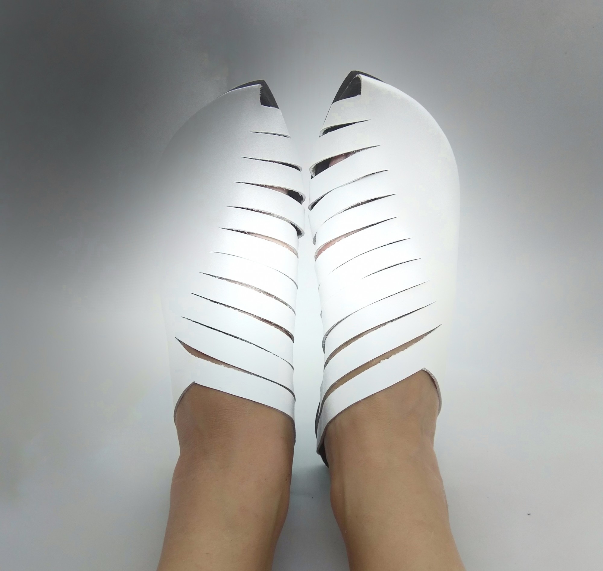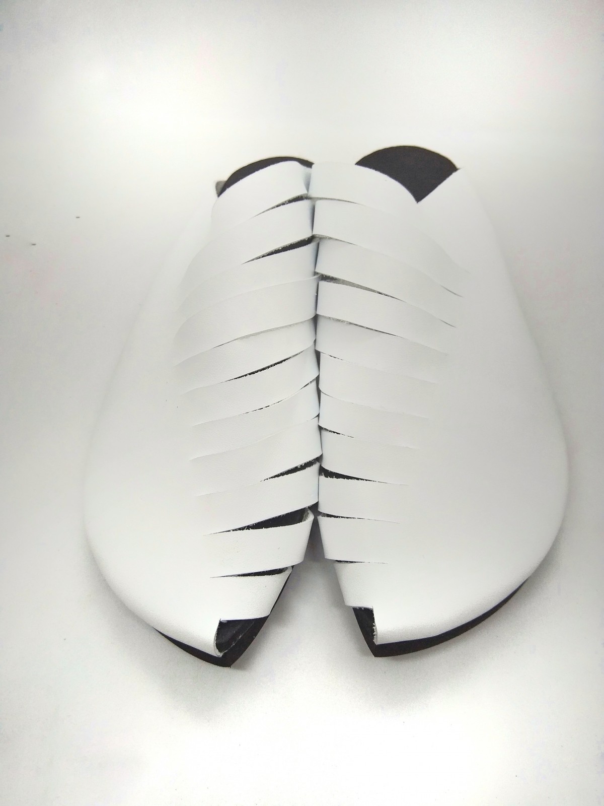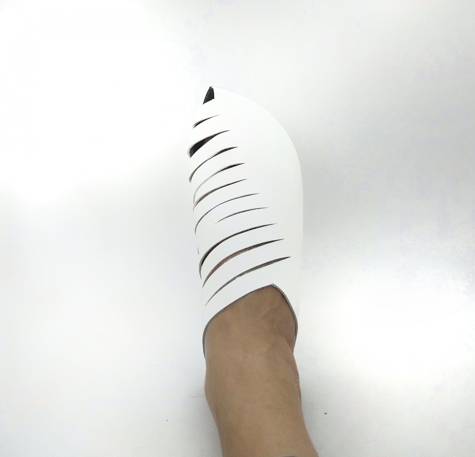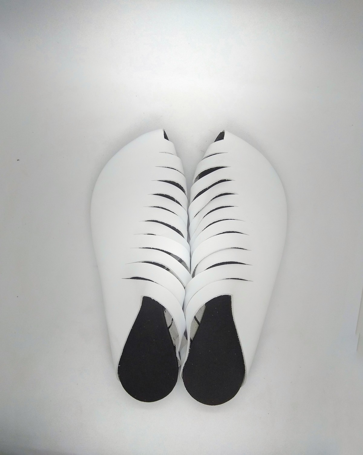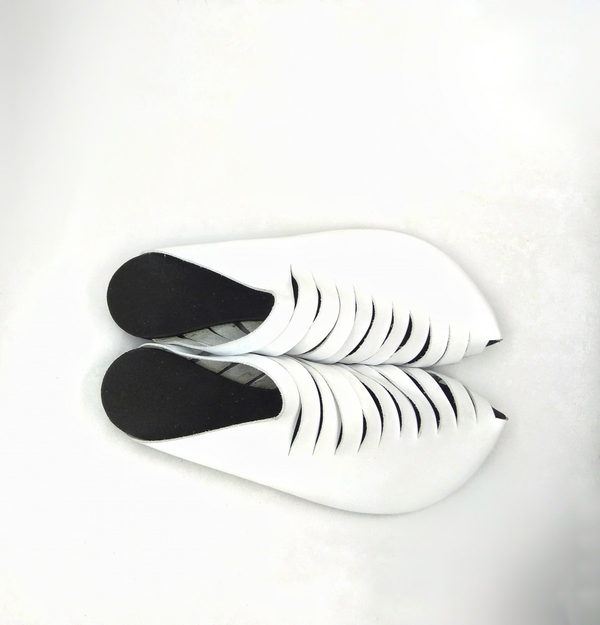 כפכף סגור עם שפיץ מקדימה, מאוורר על ידי חריצים בצד הפנימי. שיקי ואסימטרי. רפידת ספוג גומי.