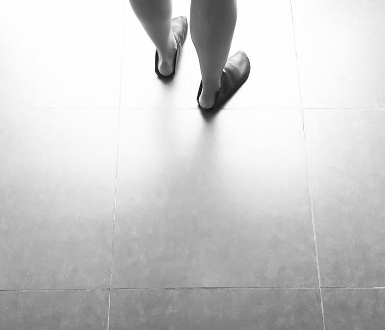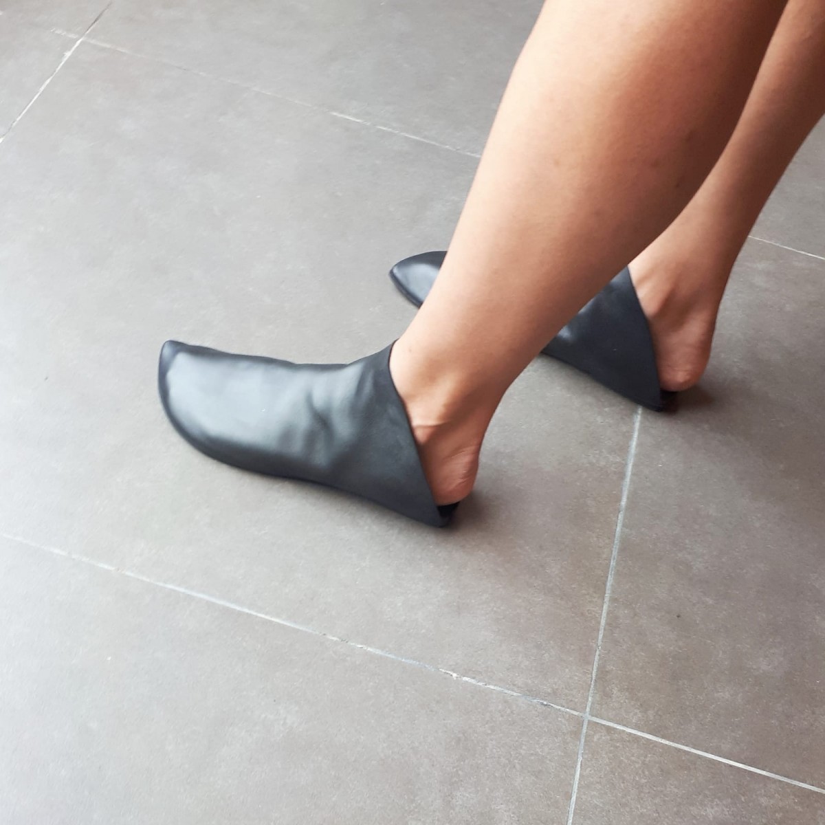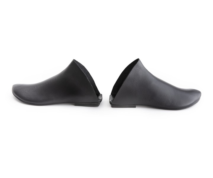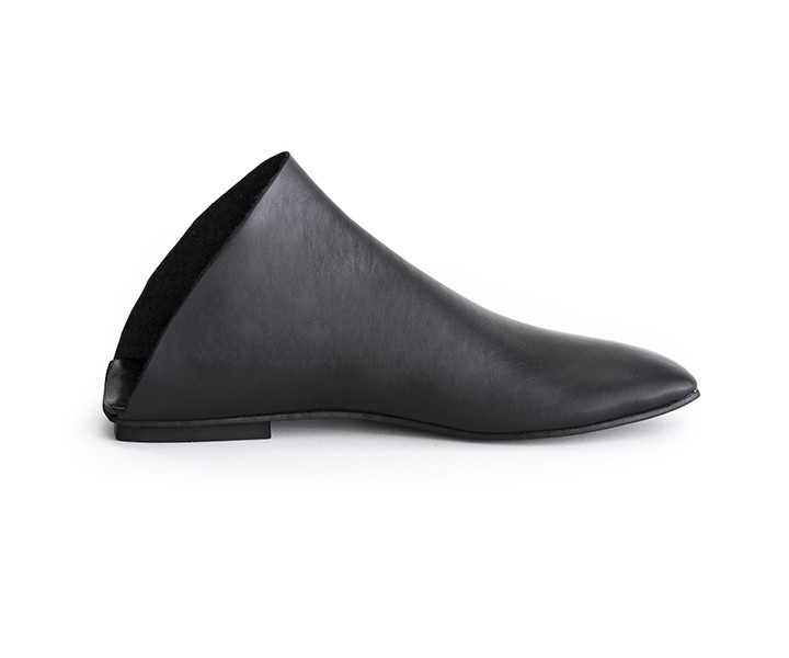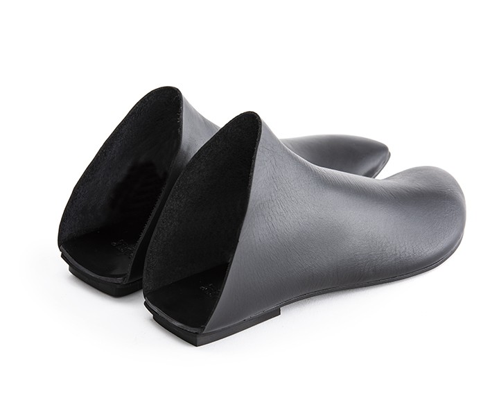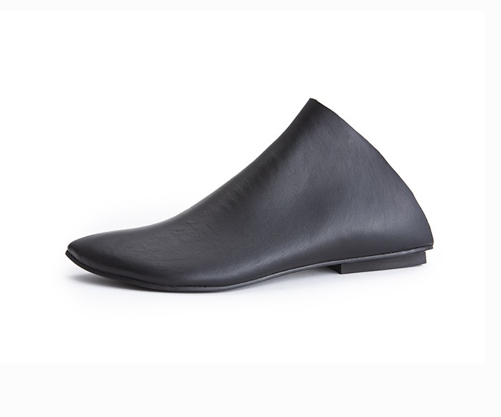 כפכף מגפון שטוח, מתעגל לשפיץ מקדימה ומרובע מאחור. עור רך, רפידת ספוג גומי.