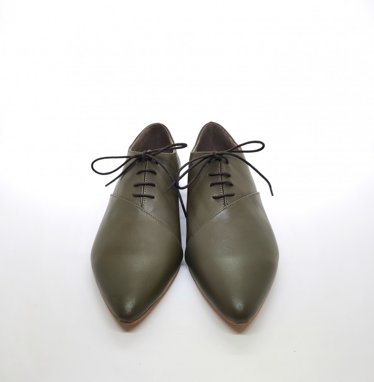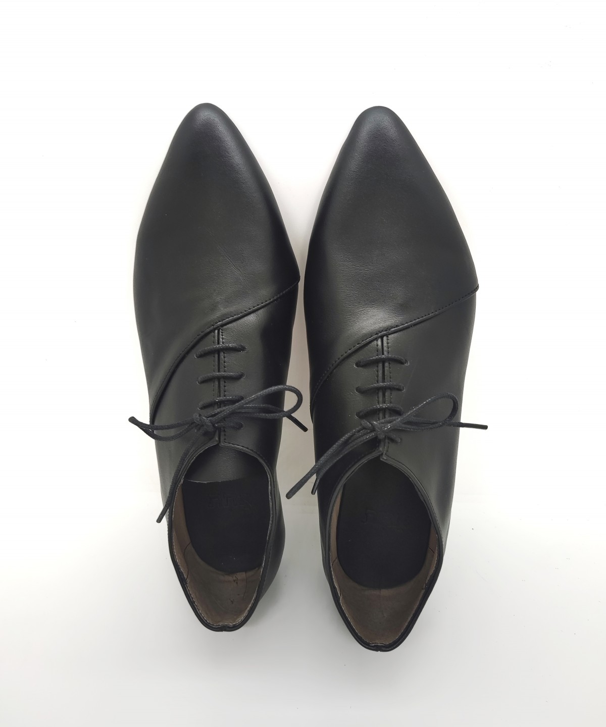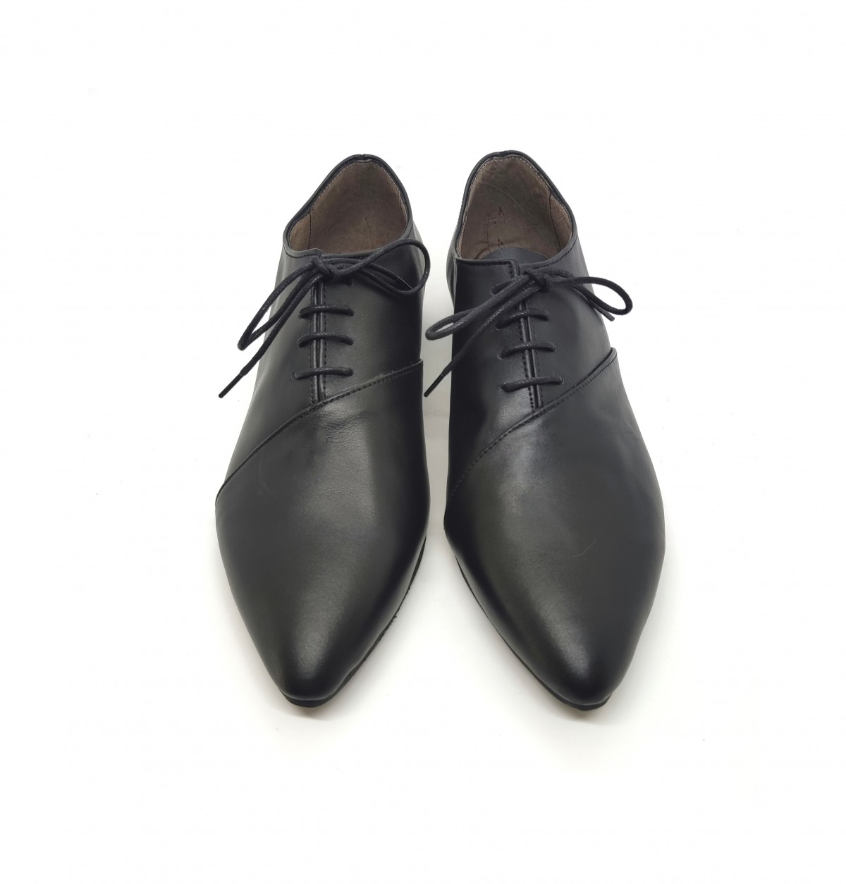 נעל שרוכים שפיצית שטוחה(שפיץ מתון), אפשר להזמין זוג סימטרי (כל נעל היא תמונת מראה של השניה) ואפשר להזמין זוג א-סימטרי (ראו תמונה למטה, בשחור), משלוח תוך שלושה שבועות