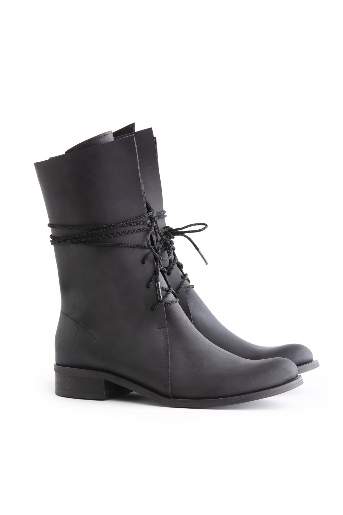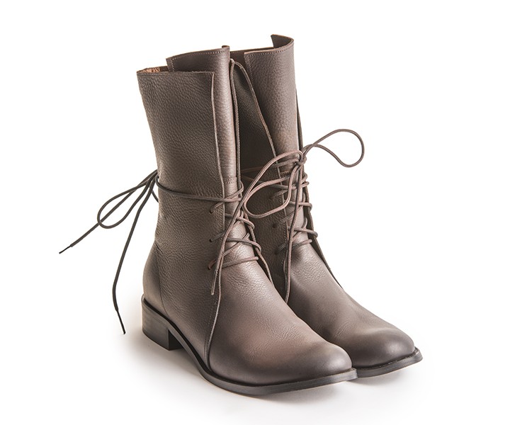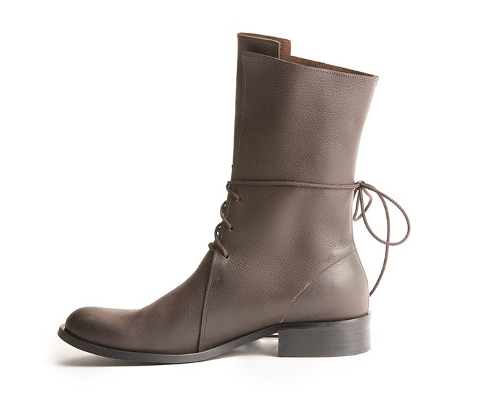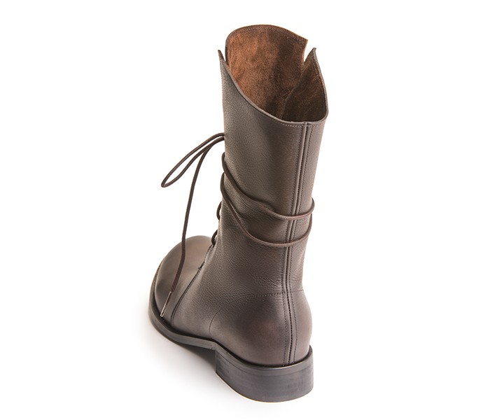 מגף שרוכים בגובה אמצע שוק, 21סמ' - 23סמ'. גובה עקב 2.5 סמ'. הסוליות היום עבות יותר מאשר בתמונה, ראו בדגם קלאפה. בתמונה בעור נובוק שחור.