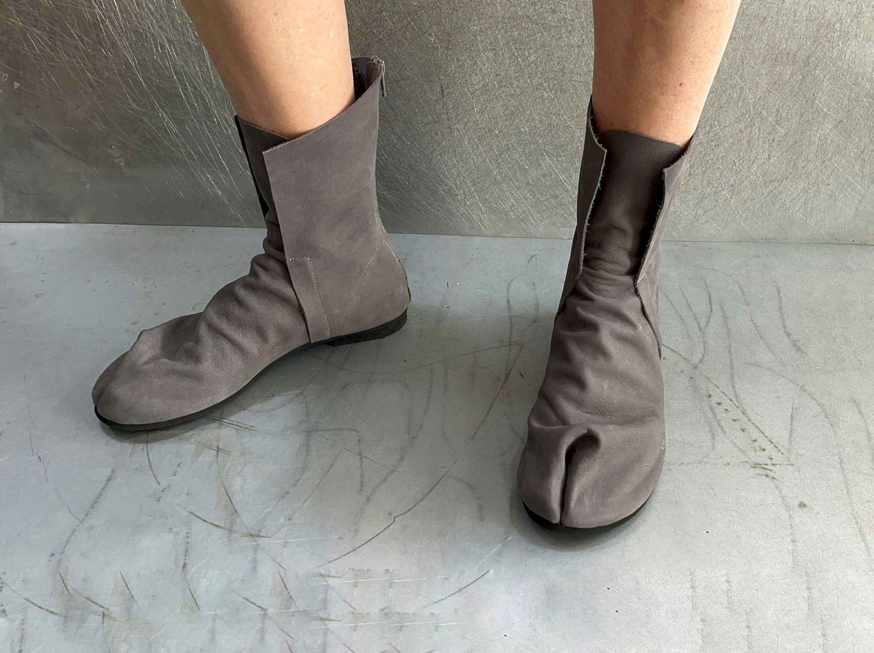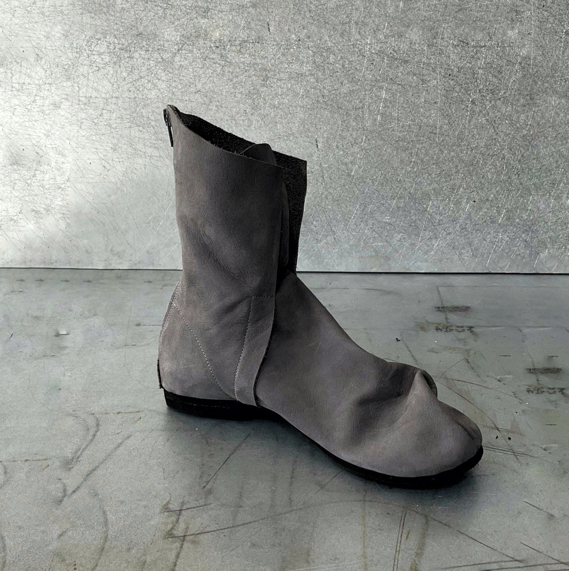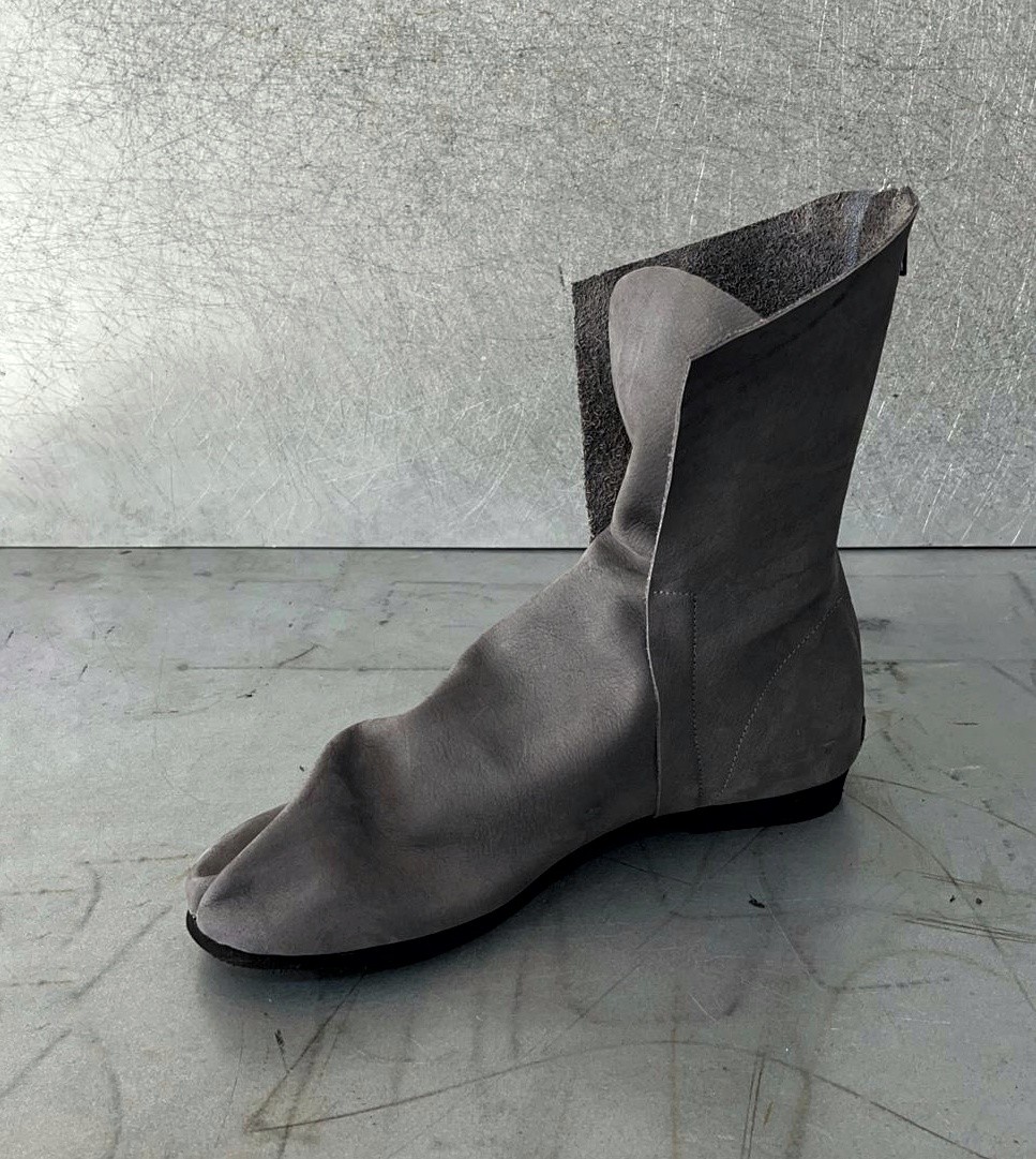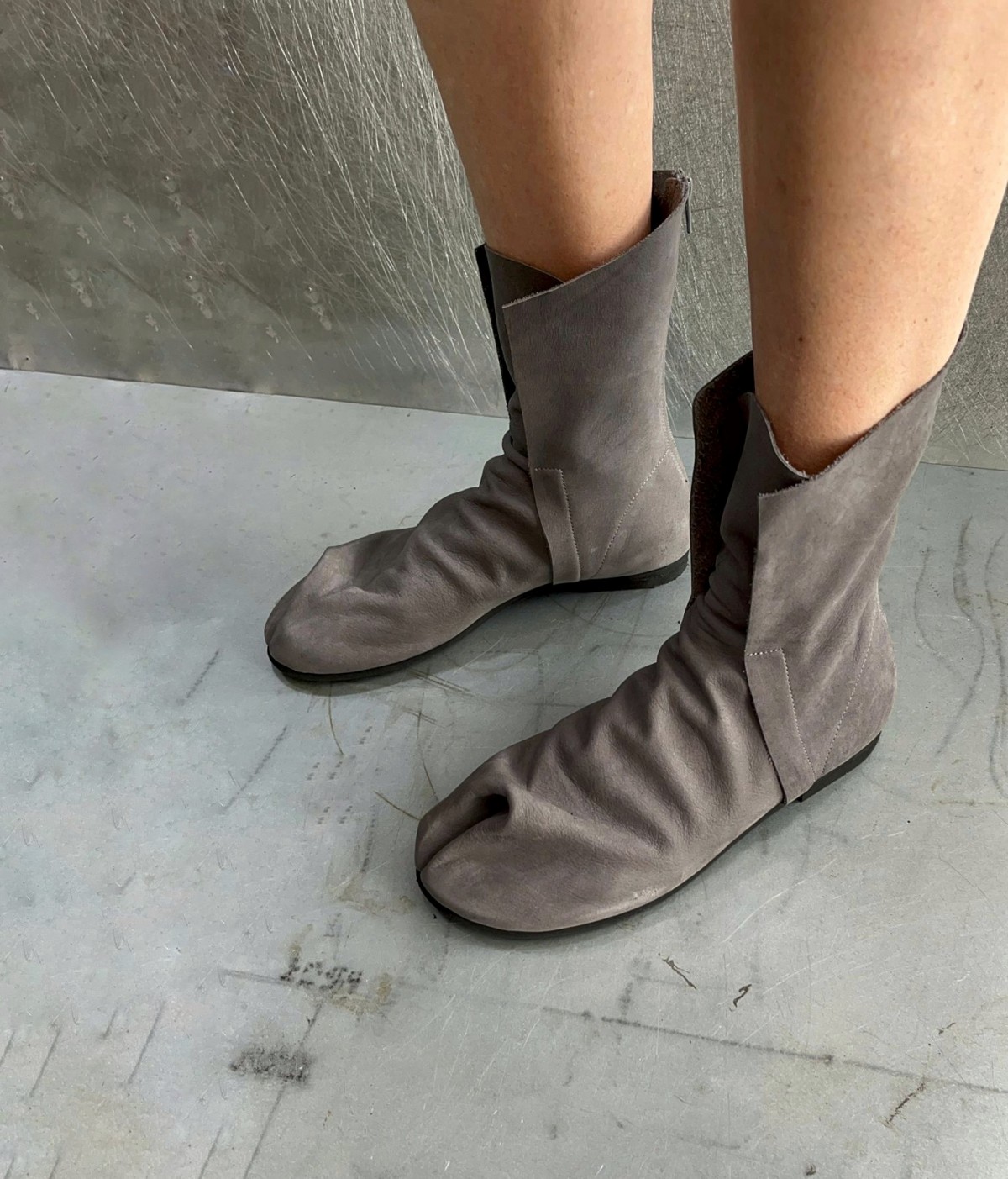 מגף טאבי שטוח לא צמוד לכף הרגל, עם רוכסן מאחור, בגובה מתחת לשוק, 17סמ' - 19 סמ'. דורש גרב טאבי. בתמונה מעור נובוק רך במראה קטיפתי.