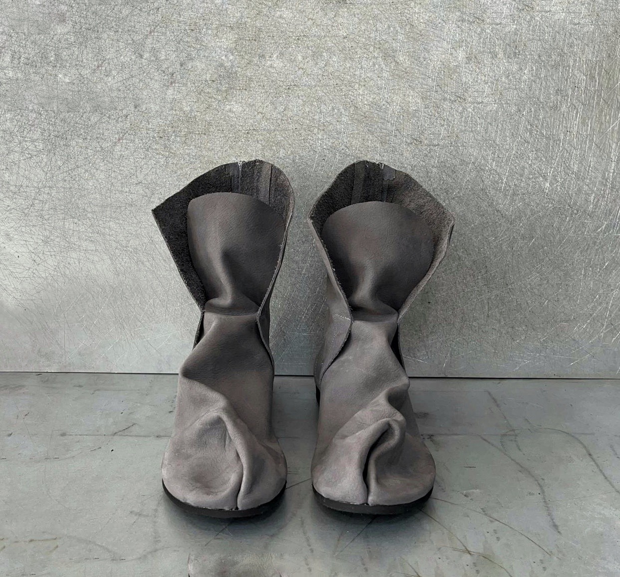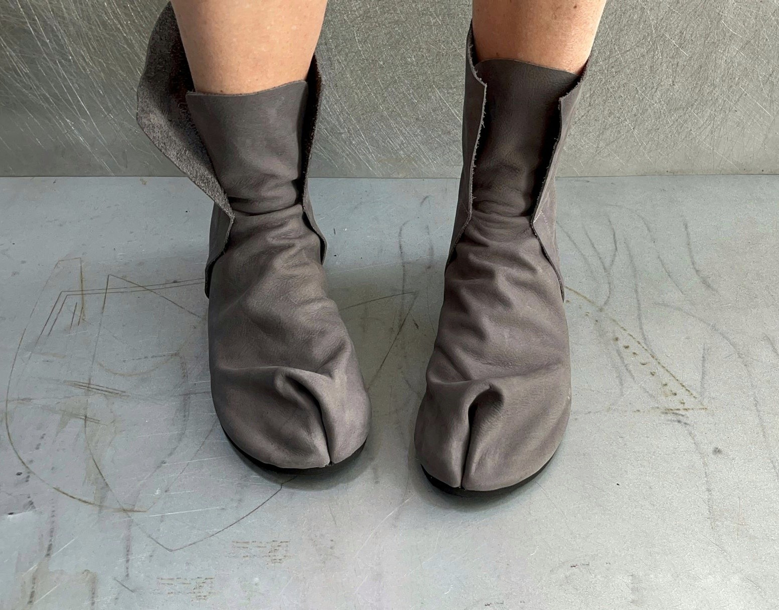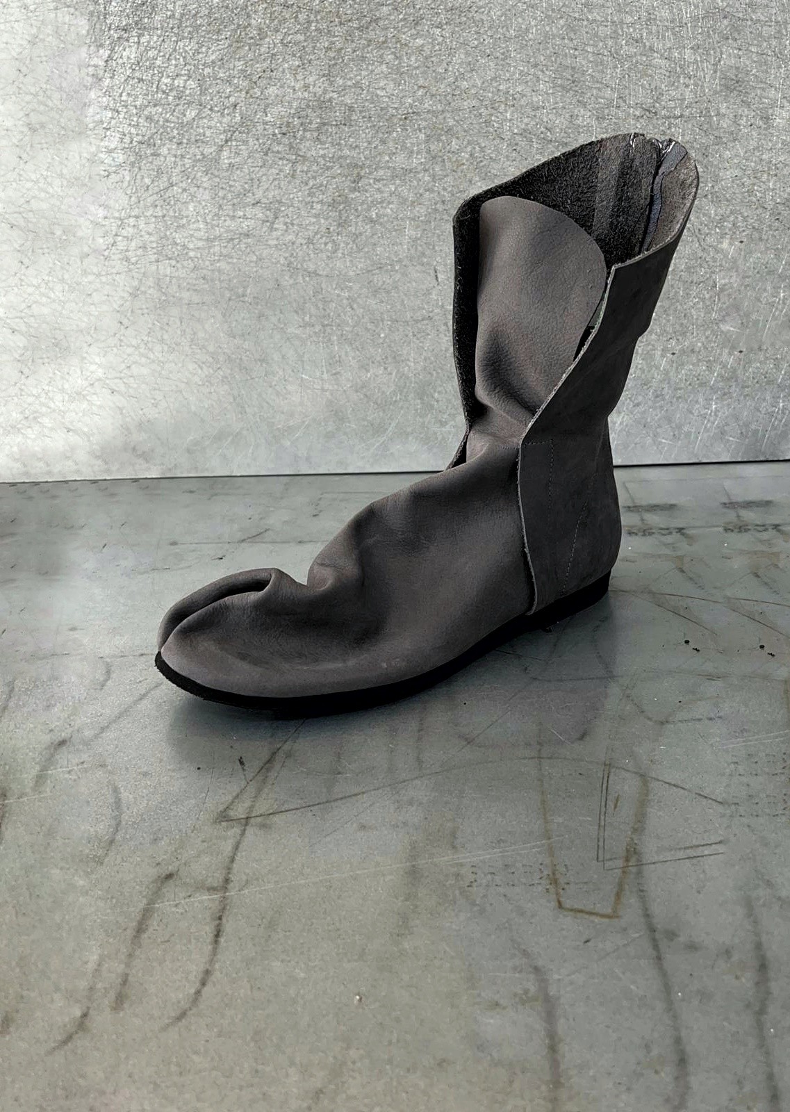 מגף טאבי שטוח לא צמוד לכף הרגל, עם רוכסן מאחור, בגובה מתחת לשוק, 17סמ' - 19 סמ'. דורש גרב טאבי. בתמונה מעור נובוק רך במראה קטיפתי.
