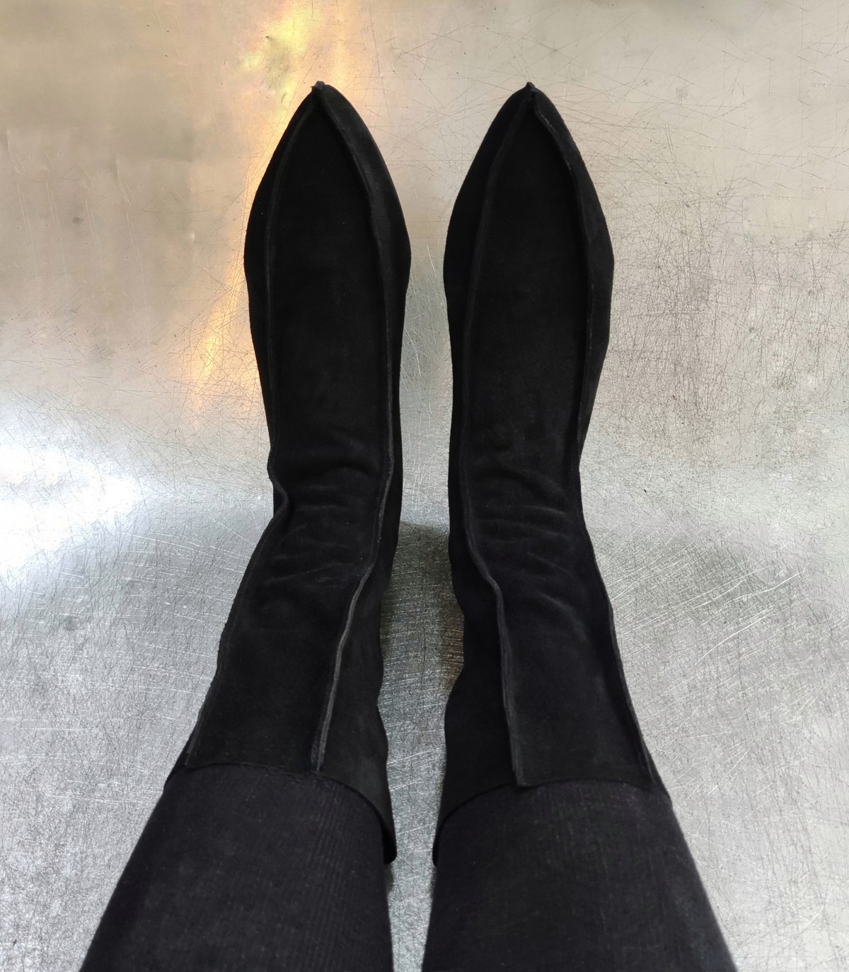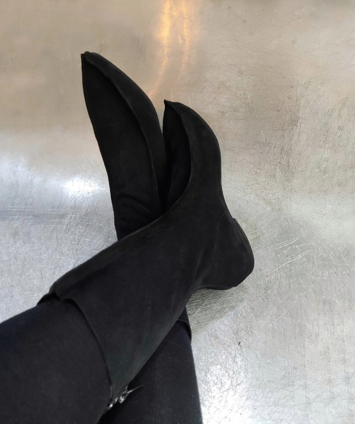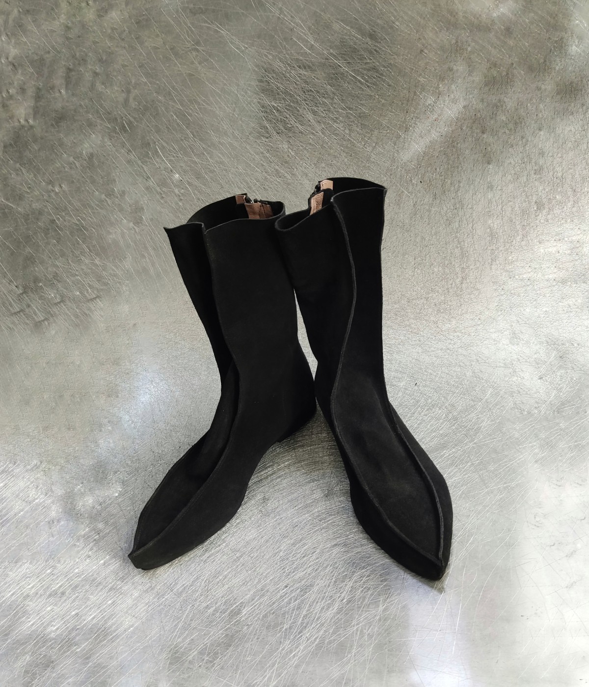 מגף שטוח ושפיצי עם רוכסן מאחור, בגובה שוק 23סמ' - 25 סמ' מאחור. בתמונה מזמש שחור, אפשר להזמין גם עור רגיל.