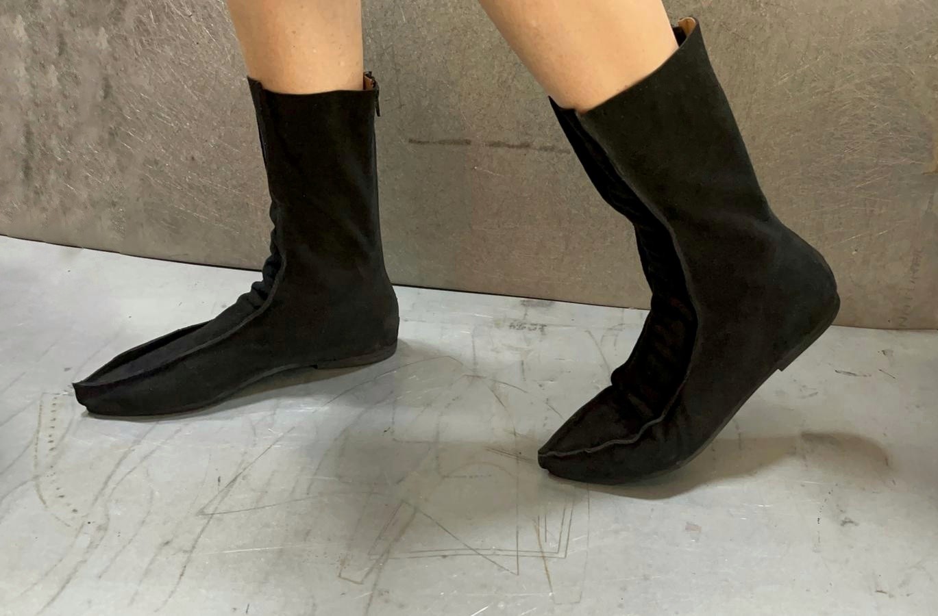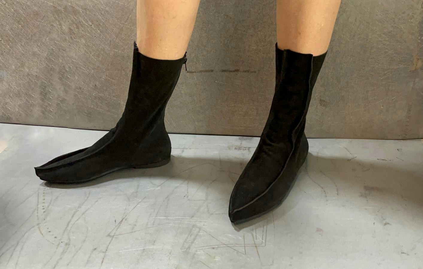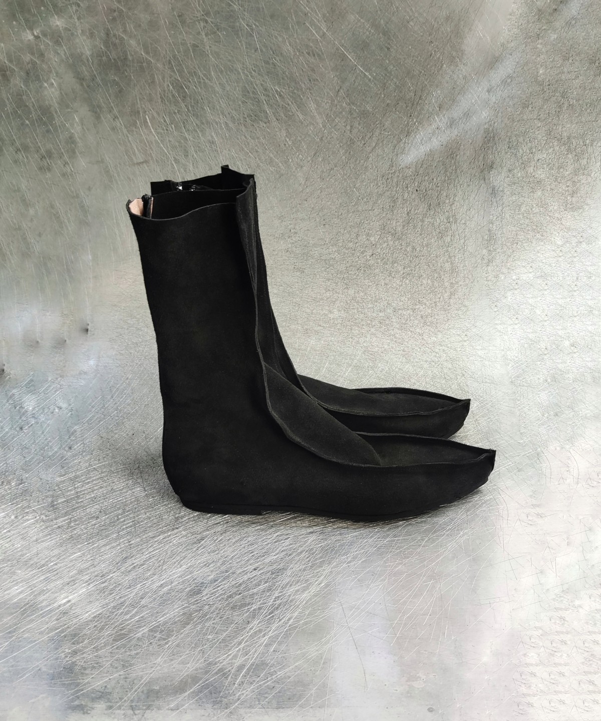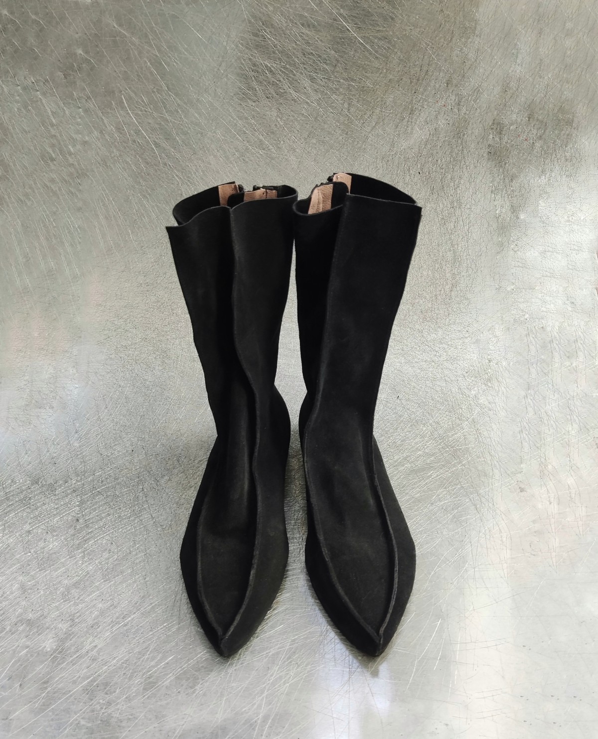 מגף שטוח ושפיצי עם רוכסן מאחור, בגובה שוק 23סמ' - 25 סמ' מאחור. בתמונה מזמש שחור, אפשר להזמין גם עור רגיל.