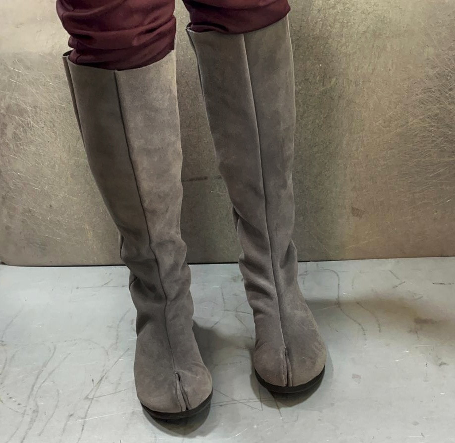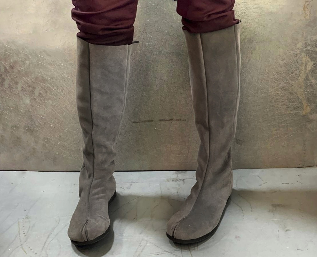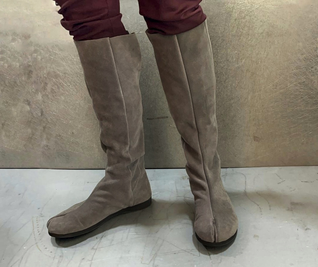 מגף טאבי (הפרדה בין הבוהן לשאר האצבעות, דורש גרב טאבי) שטוח בגובה הברך, ללא סגירה או רכיסה, מיוצר על פי מידותייך (היקף, גובה), מעורות רכים בלבד. בתמונ מגף בגובה 40 סמ'. גובה הדוגמנית 1.74.