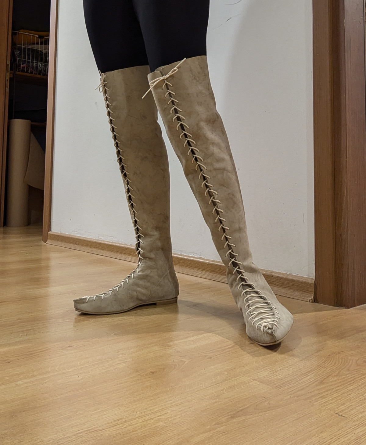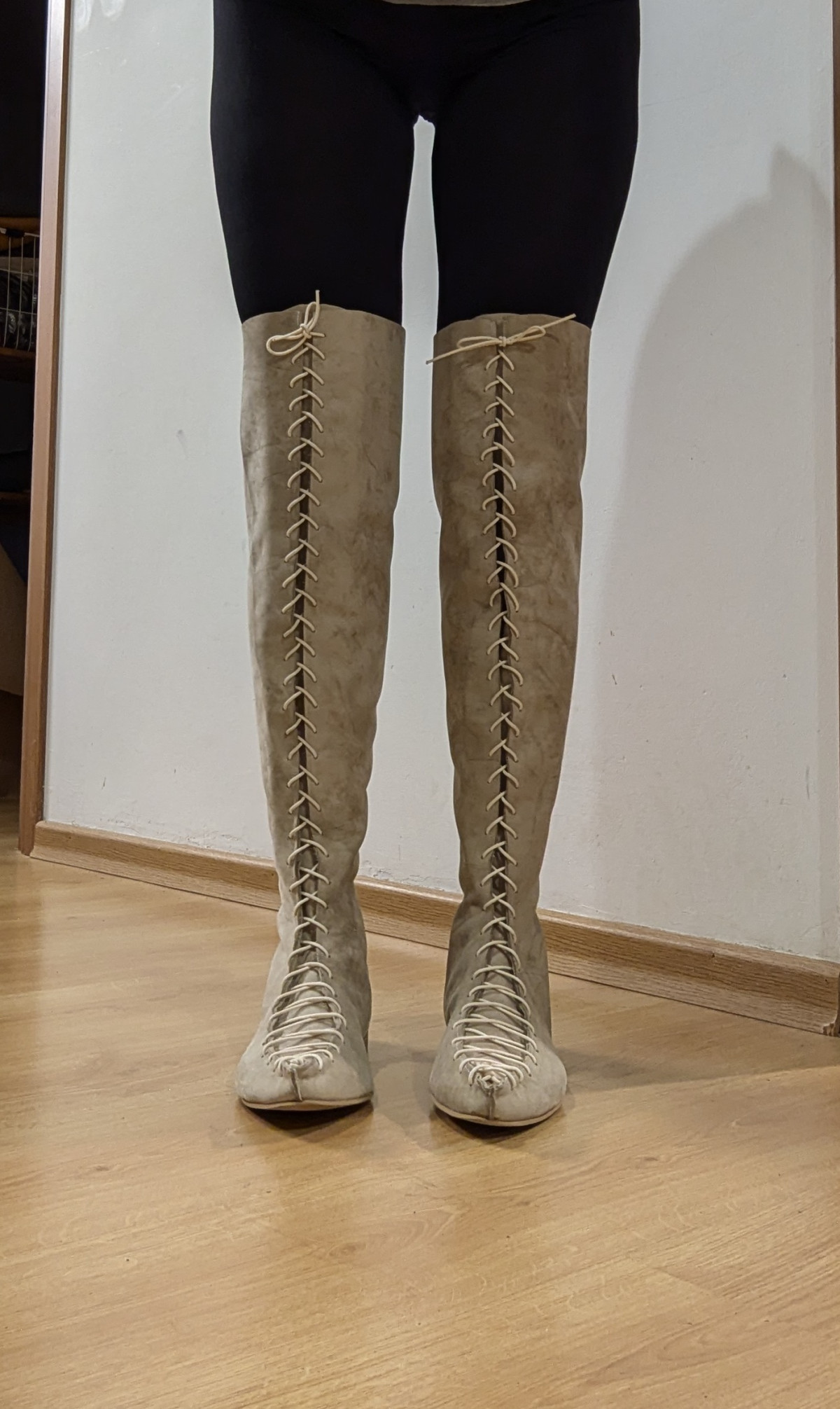 מגפון שטוח בגובה מעל הברך עם שרוכים שמאפשרים התאמת רוחב (מתאים גם לרגליים צרות ורחבות), בתוספת רוכסן מאחור. הגובה מותאם אישית. המגף שבתמונה הוא באורך 62 סמ', החלק הפתוח שמעל הברך הוא באורך 14 סמ'. גובה הדוגמנית 1.74.