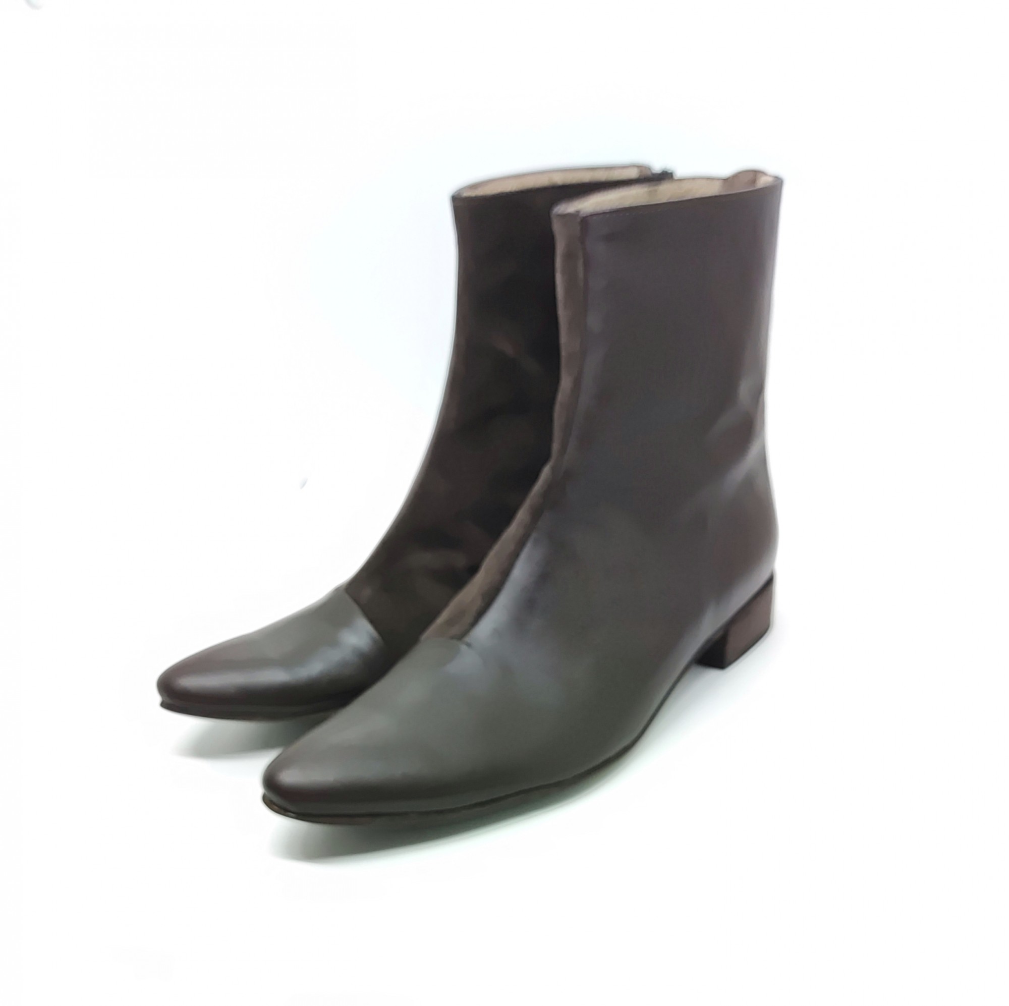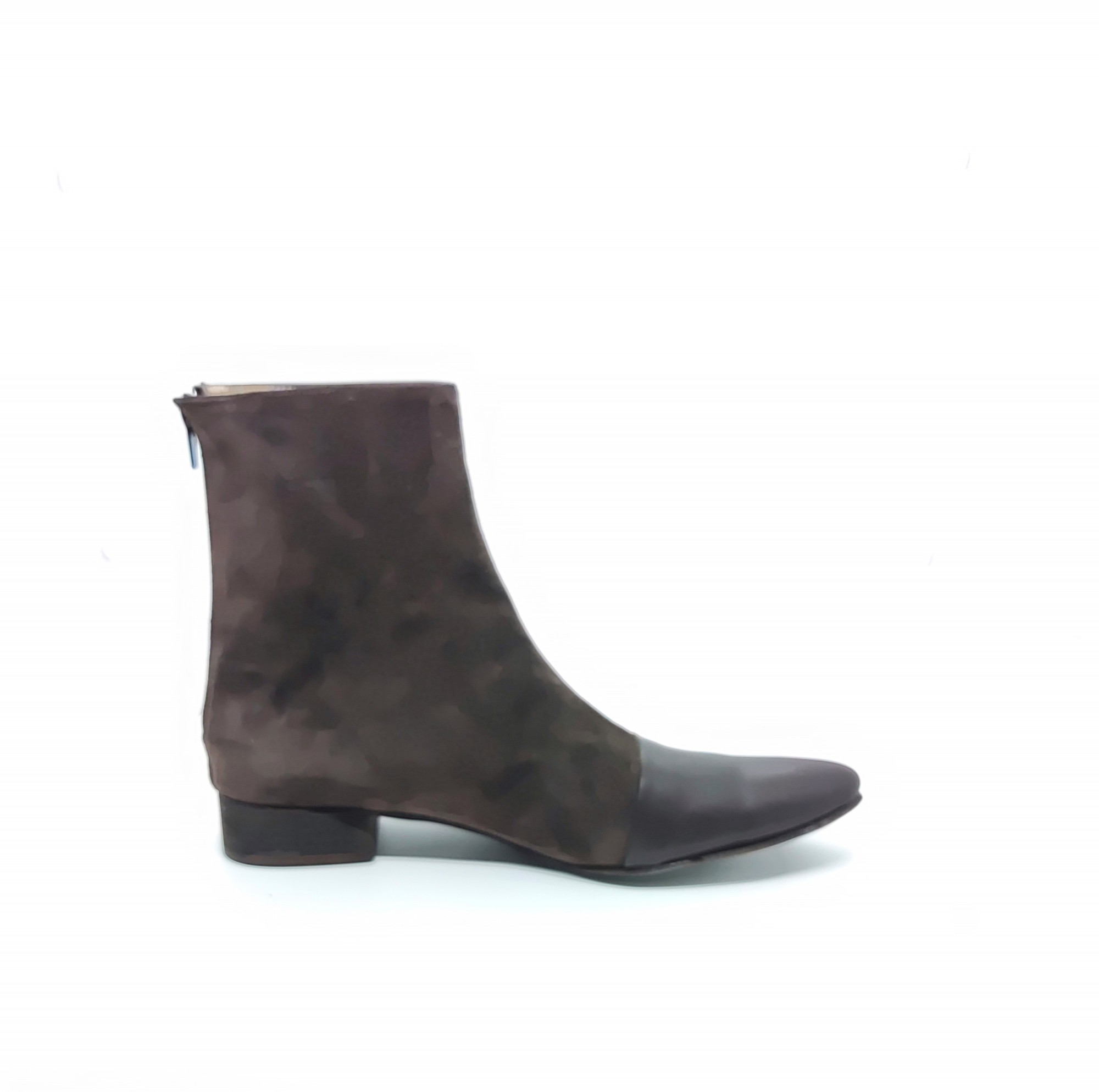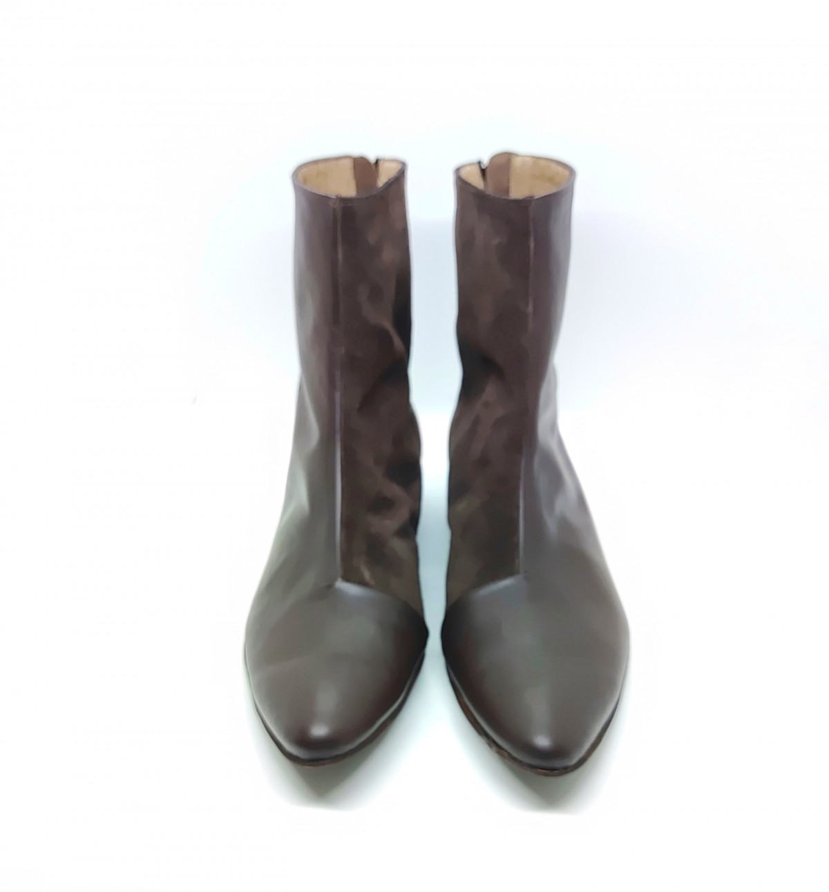 מגפון מעור בשני גוונים (נאפה עם ברק ונובוק ומט), רוכסן מאחור, גובה מהסוליה (ללא העקב) לקצה הרוכסן 16.5 סמ'- 18 סמ'. גובה עקב 2.5 סמ'.