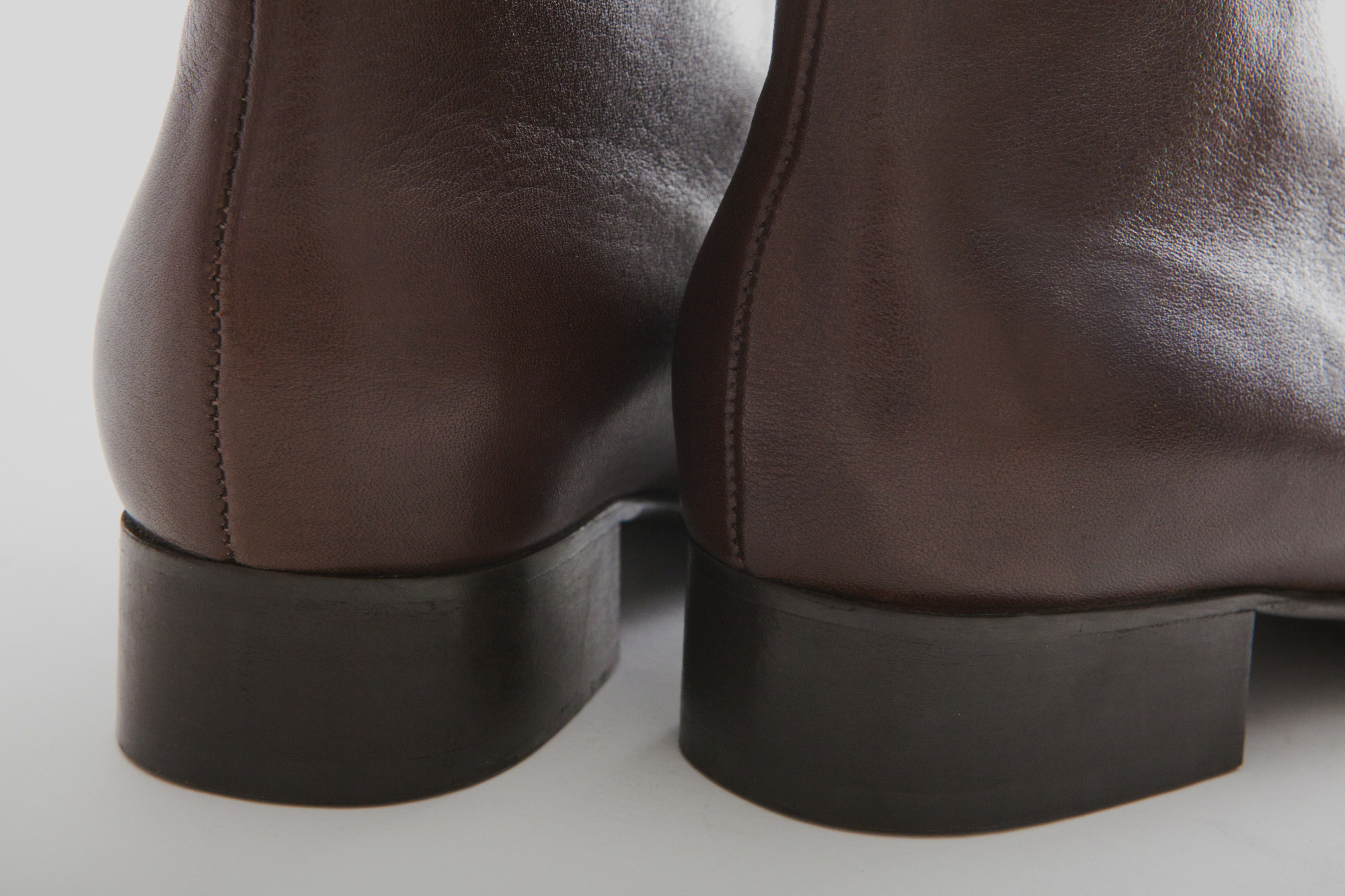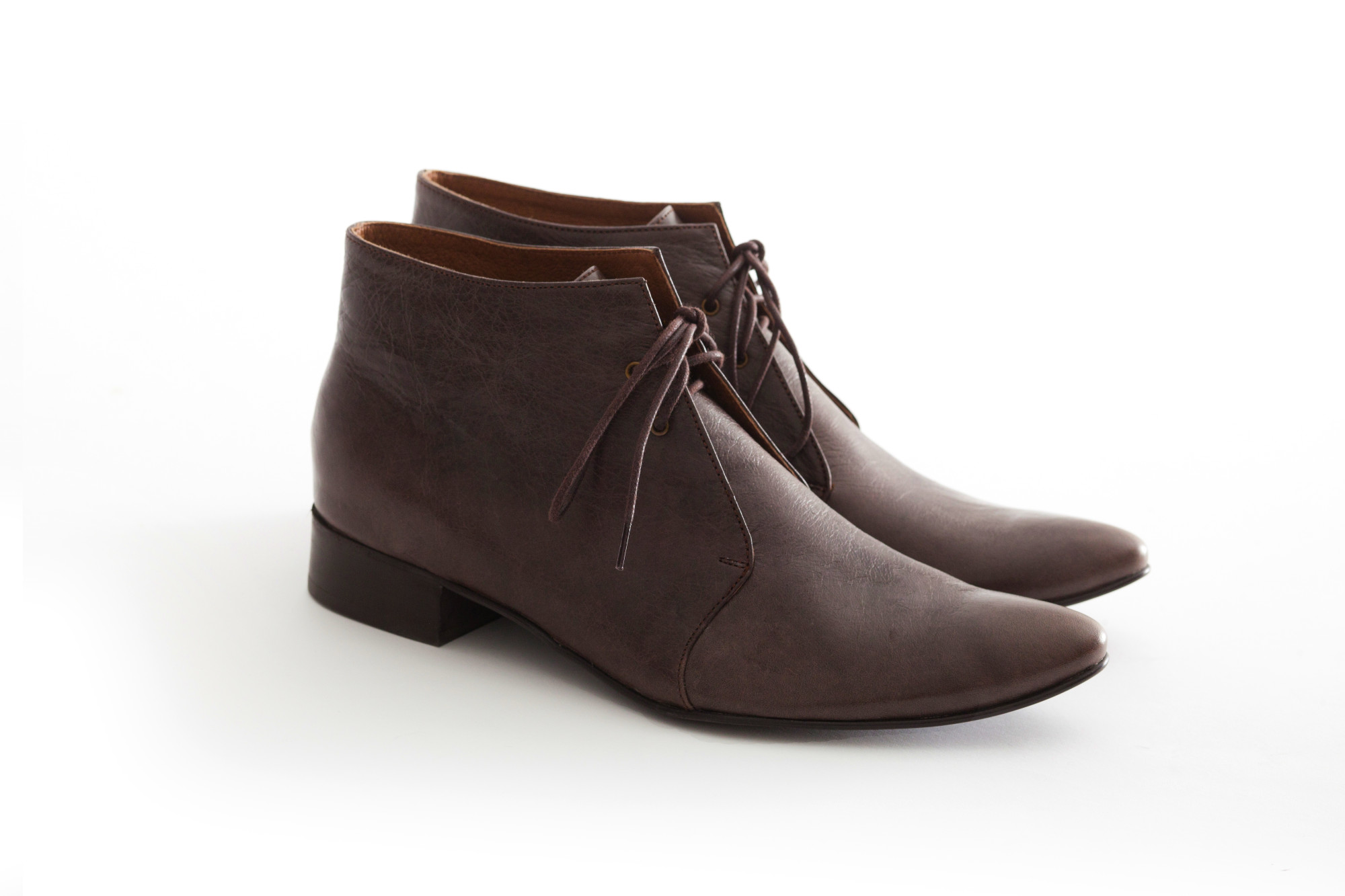 נעל גבוהה/מגפון עם שרוכים, גובה המגפון 11סמ' - 12סמ'. עקב בגובה עקב 2.5 סמ'. עור נאפה עם ברק עדין.