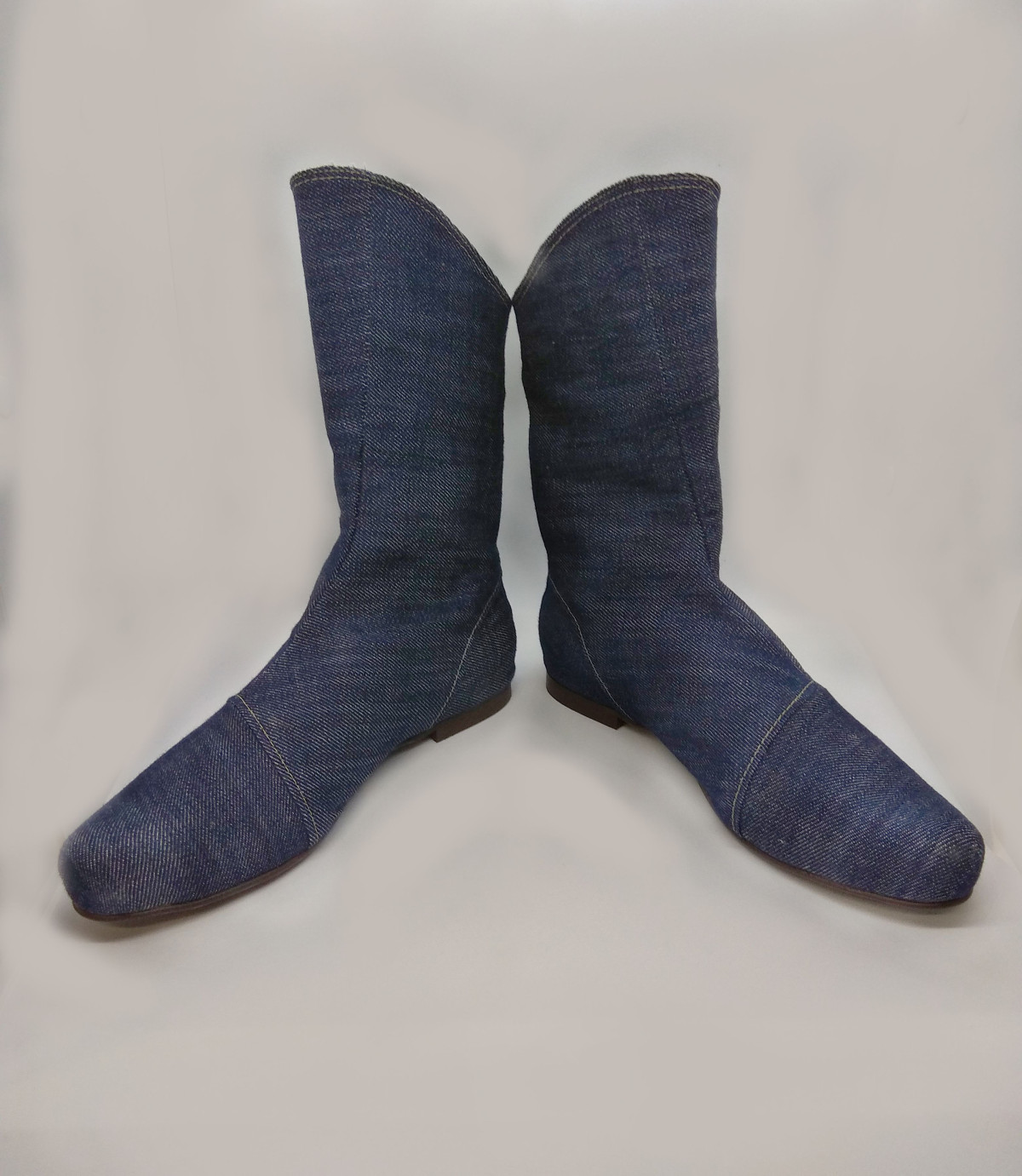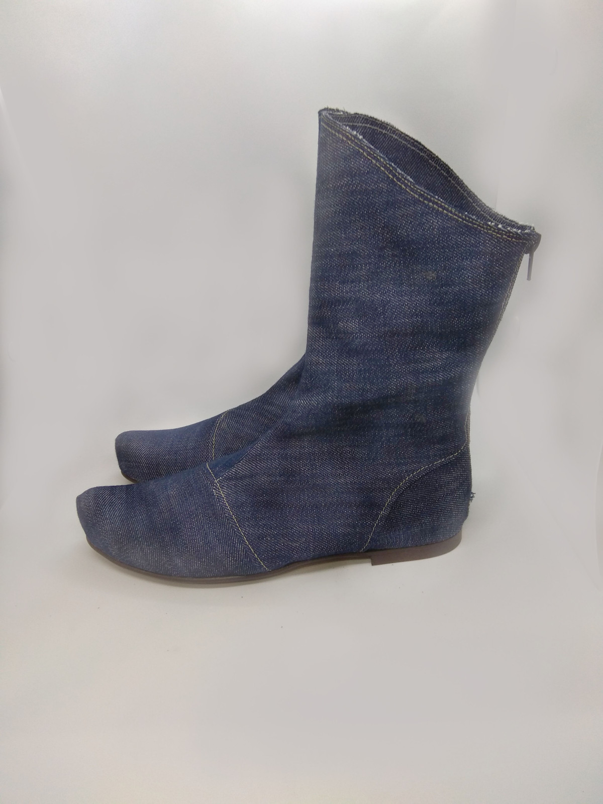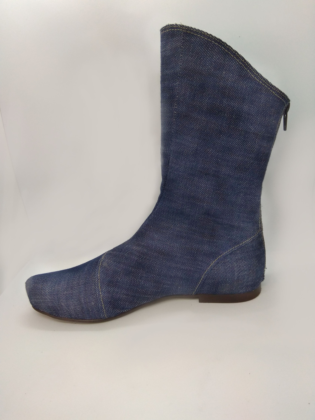 מגף שטוח, בגובה אמצע השוק, עשוי מבד ג'ינס, רוכסן מאחור.