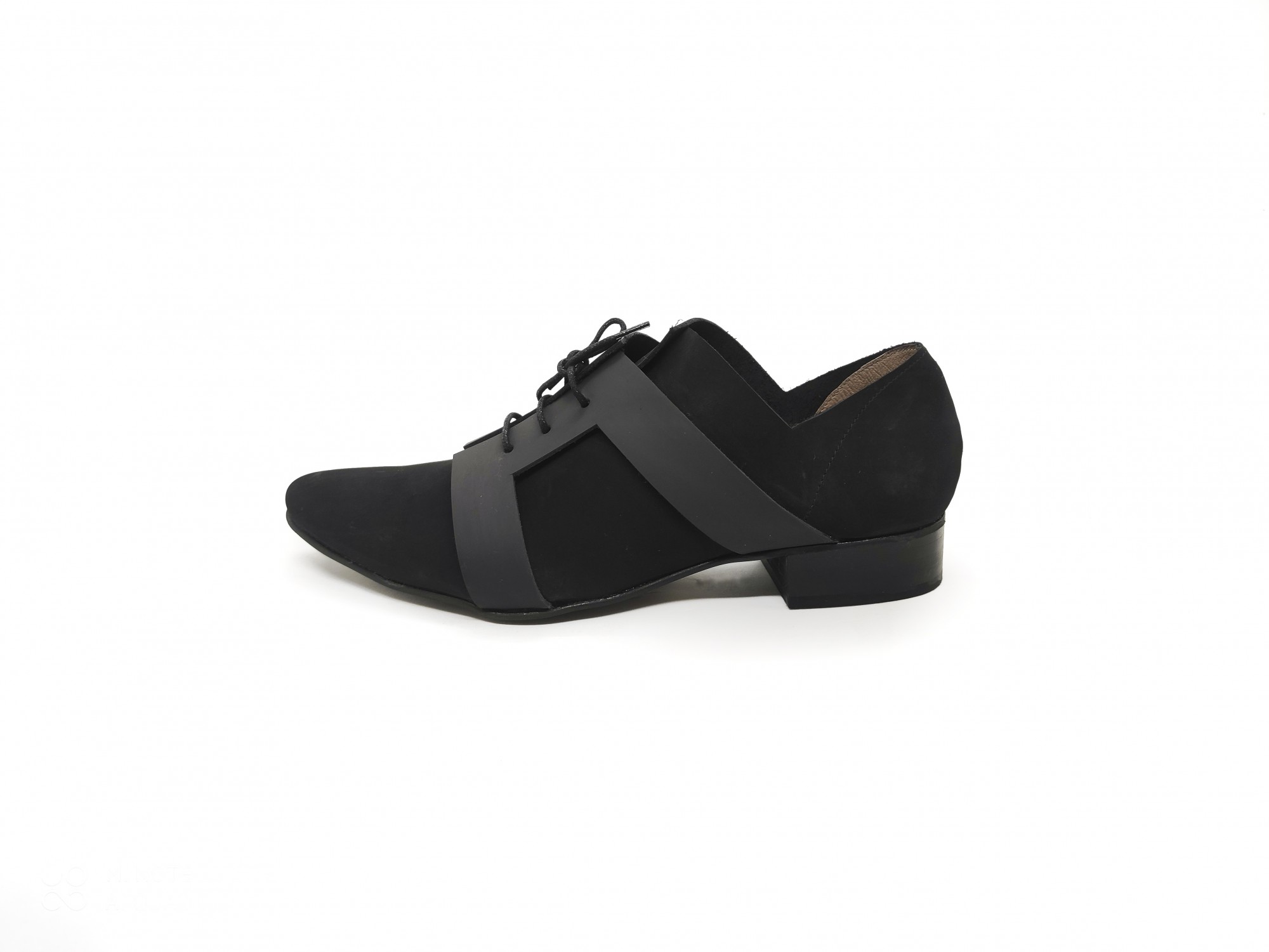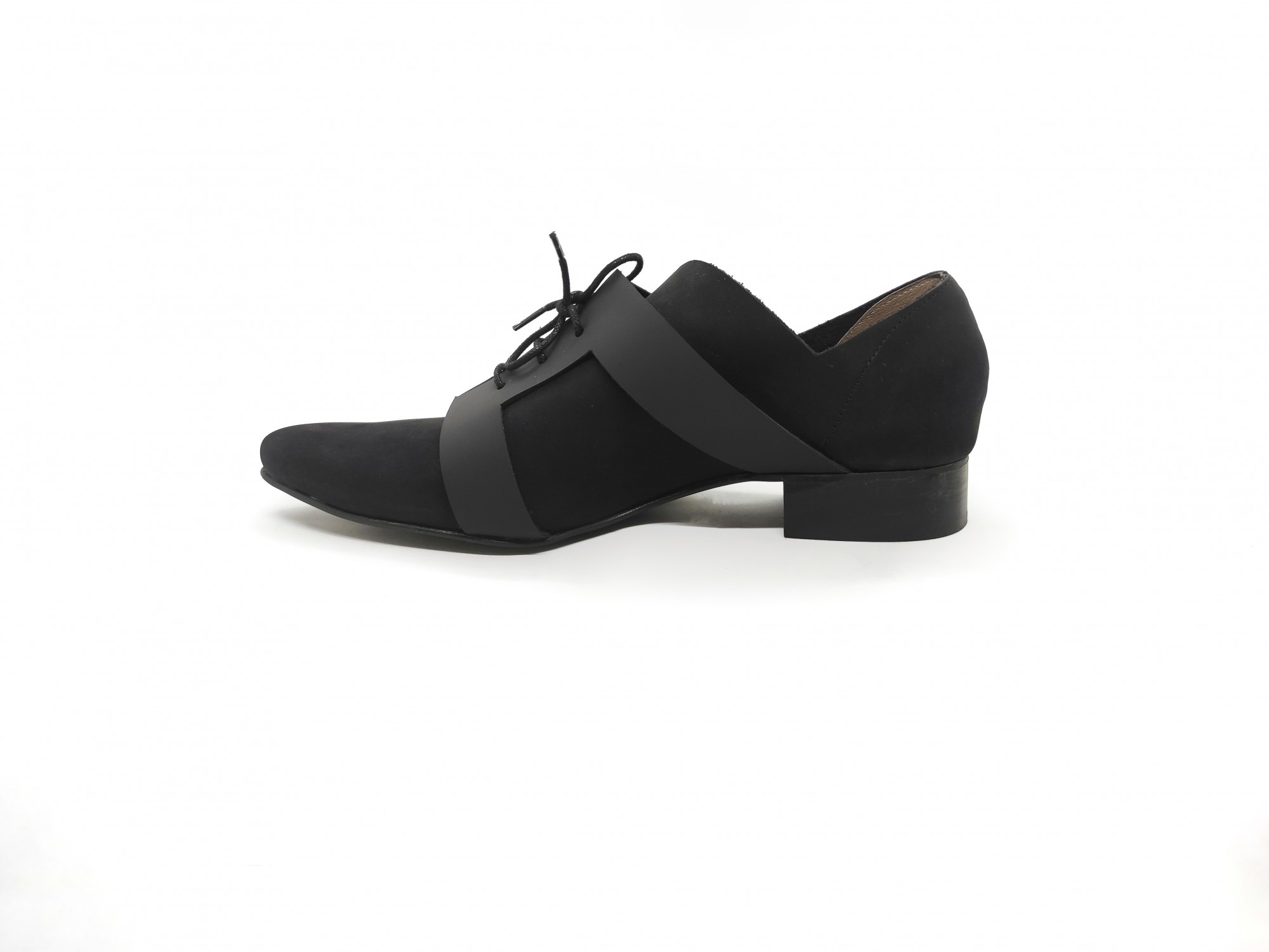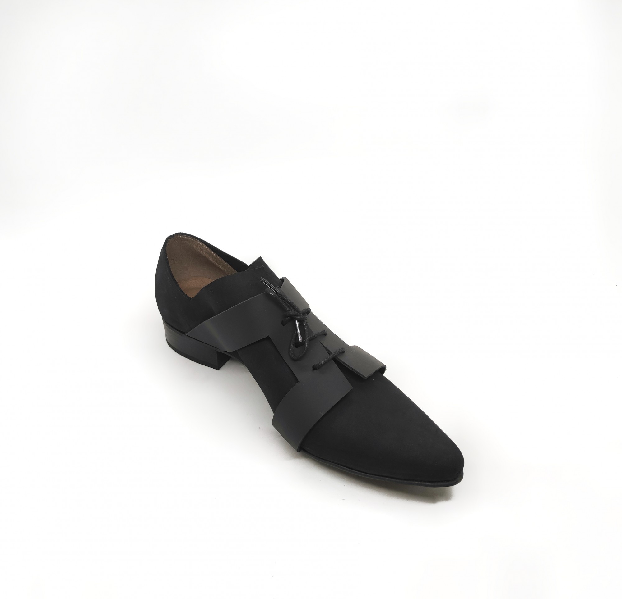 נעל בשילוב של שני סוגי עור שחורים, עם אלמנט שריכה גאומטרי, גובה עקב 2.5 סמ'.