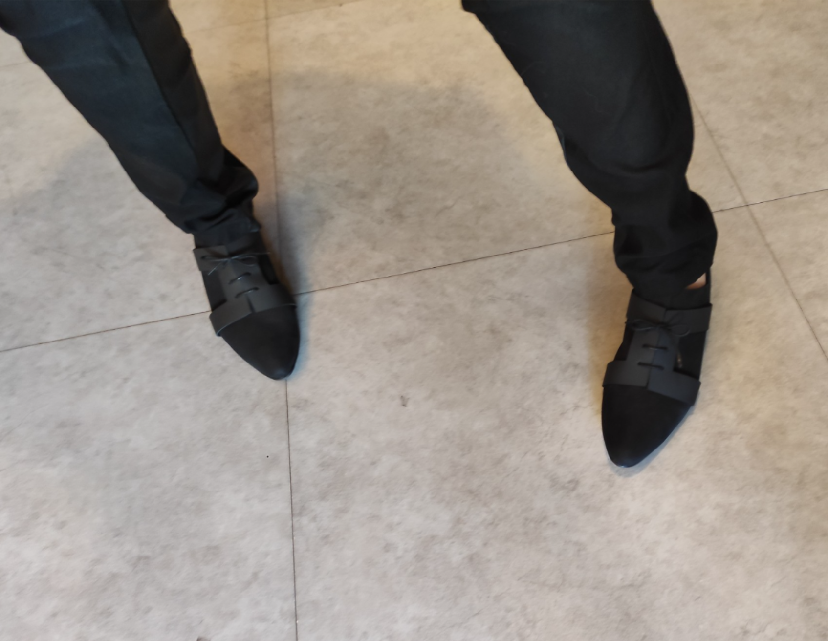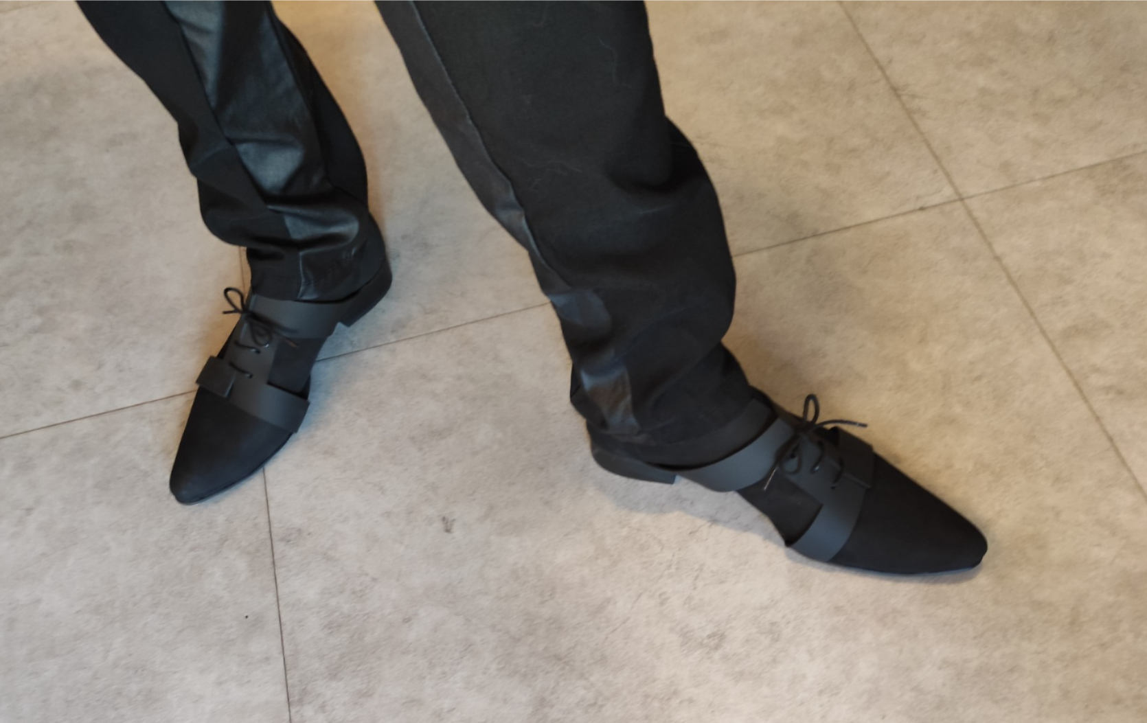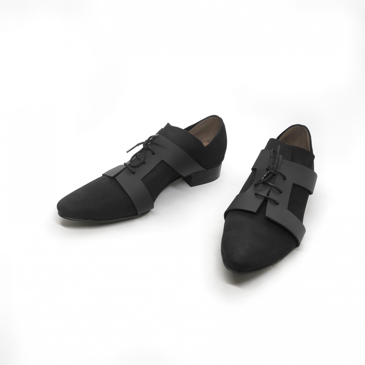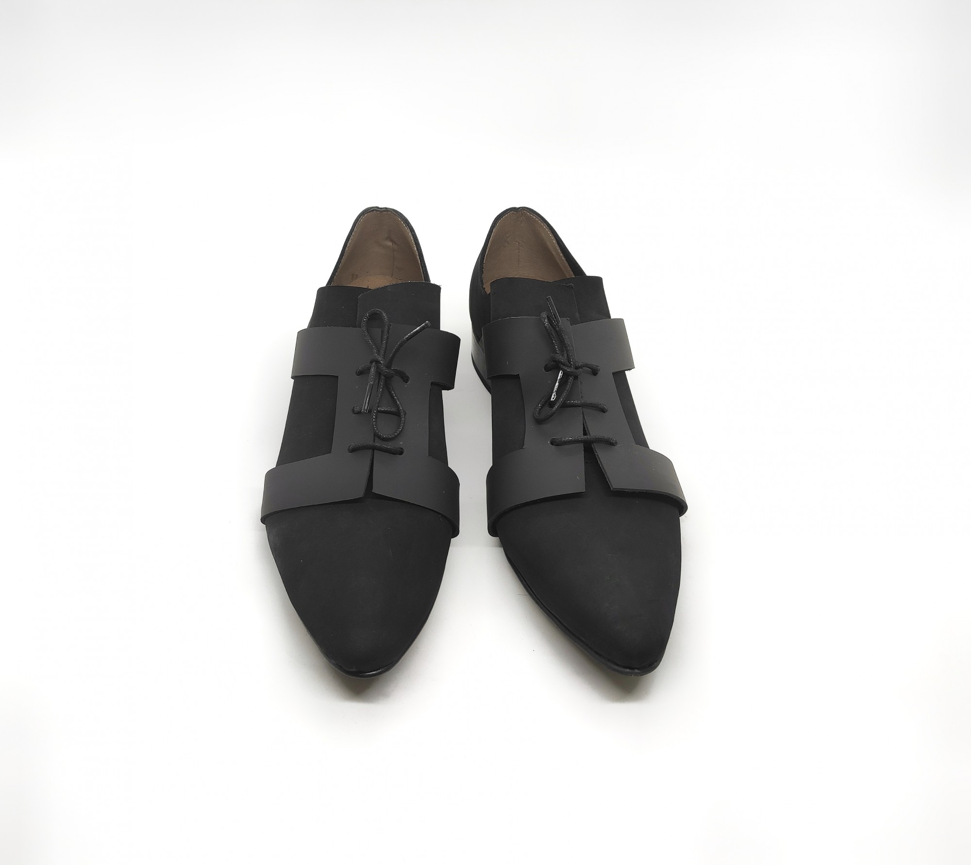 נעל בשילוב של שני סוגי עור שחורים, עם אלמנט שריכה גאומטרי, גובה עקב 2.5 סמ'.