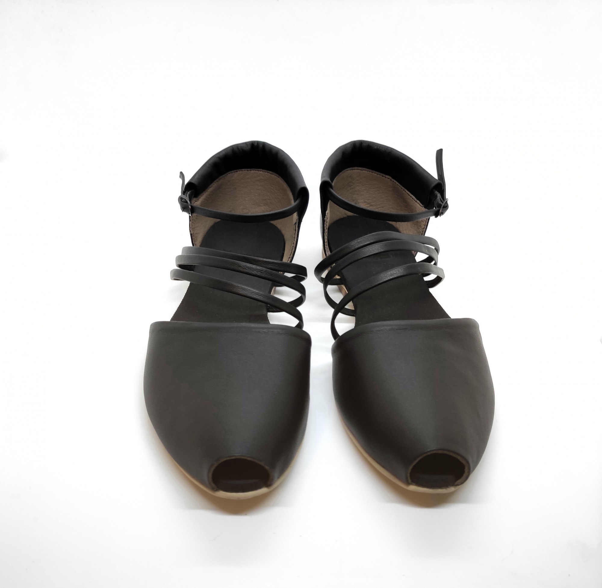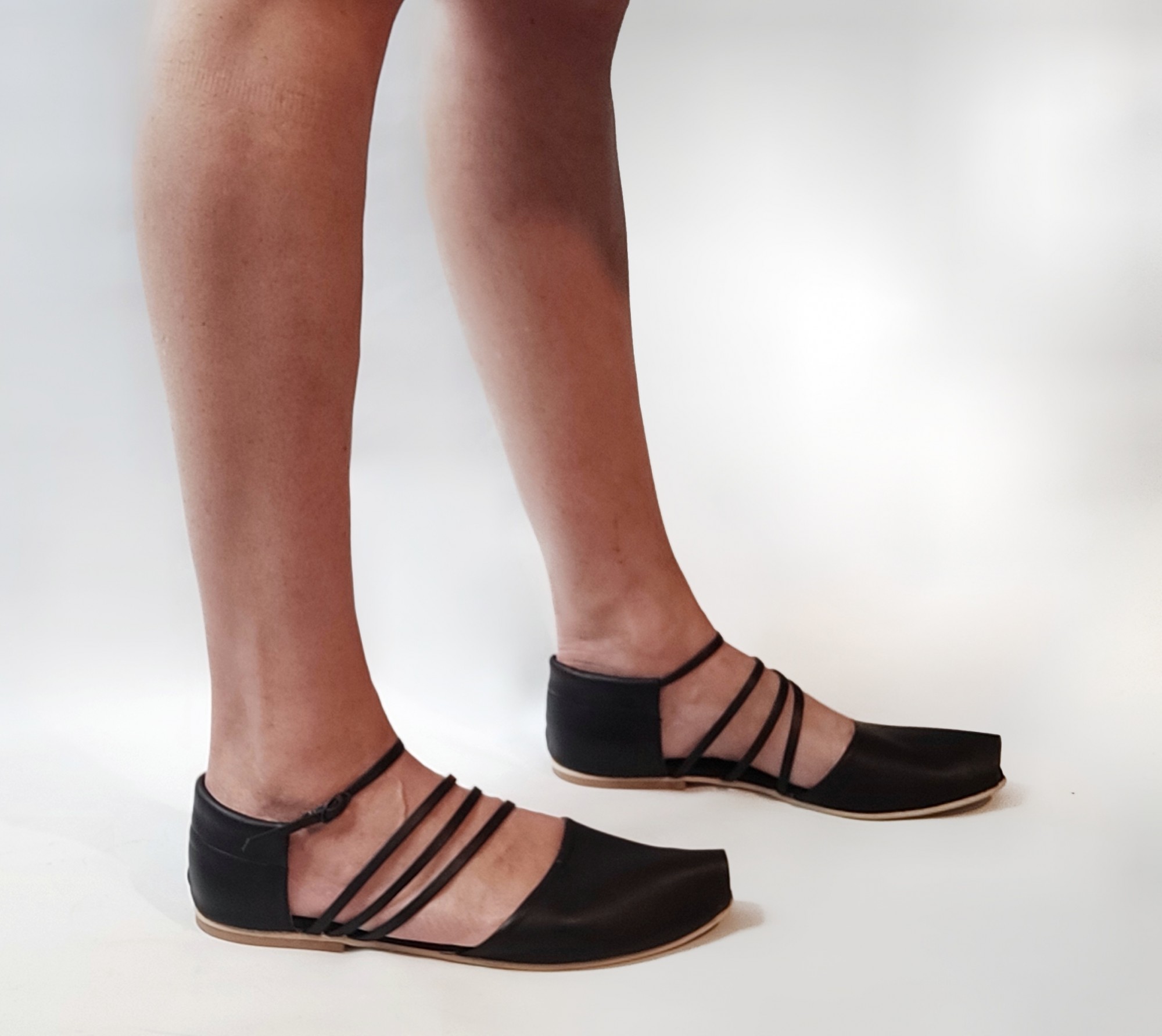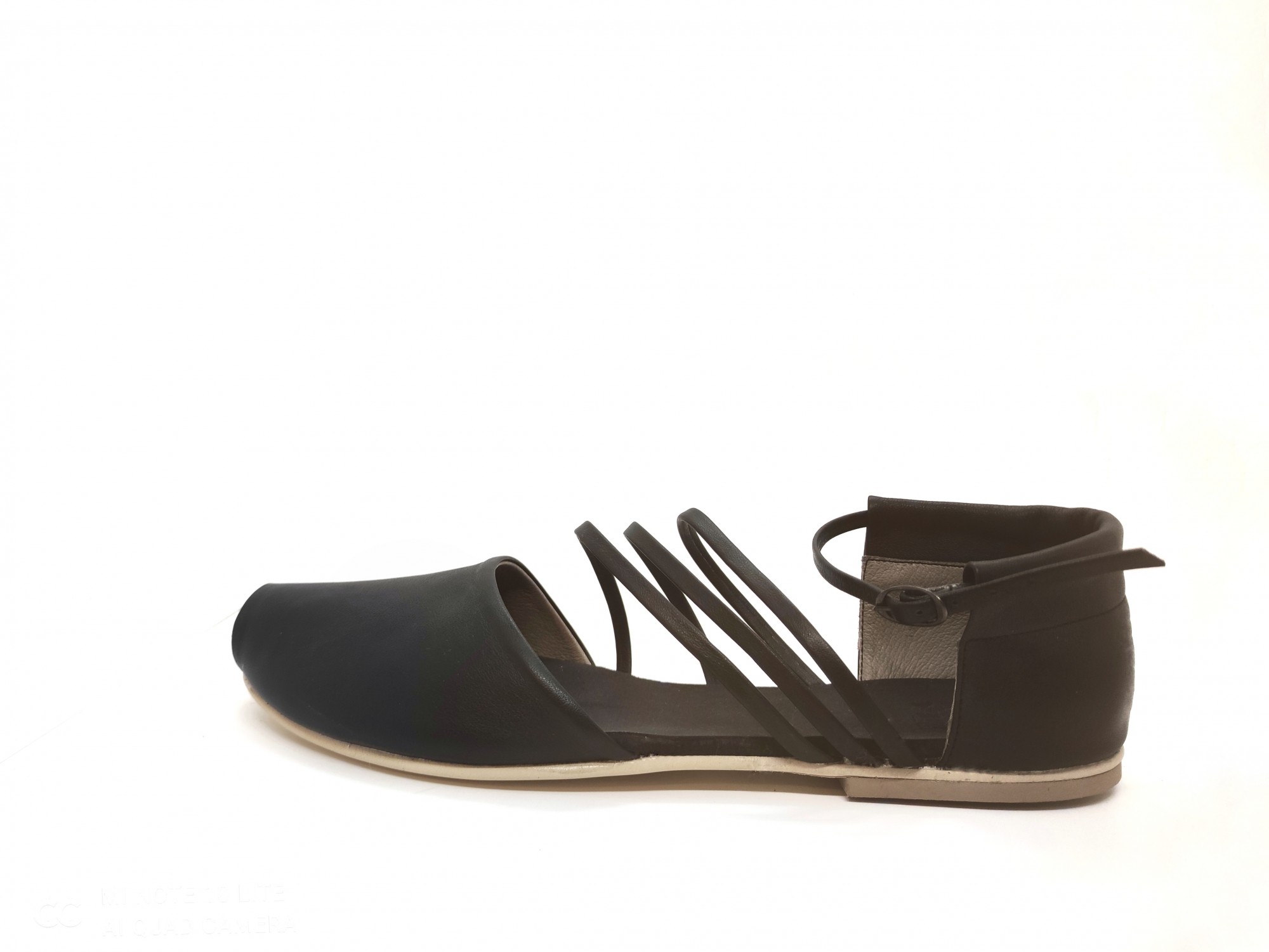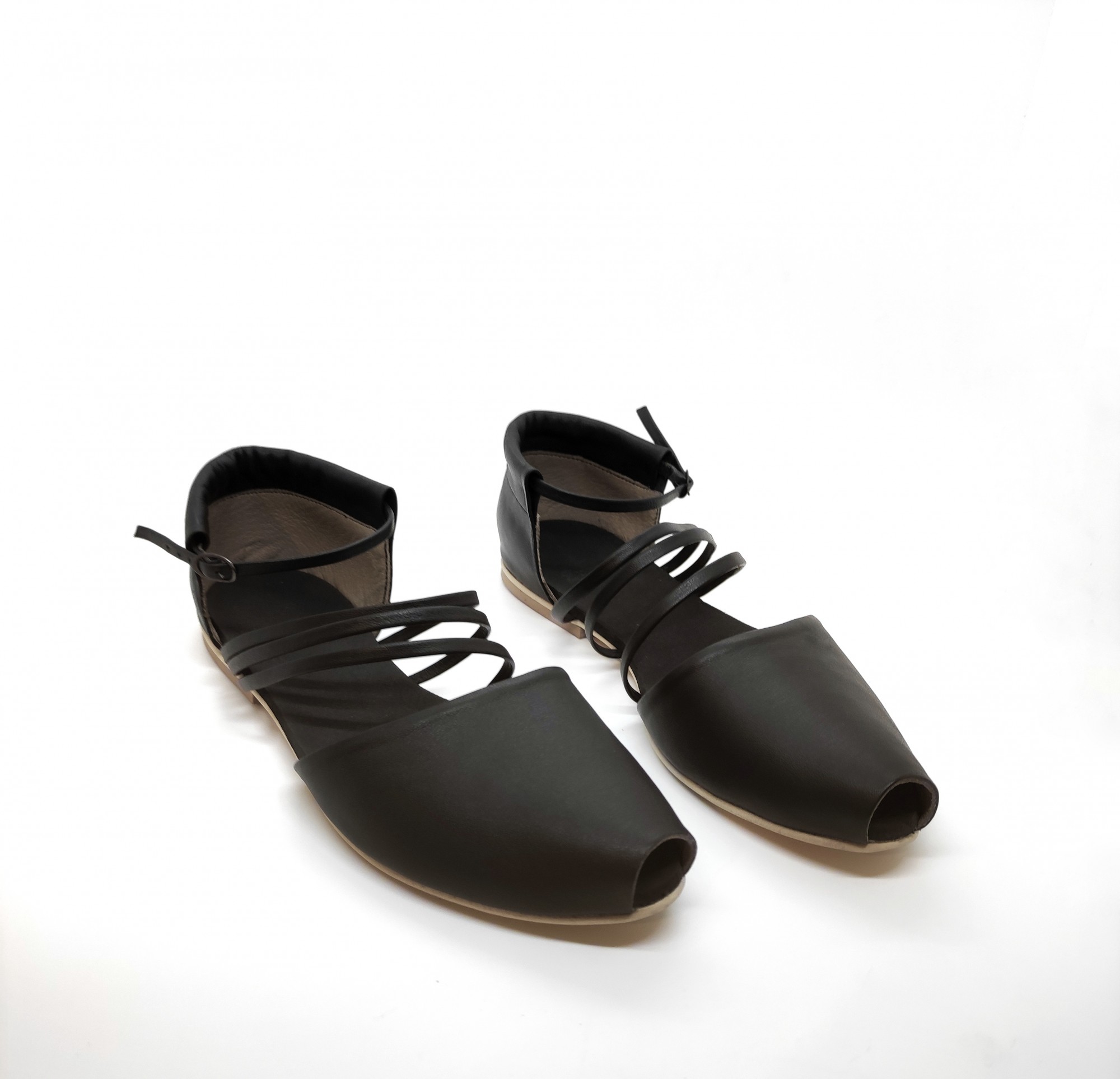 נעל שטוחה עם קצה פתוח - לא רואים בהונות. נסגרת באמצעות רצועה עם אבזם. רפידת ספוג גומי.
