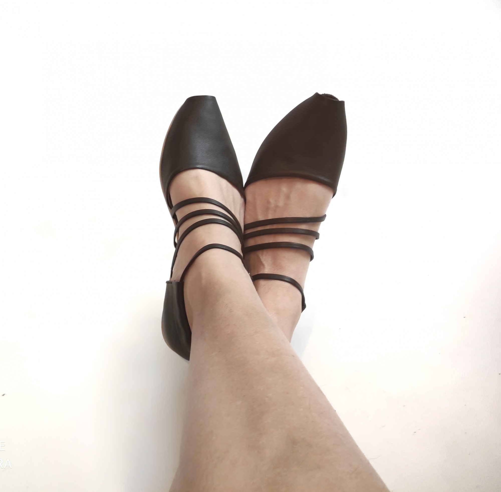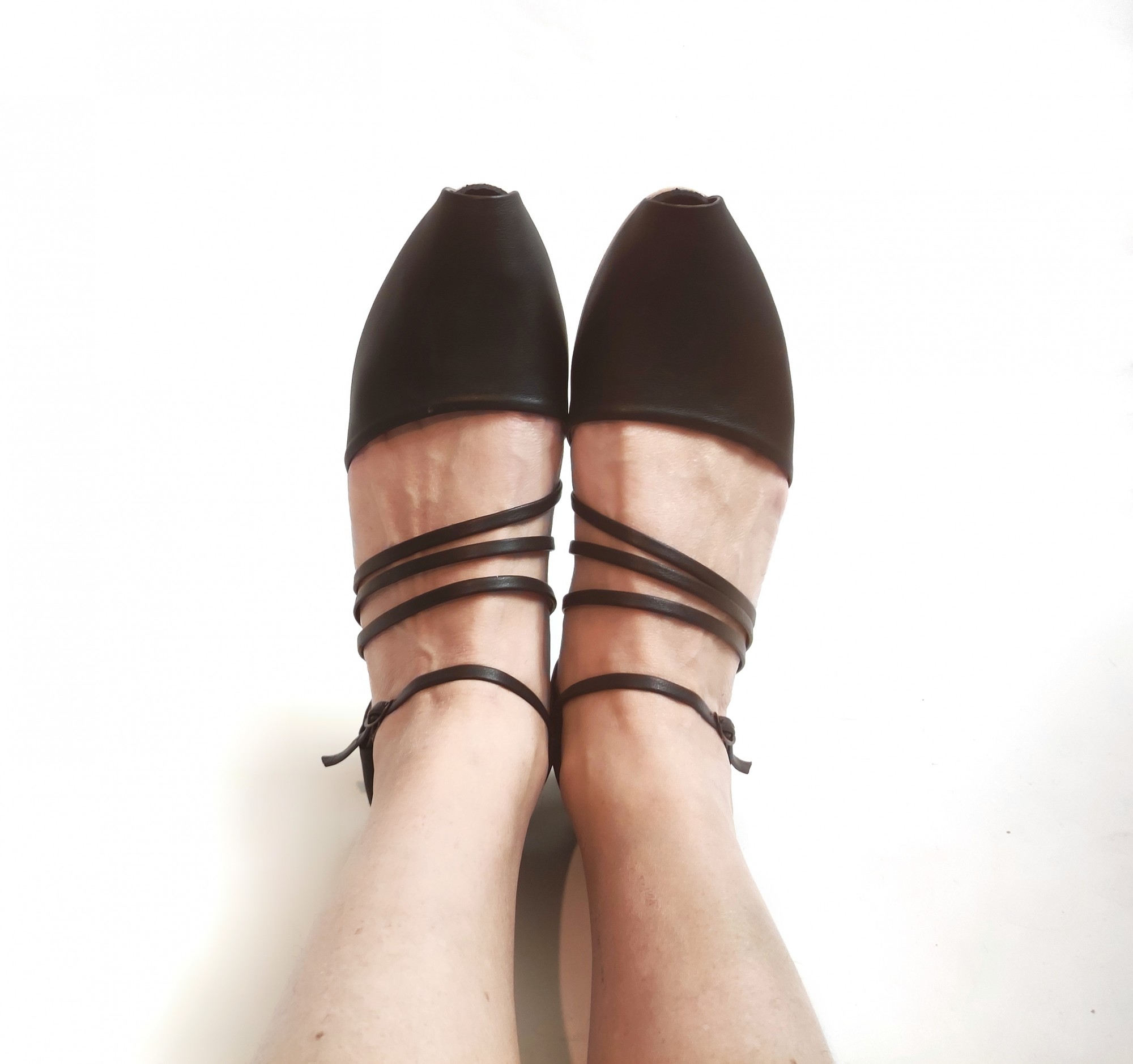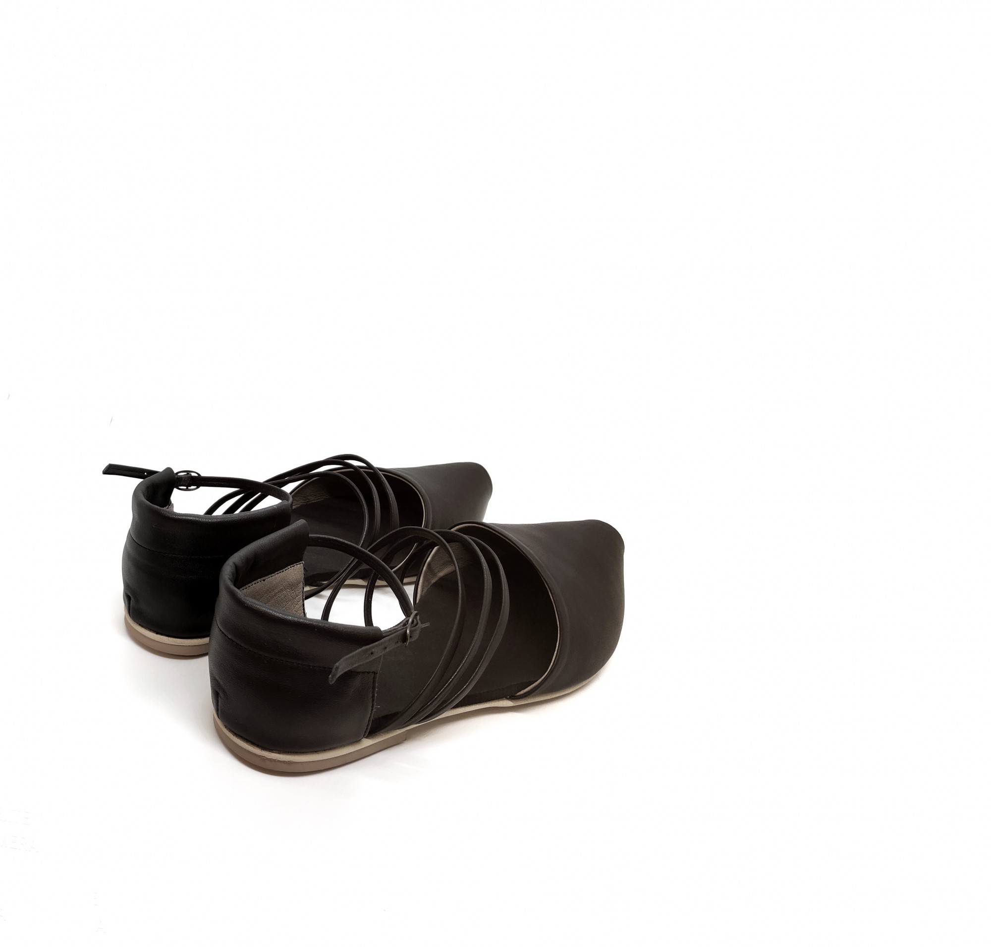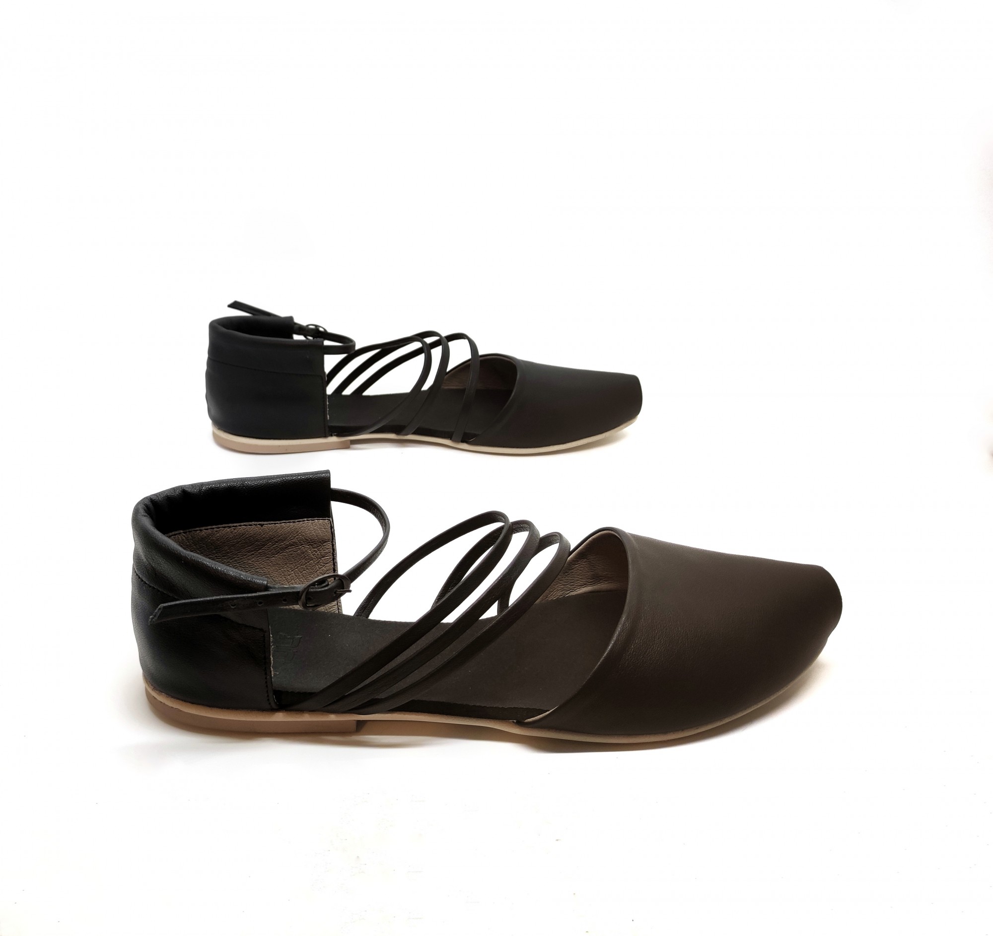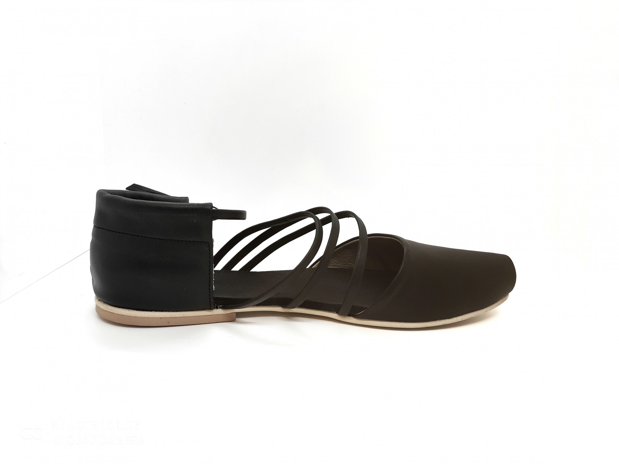 נעל שטוחה עם קצה פתוח - לא רואים בהונות. נסגרת באמצעות רצועה עם אבזם. רפידת ספוג גומי.