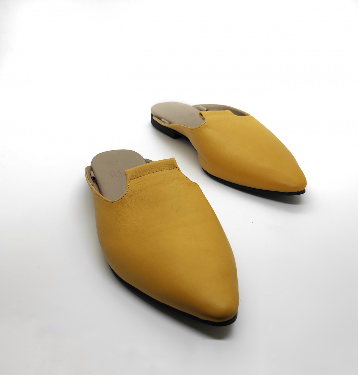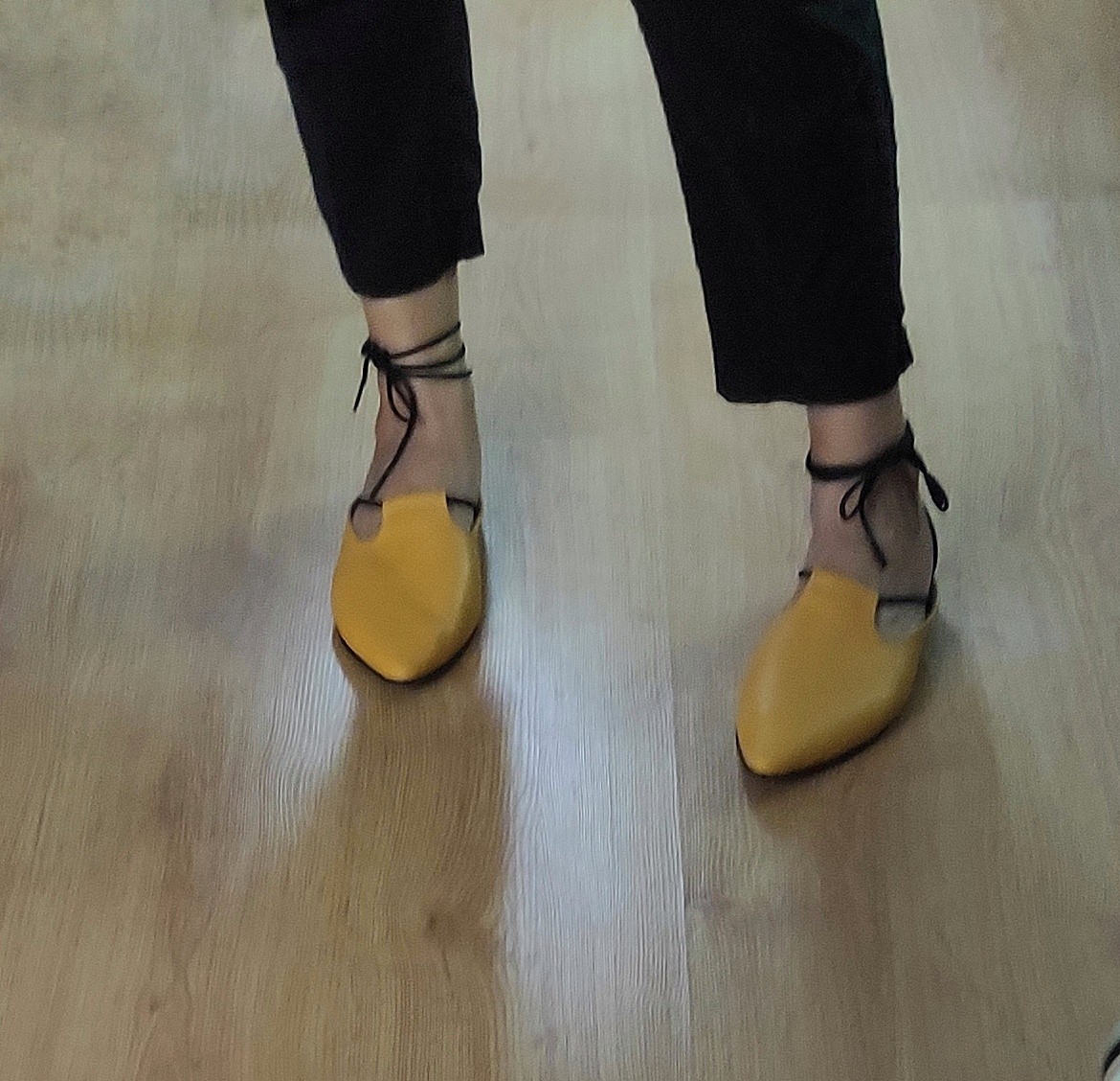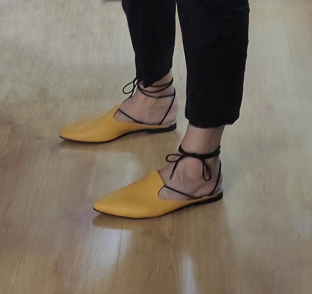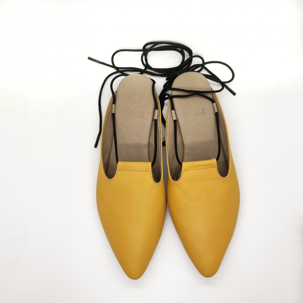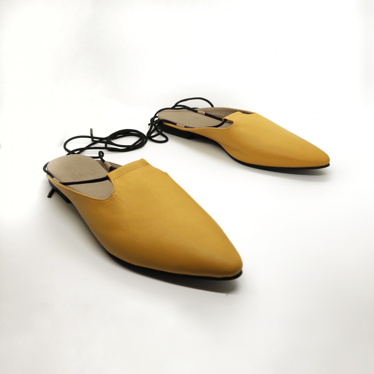 כפכף שטוח, ניתן לנעול עם או בלי שרוכים, שפיץ מתון. רפידת לטקס מצופה עור.