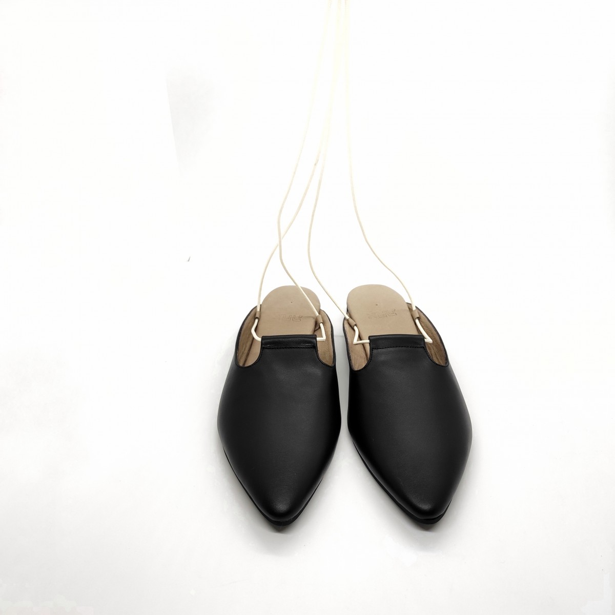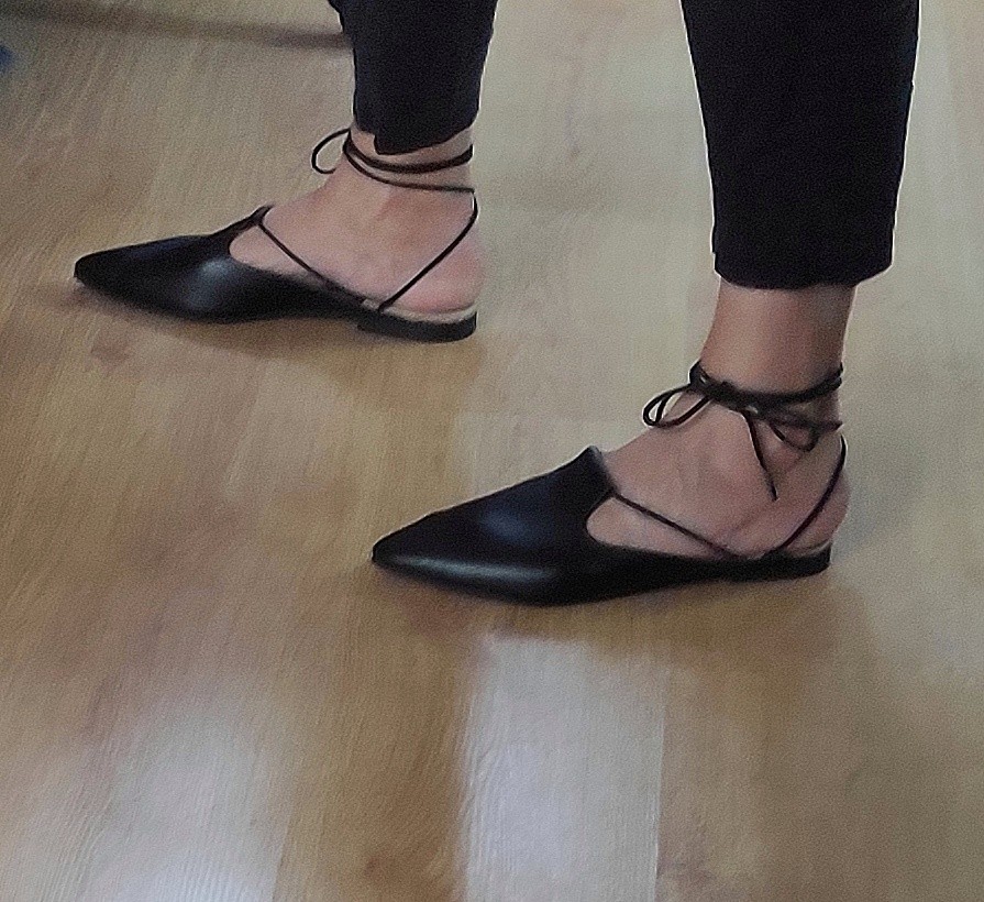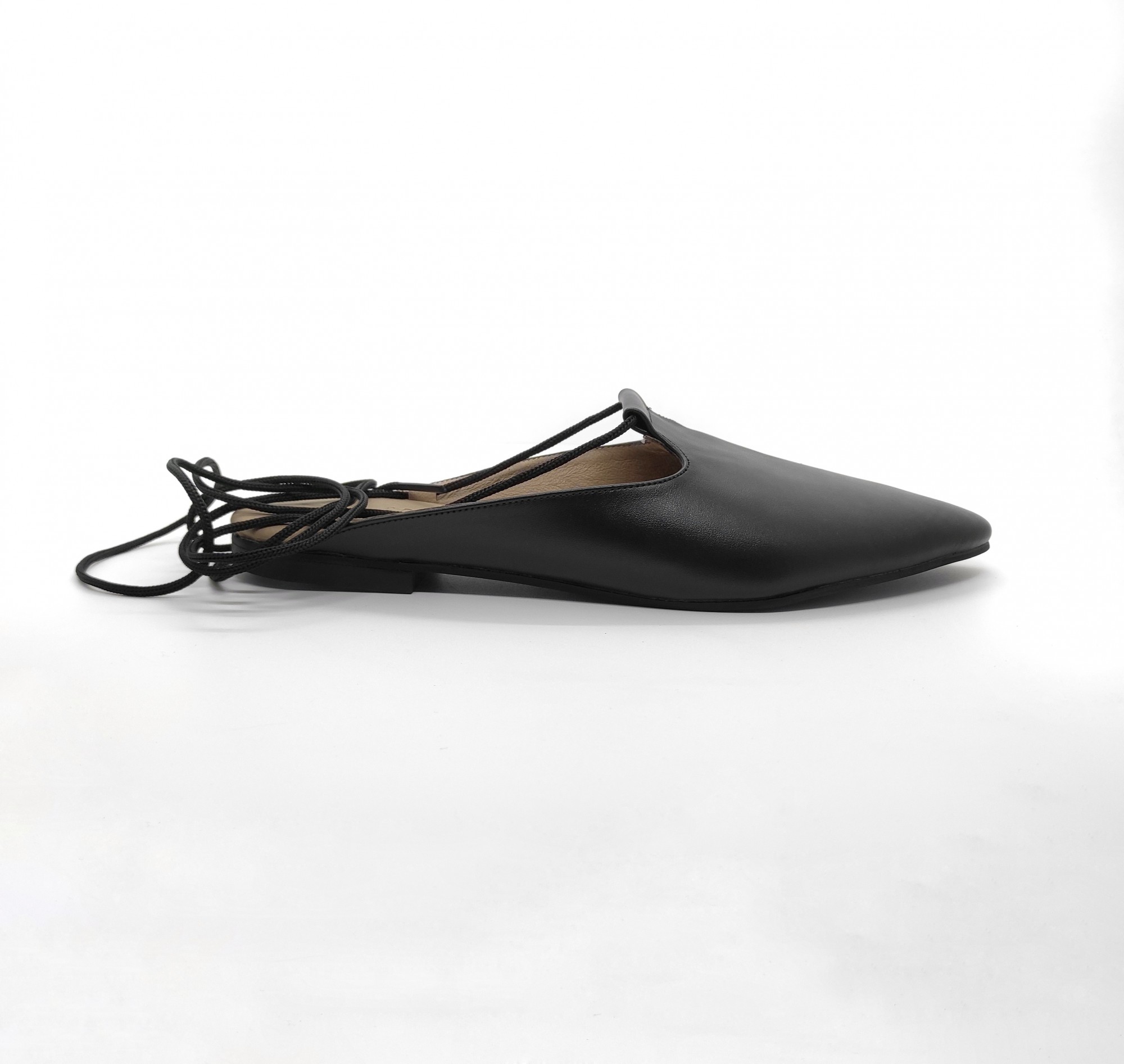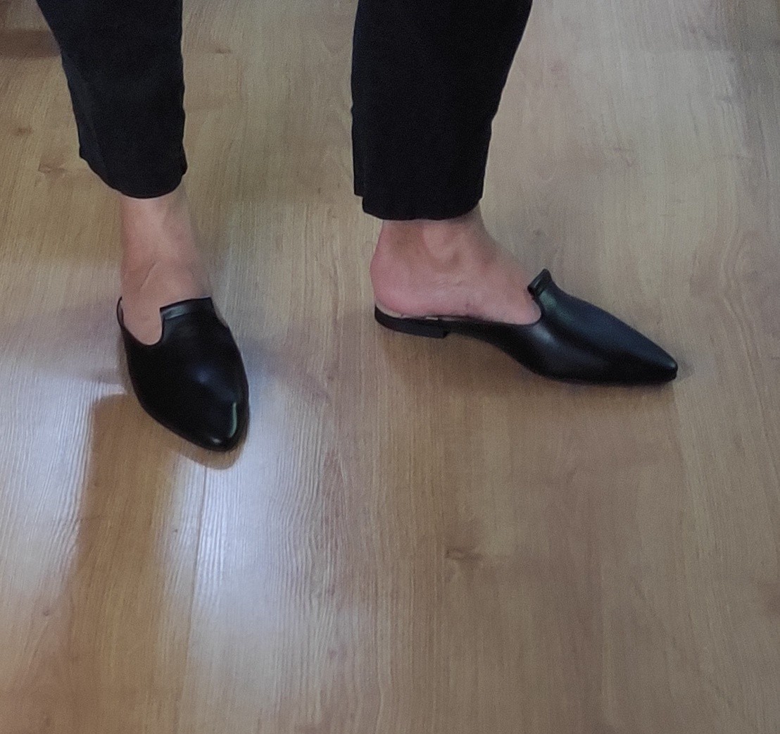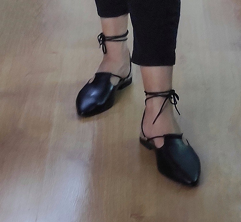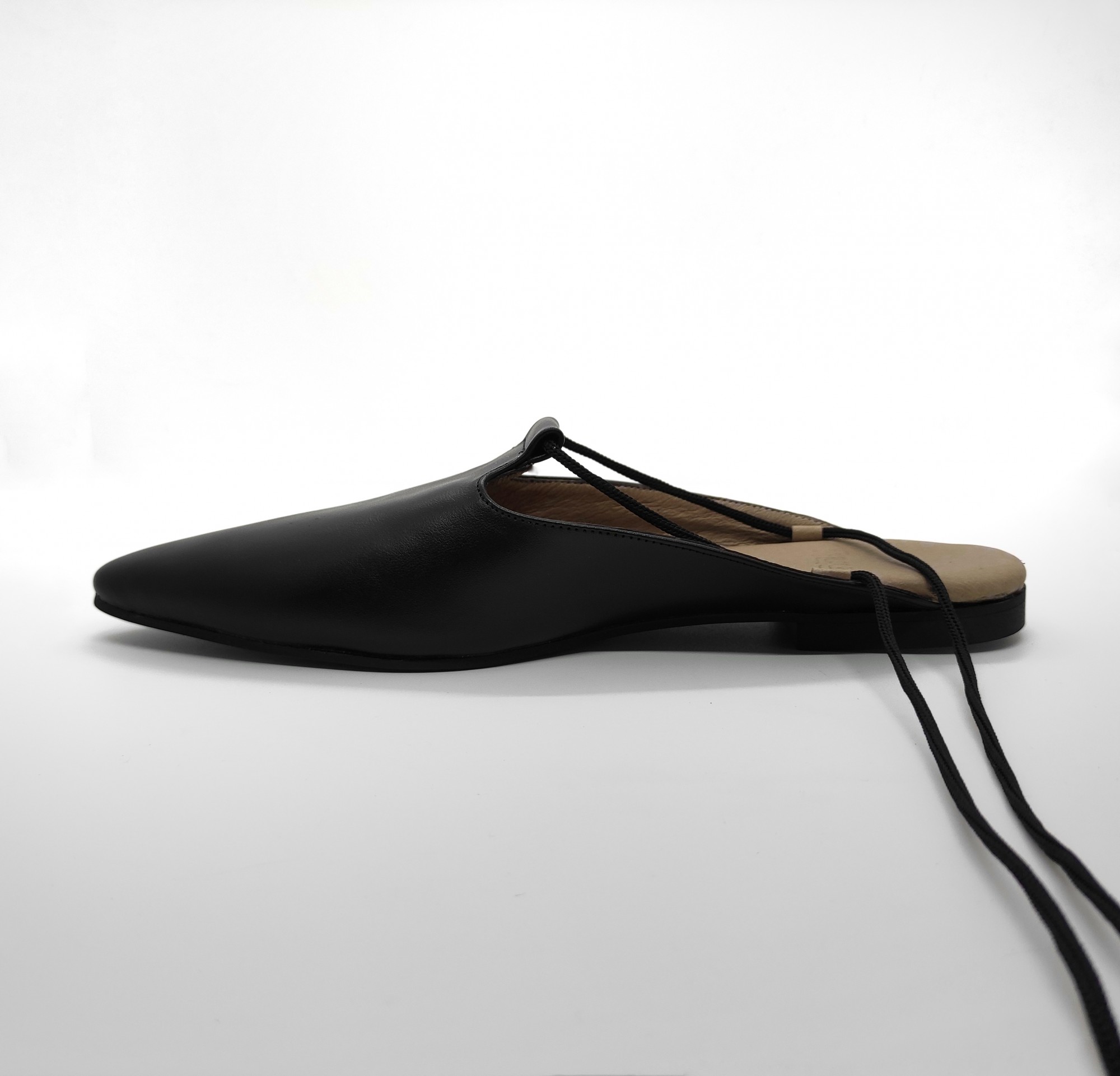 כפכף שטוח, ניתן לנעול עם או בלי שרוכים, שפיץ מתון. רפידת לטקס מצופה עור.