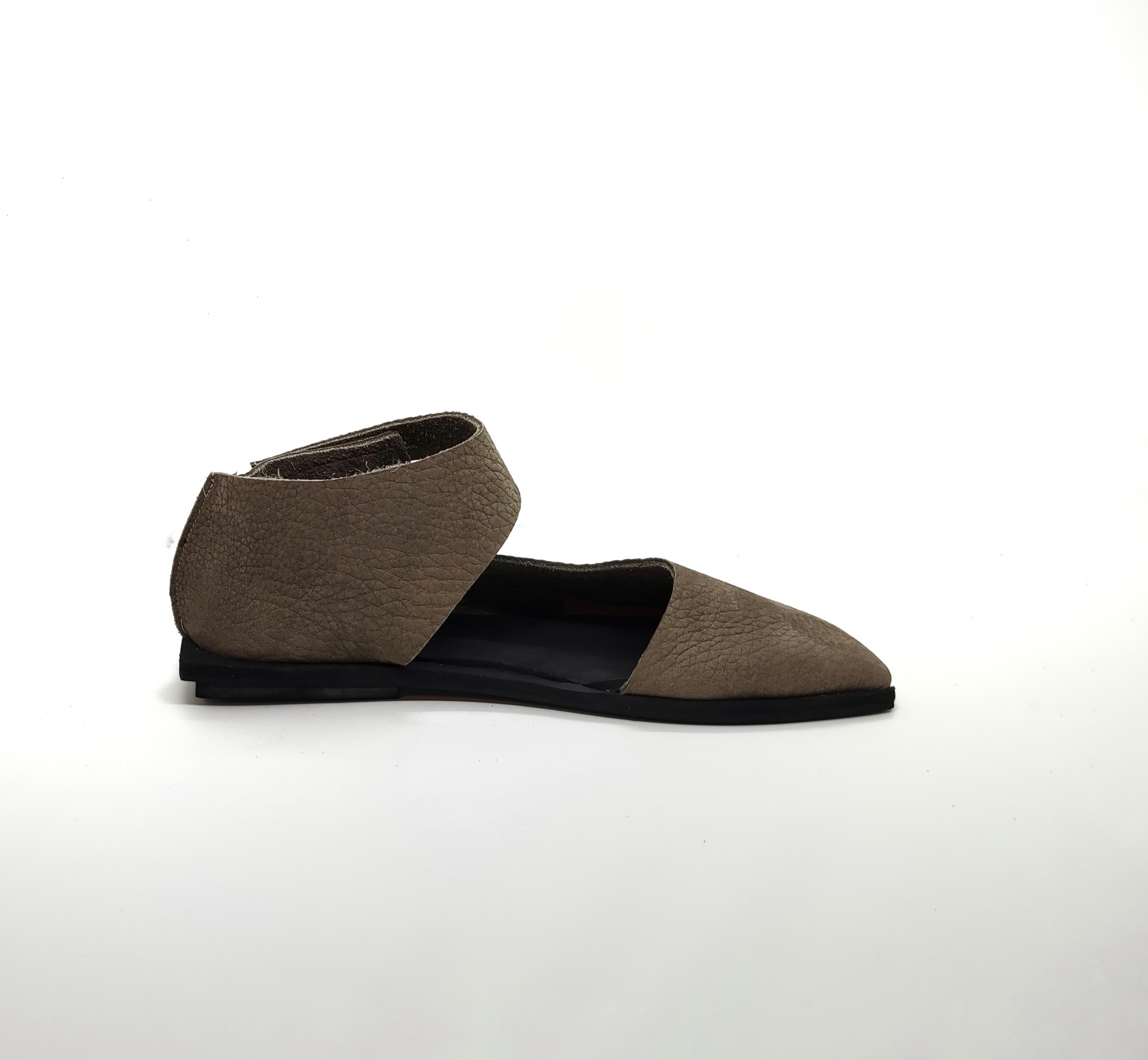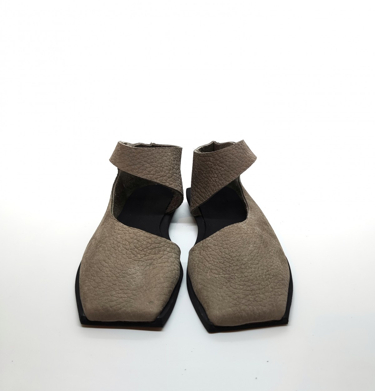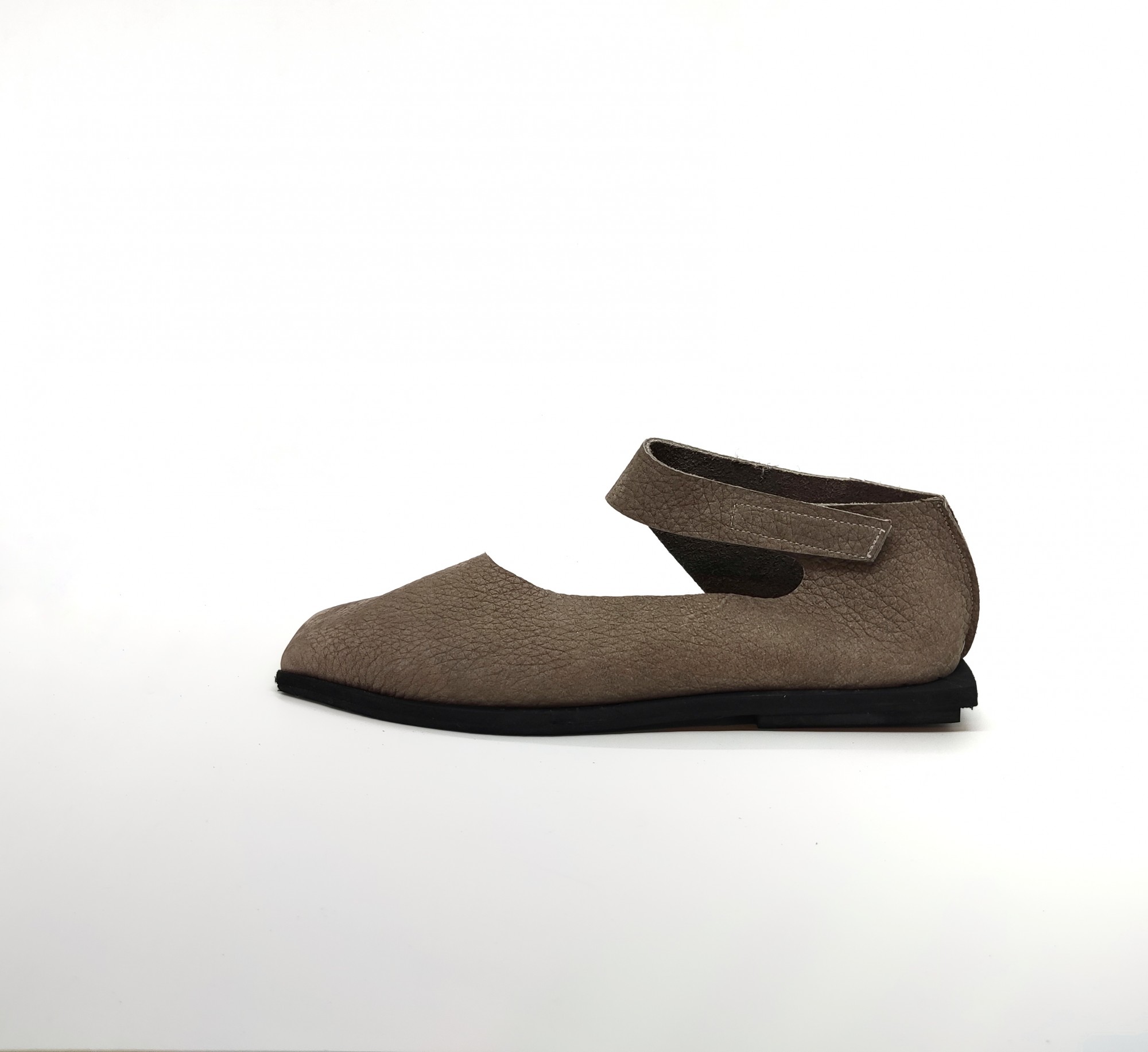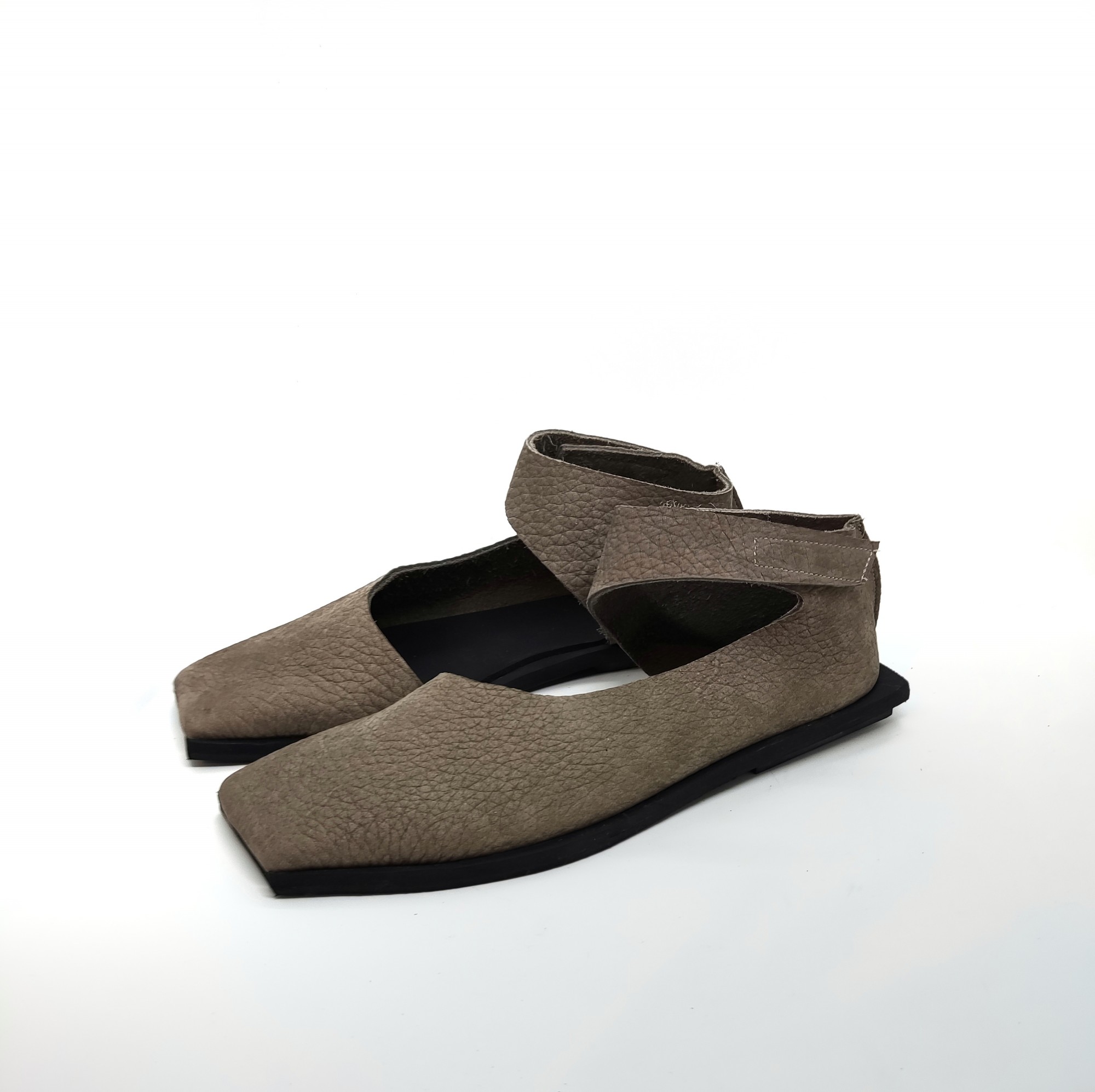 נעל מרובעת שטוחה, עם רצועה שנסגרת באמצעות סקוצ'. רפידת ספוג גומי. עור עבה עם טקסטורה.