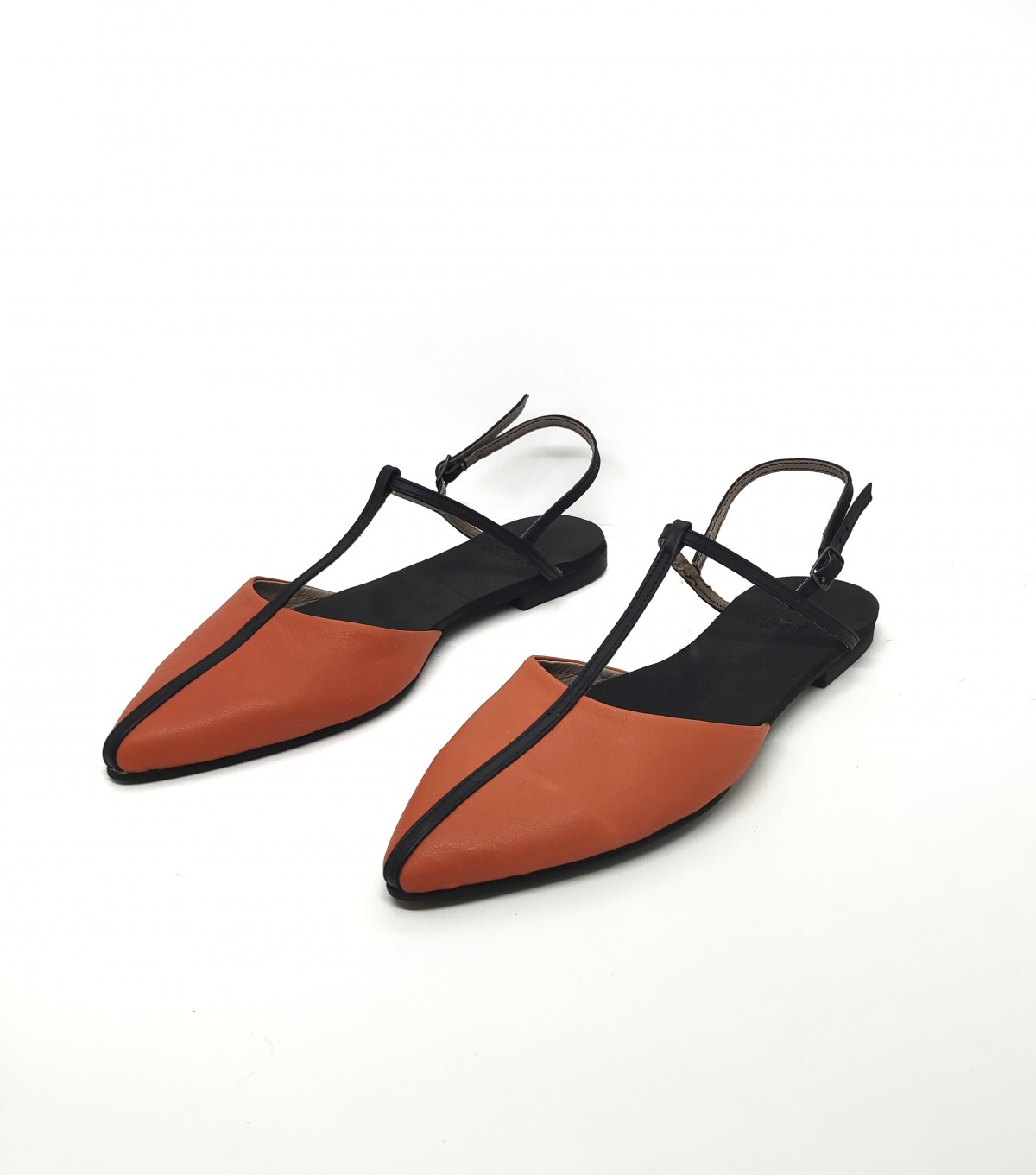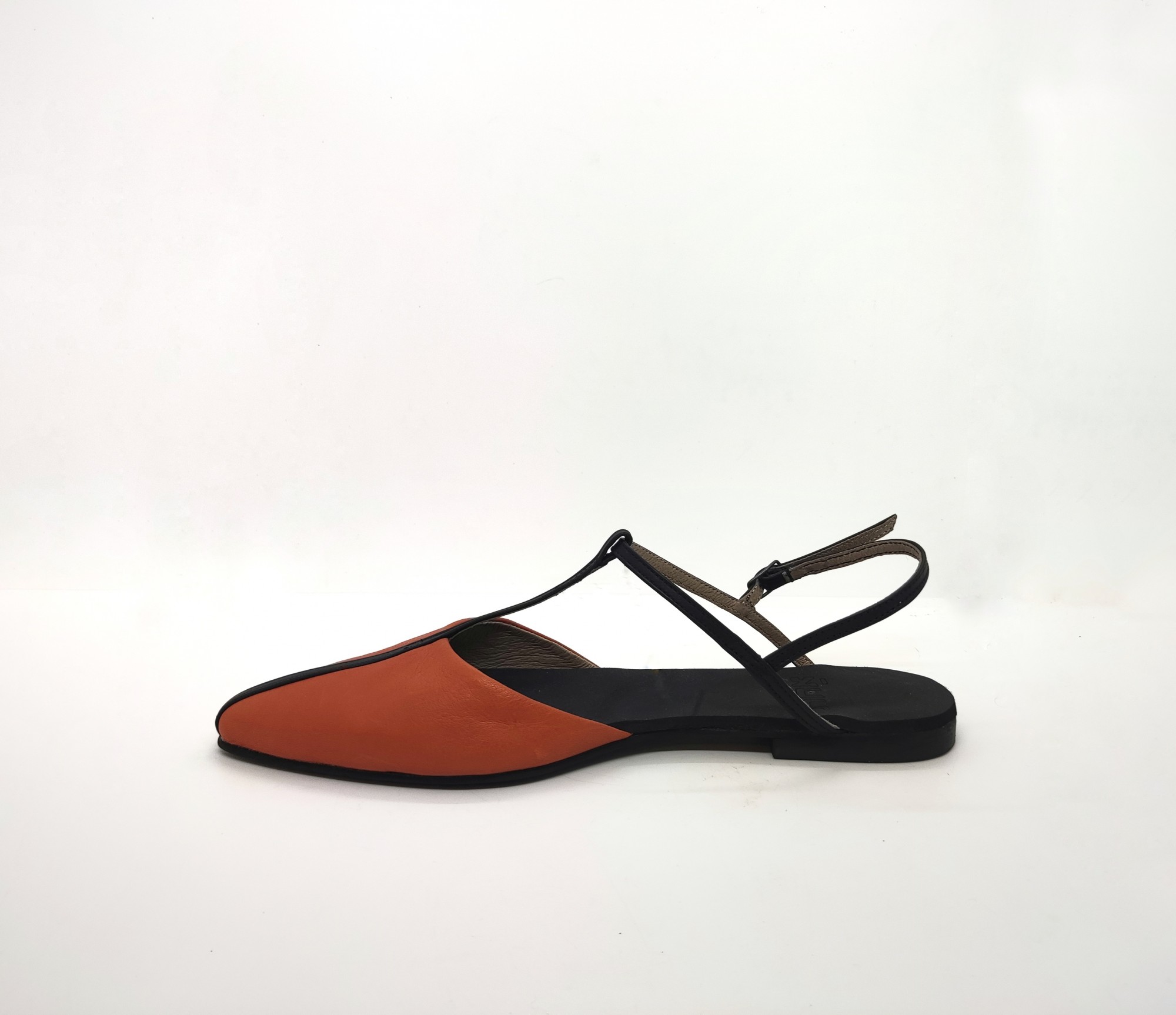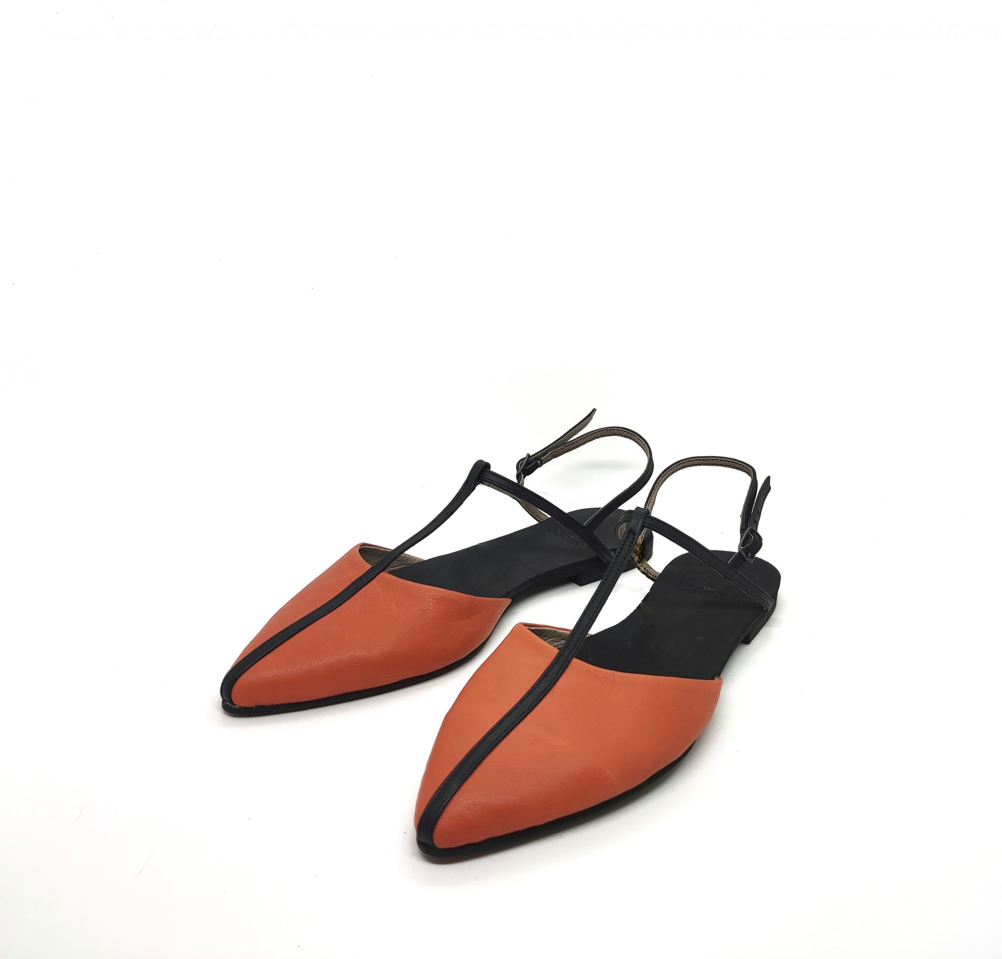 נעל אוורירית שטוחה נסגרת באמצעות רצועה אחורית עם אבזם עדין, שפיץ מתון. רפידת ספוג גומי.