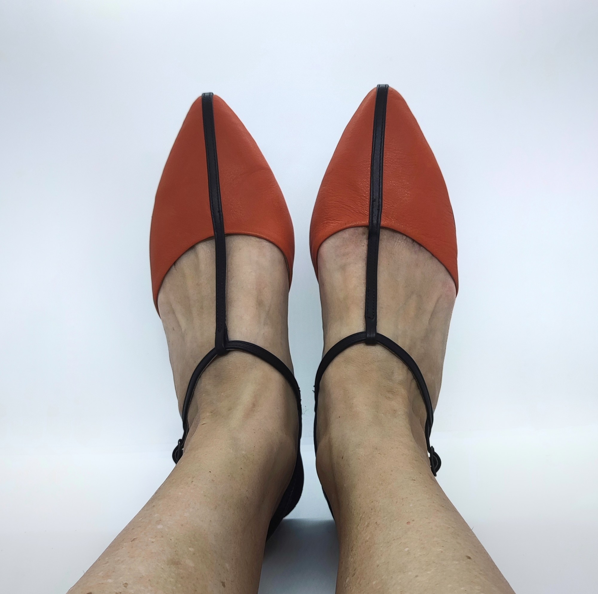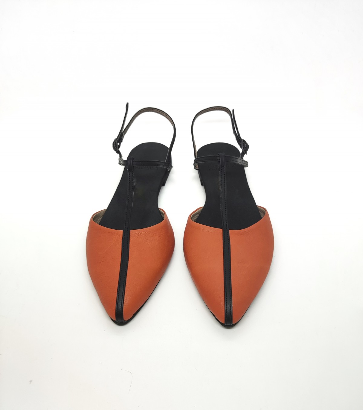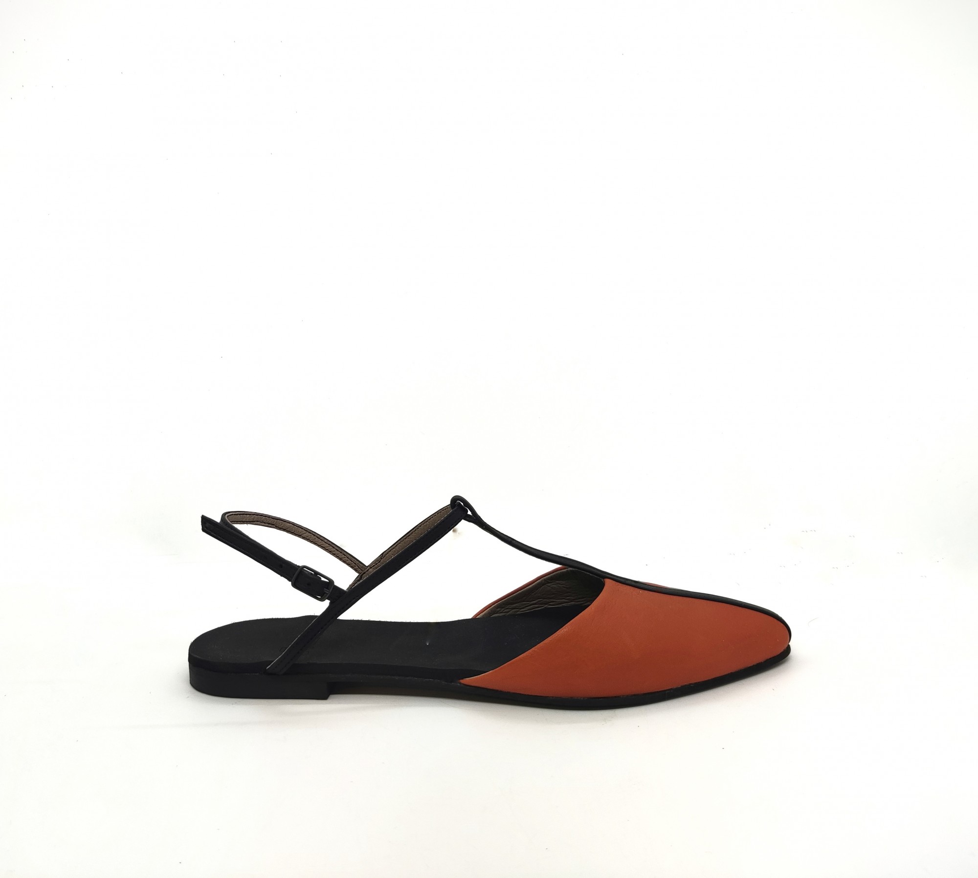 נעל אוורירית שטוחה נסגרת באמצעות רצועה אחורית עם אבזם עדין, שפיץ מתון. רפידת ספוג גומי.