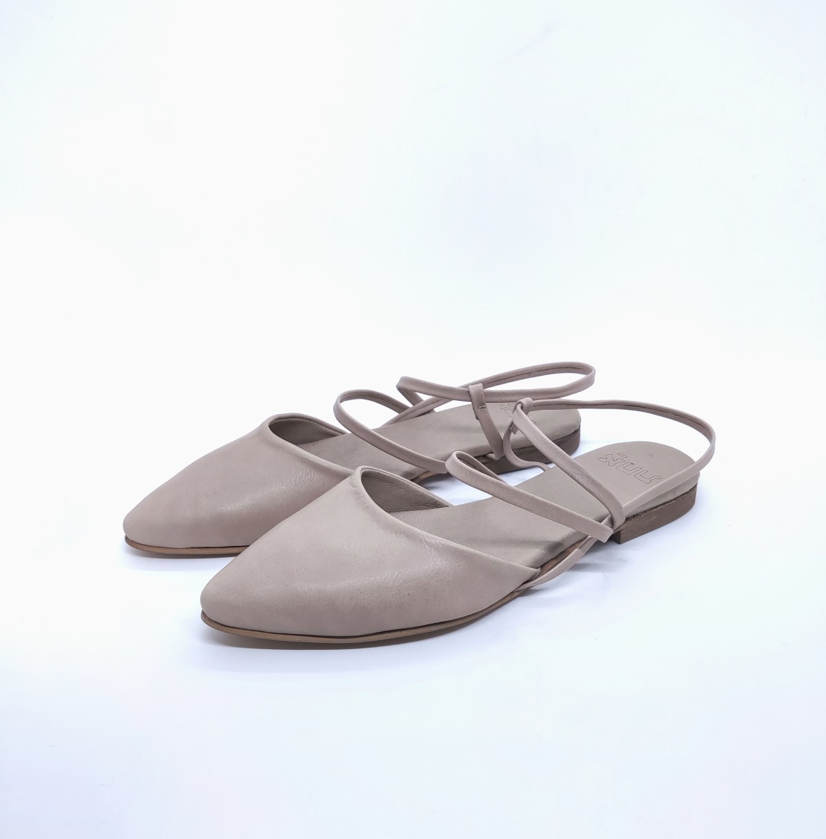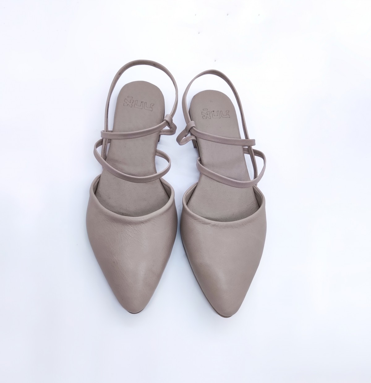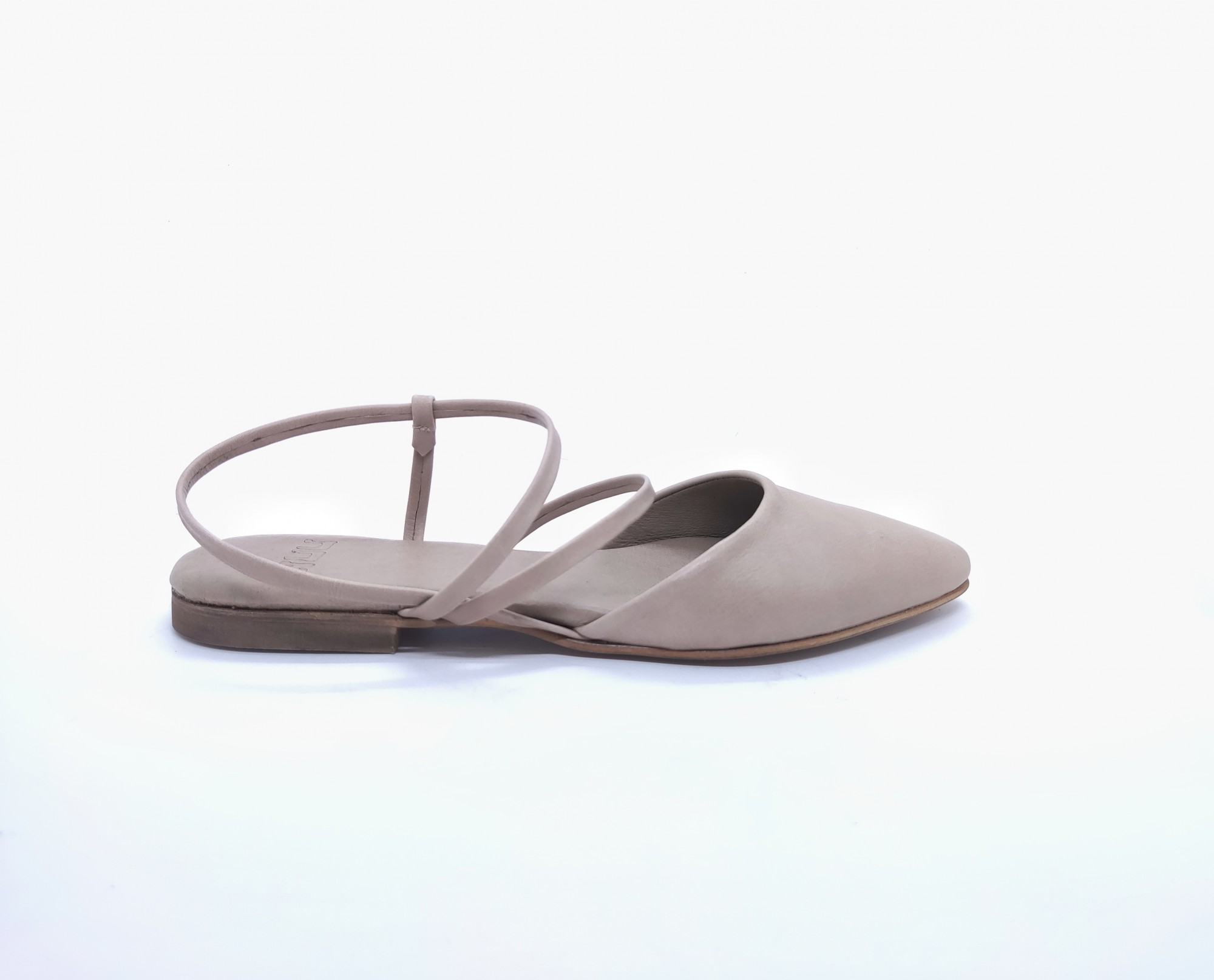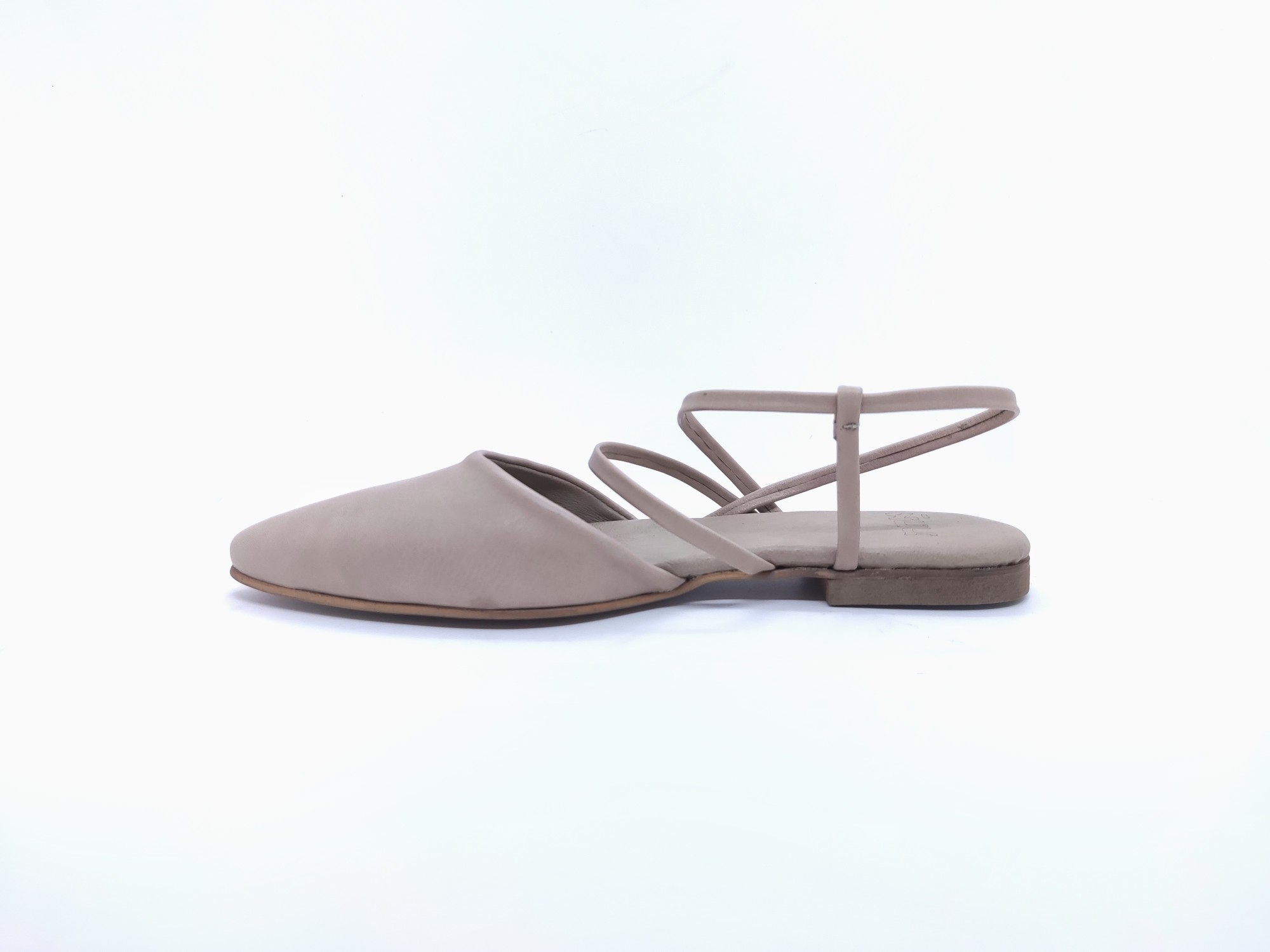 נעל אוורירית שטוחה, רצועות ללא סגירת אבזם. שפיץ מתון, רפידת לטקס מצופה עור.