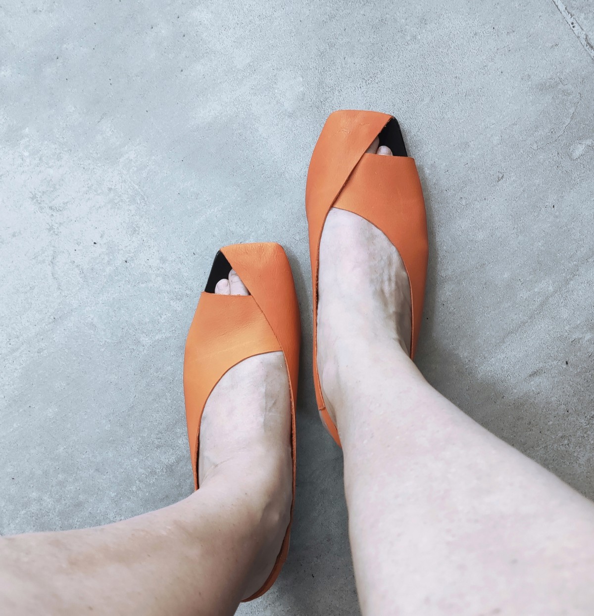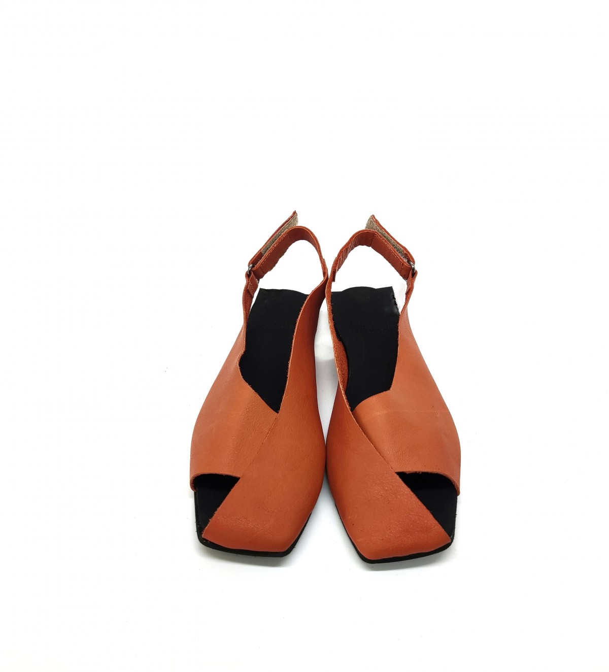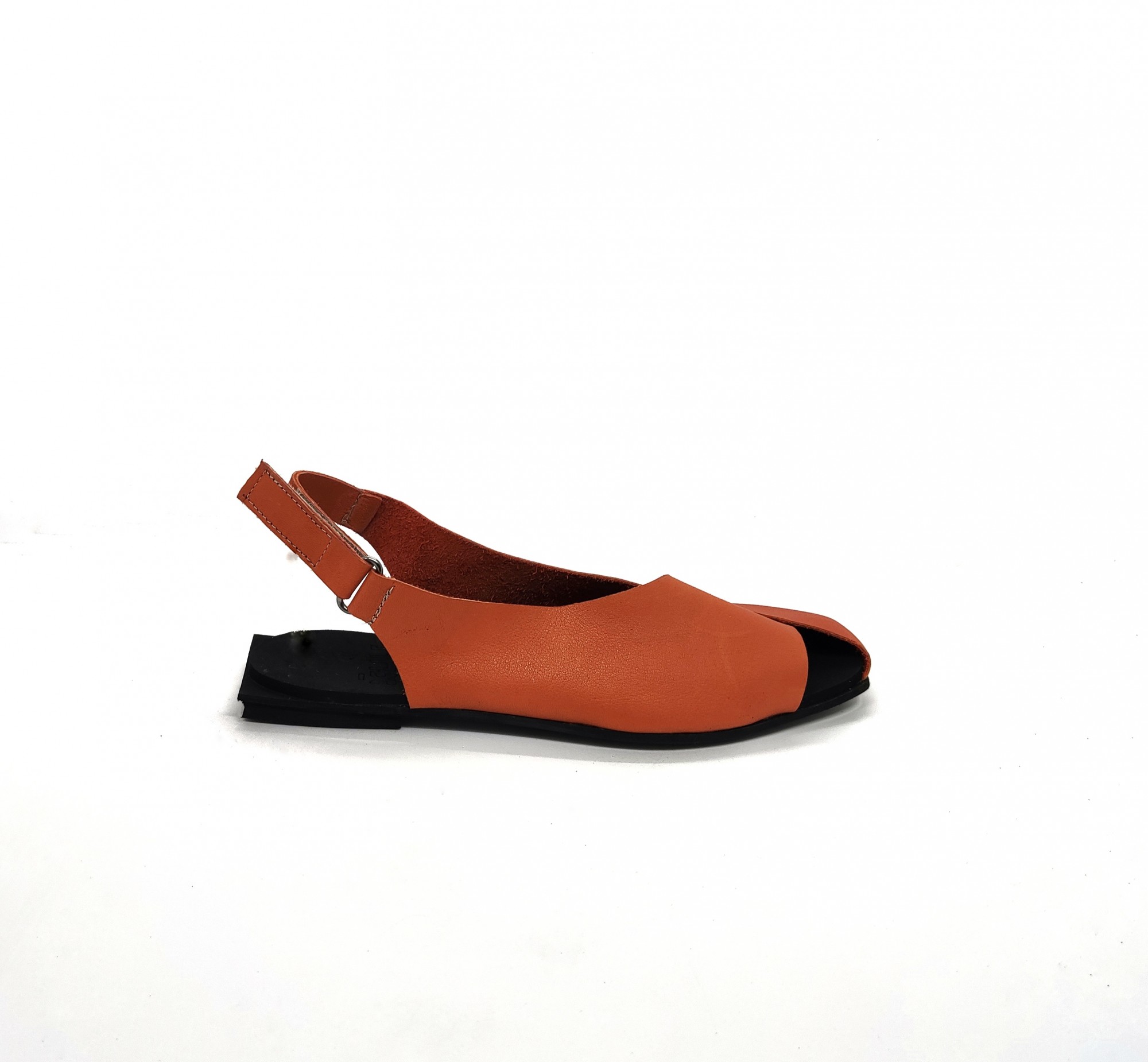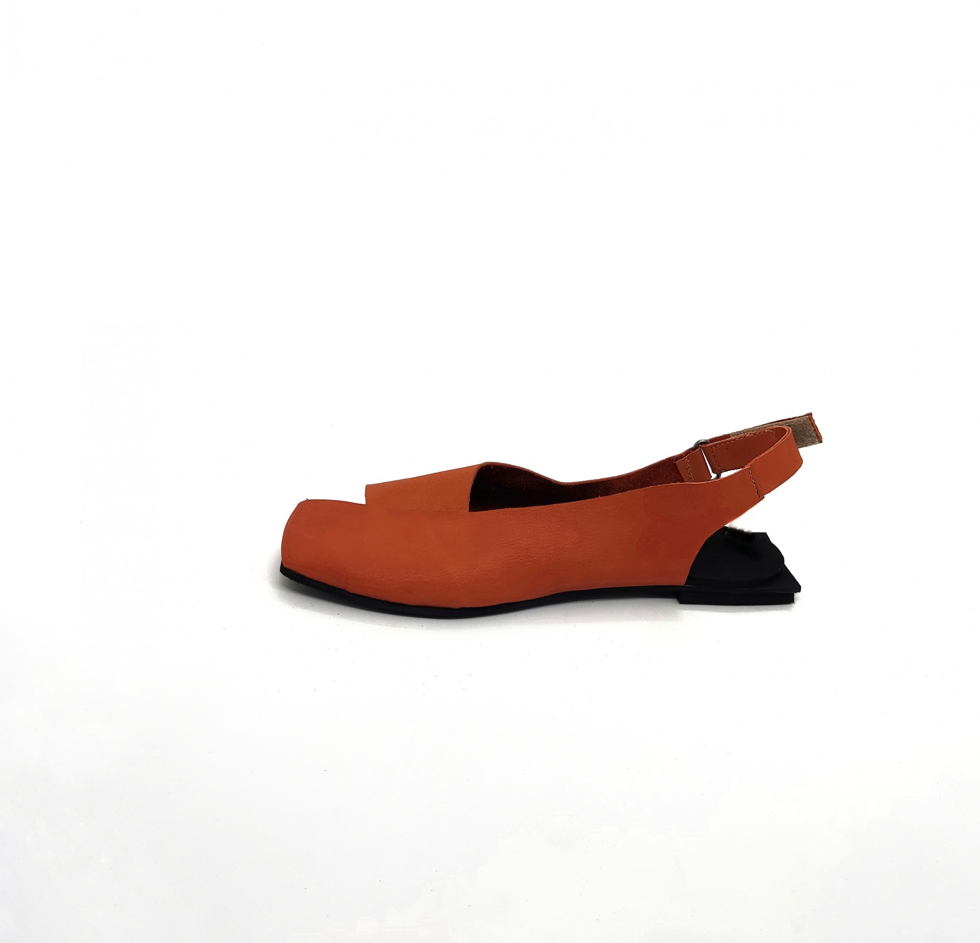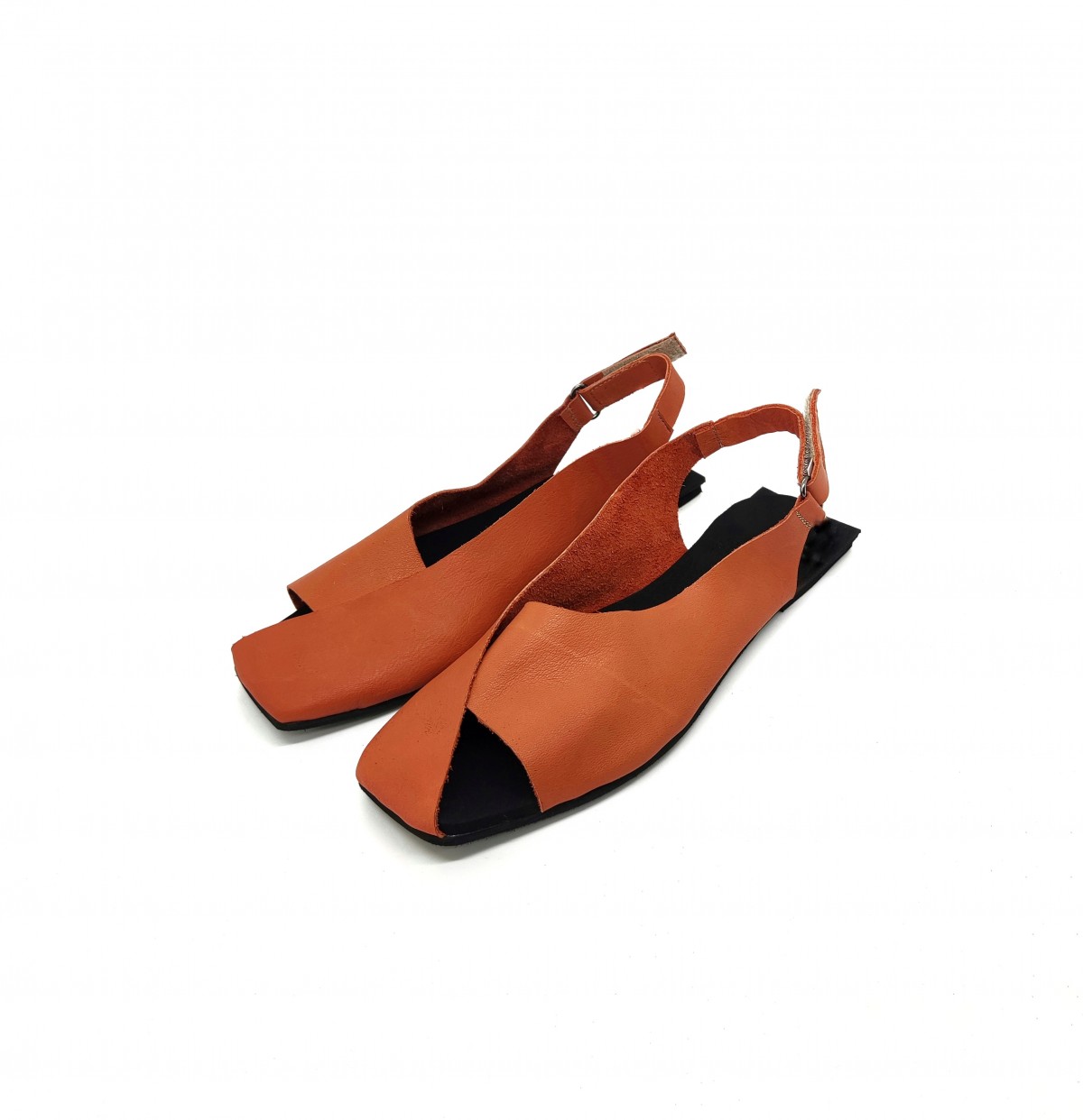 סנדל שטוח אסימטרי, בוהן מכוסה, האחרות מציצות. רצועה אחורית עם סגירת סקוצ'. רפידת ספוג גומי.