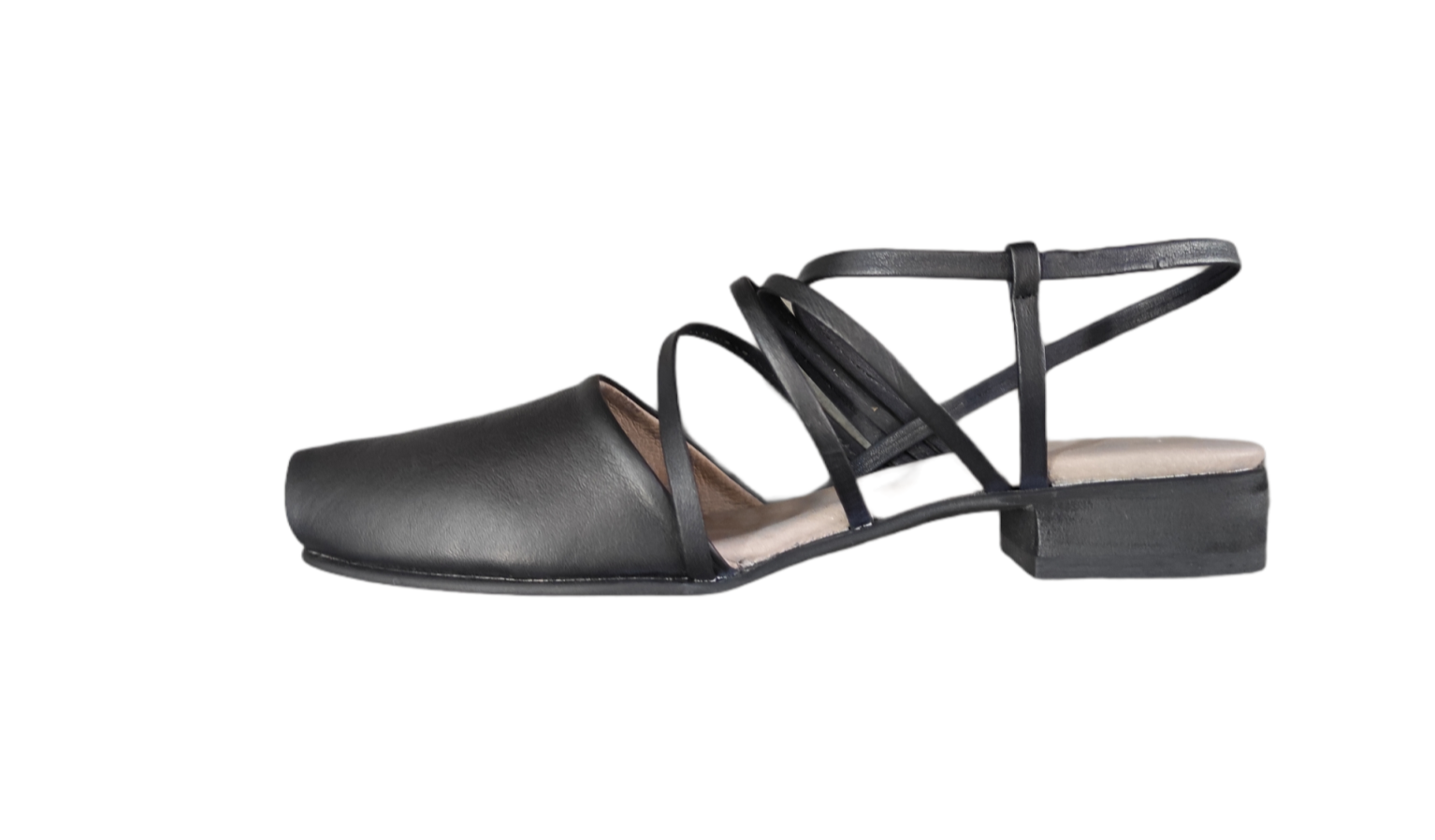 נעל עם רצועות ללא אבזם, פתח מקדימה - לא רואים בהונות. עקב בגובה 2.5 סמ', רפידת לטקס מצופה עור.