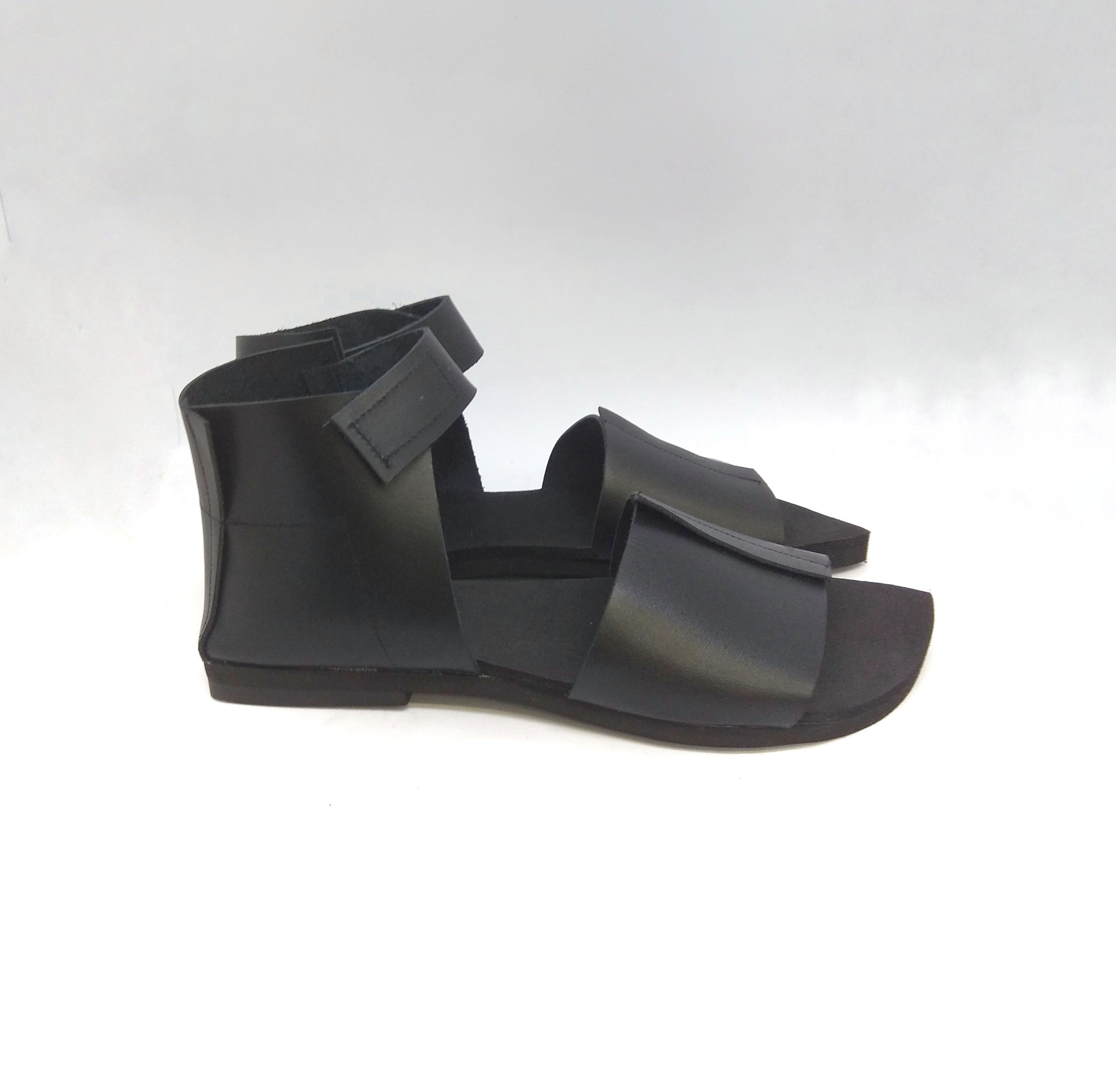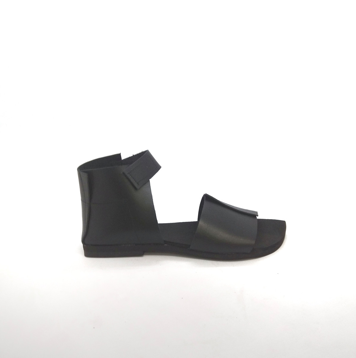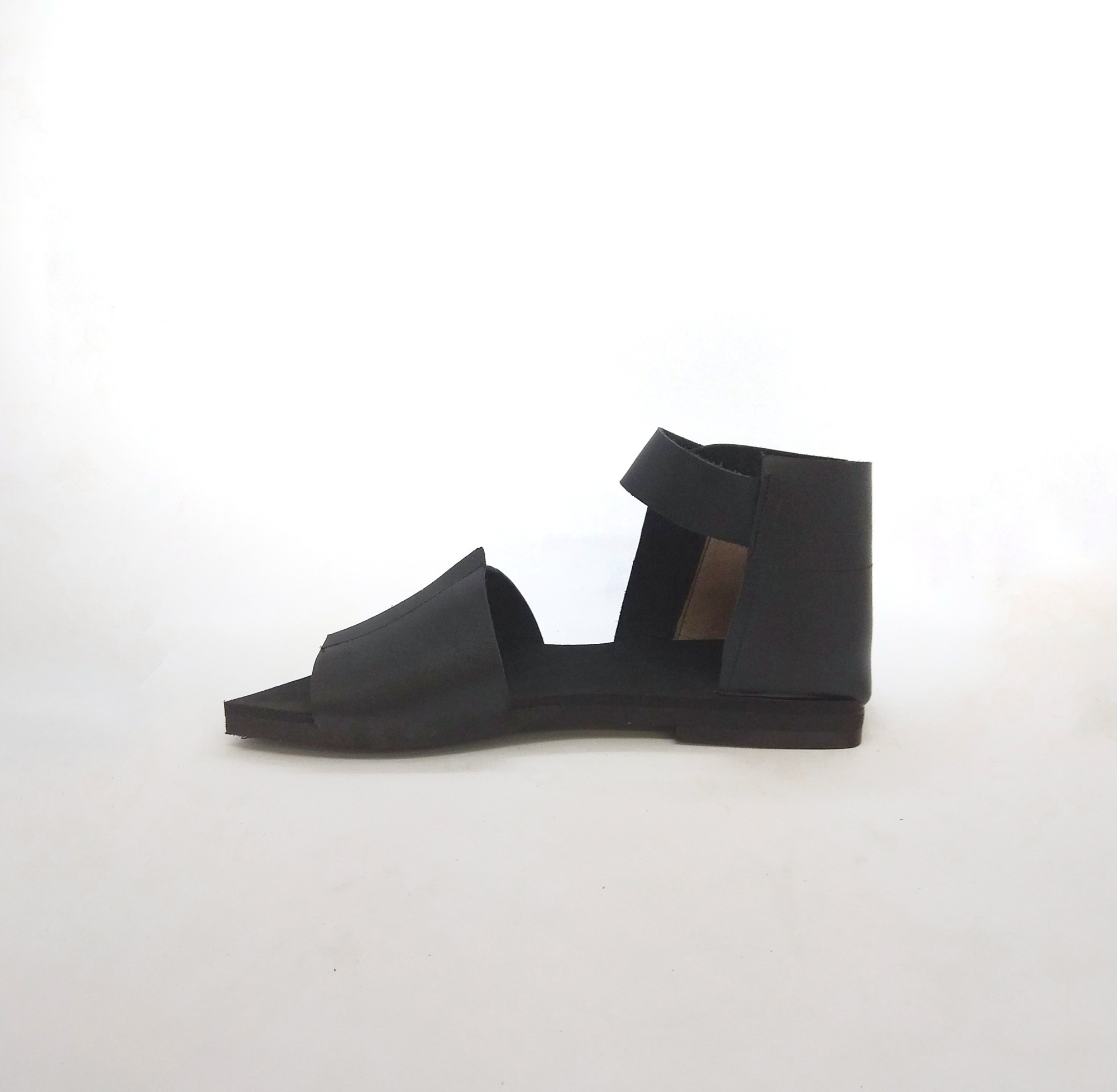 סנדל שטוח מתעקל לשפיץ עם חלק אחורי שעוטף את הקרסול ורצועה שנסגרת בסקוצ'. רפידת ספוג גומי.