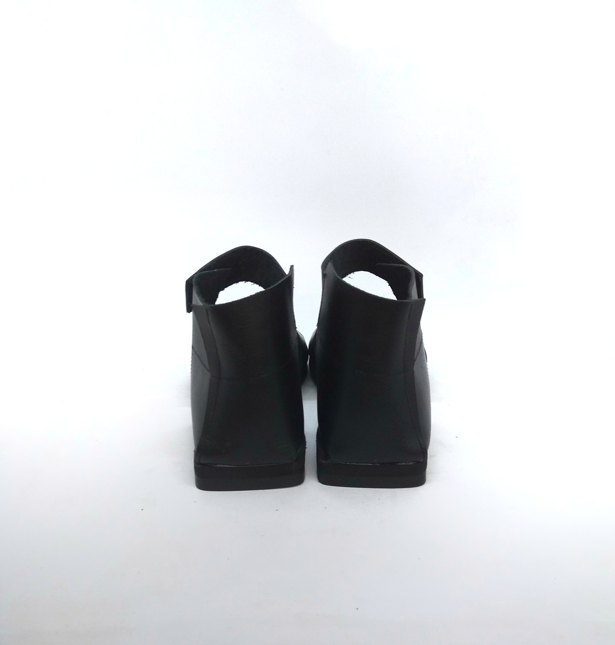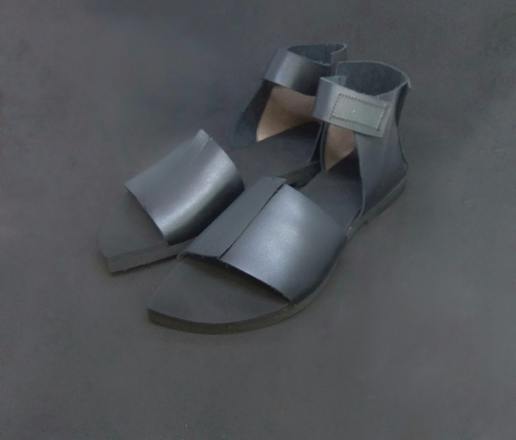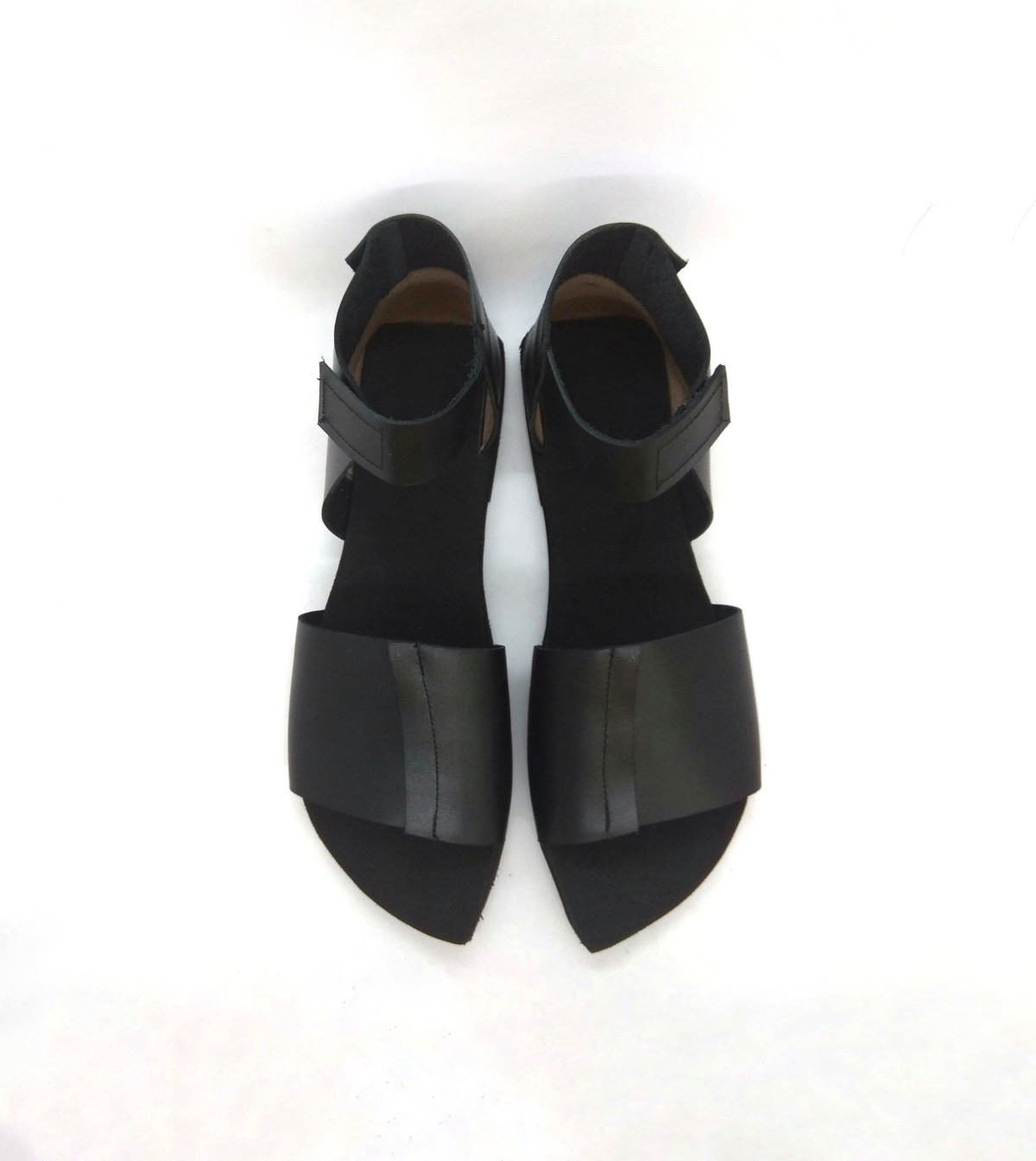 סנדל שטוח מתעקל לשפיץ עם חלק אחורי שעוטף את הקרסול ורצועה שנסגרת בסקוצ'. רפידת ספוג גומי.
