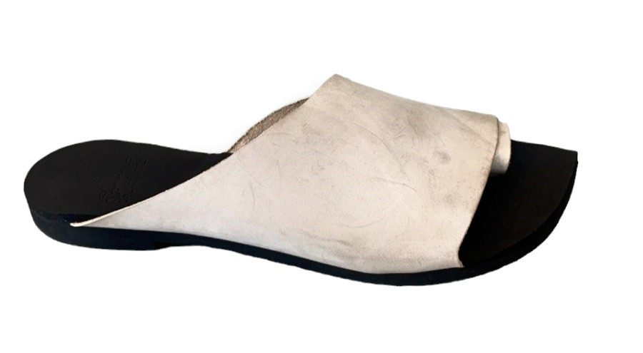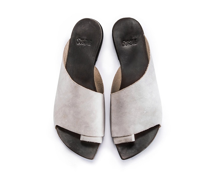 כפכף אצבע שטוח מתעקל לשפיץ. עור נובוק עם ציפוי שמשנה גוון עם הזמן (ונהיה לא אחיד, בז' עם אופוויט), רפידת ספוג גומי.