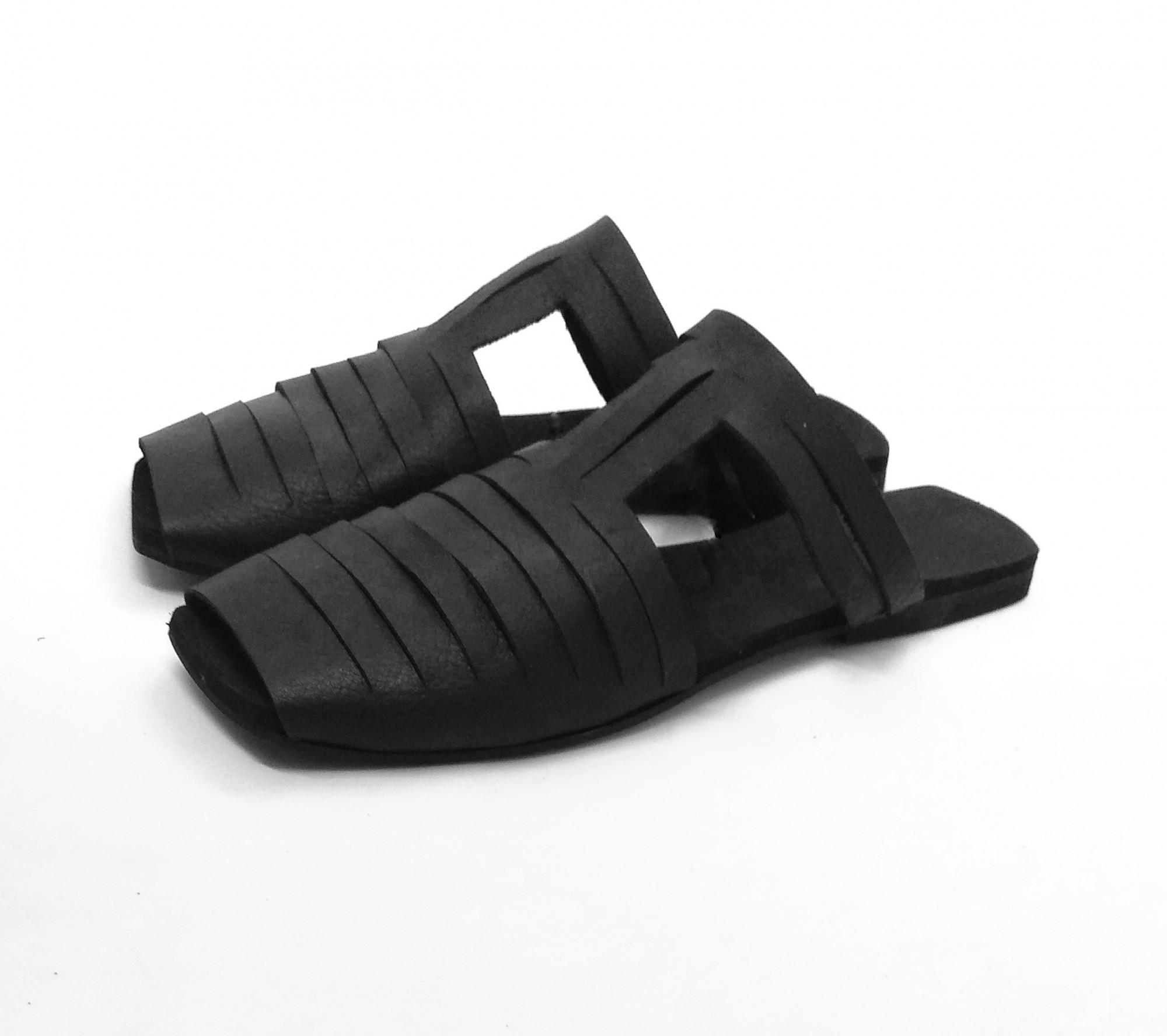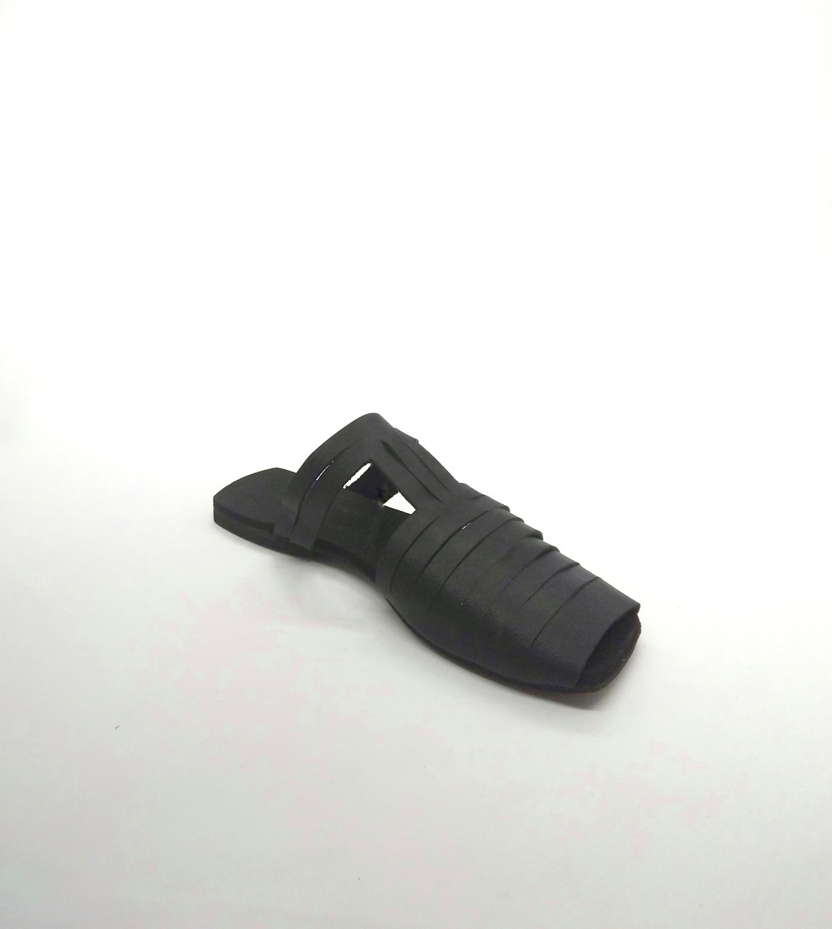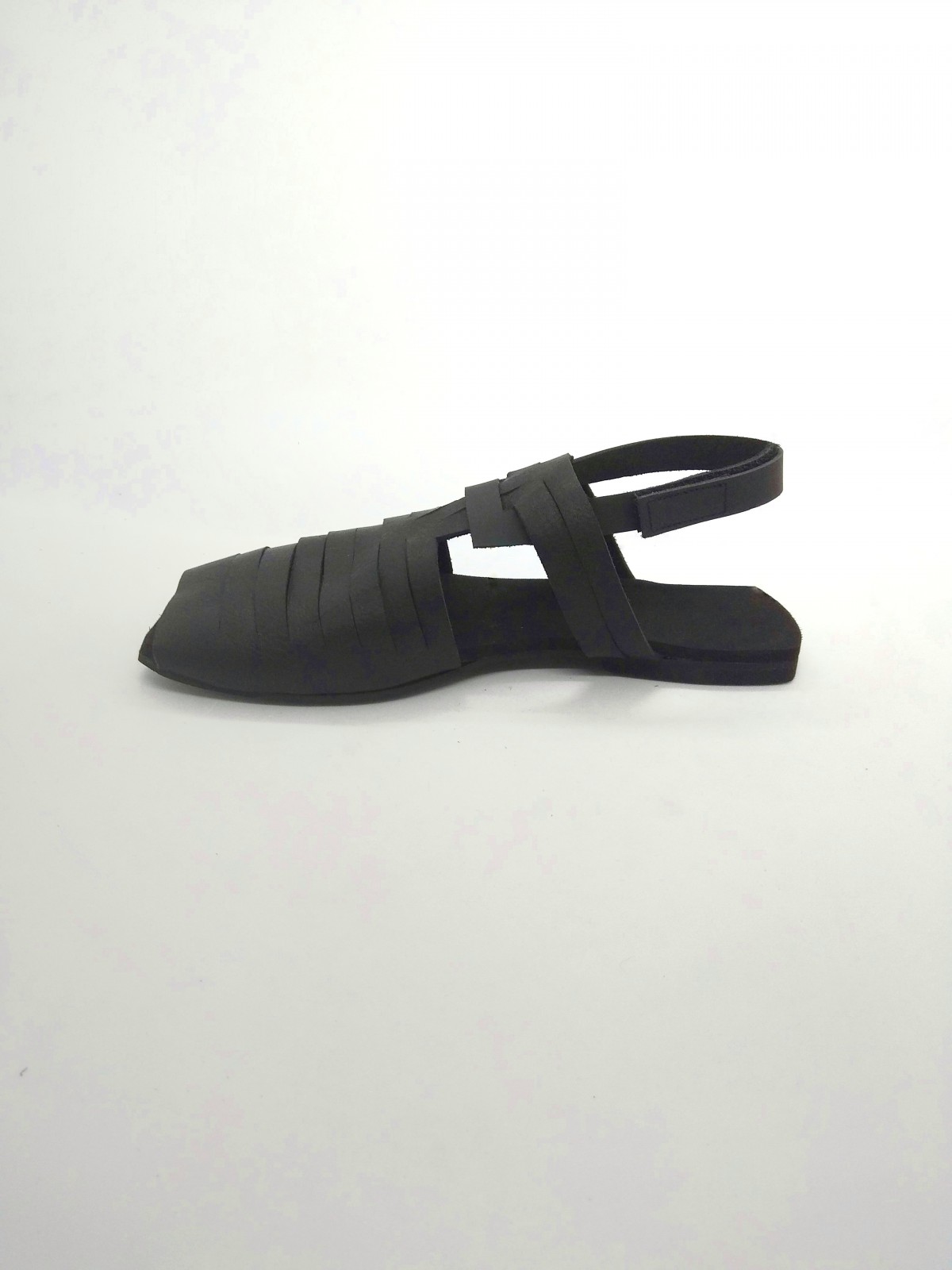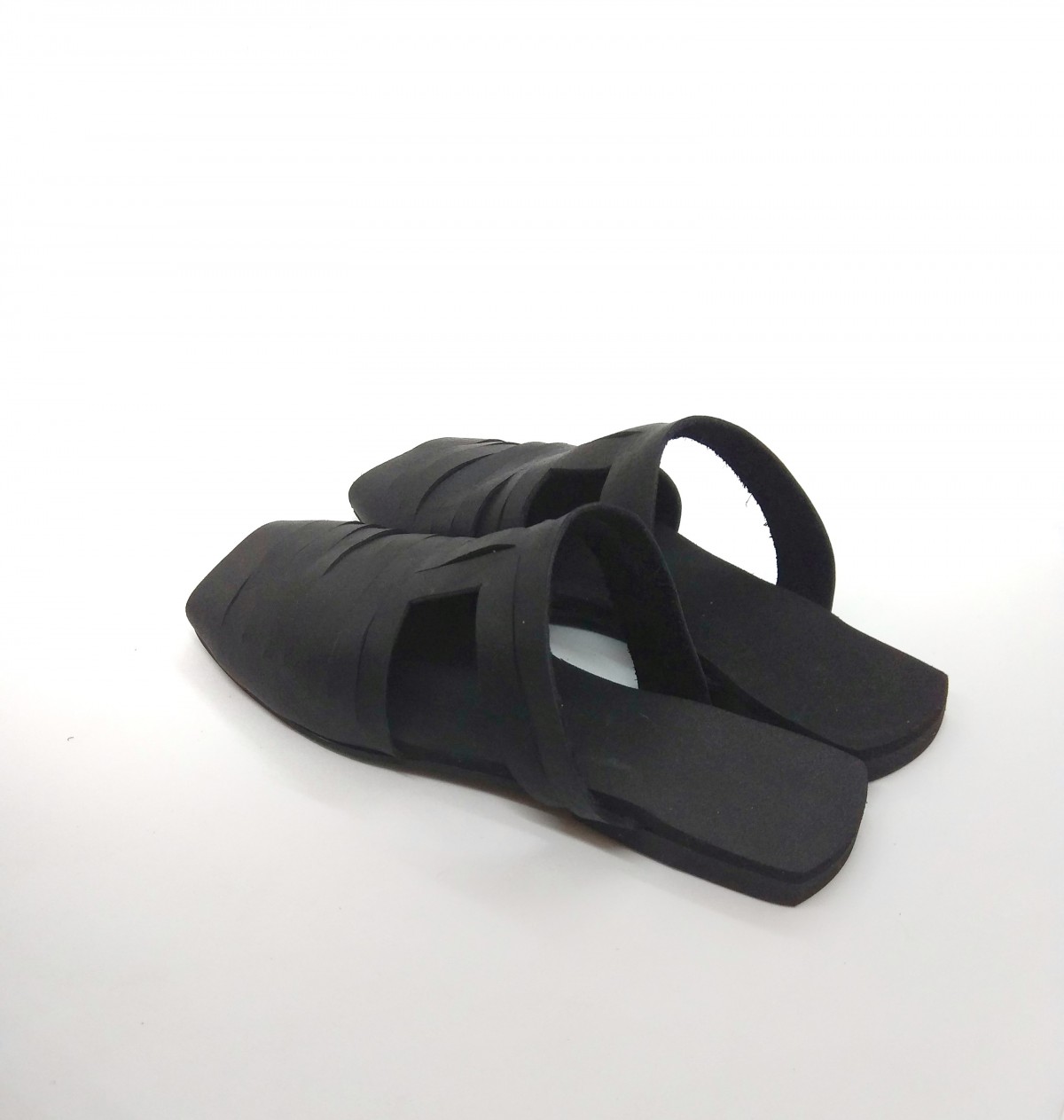 סנדל רצועות מרובע שטוח, שהופך לכפכף בשליפת רצועה. פתוח מקדימה אך לא רואים אצבעות. רפידת ספוג גומי.