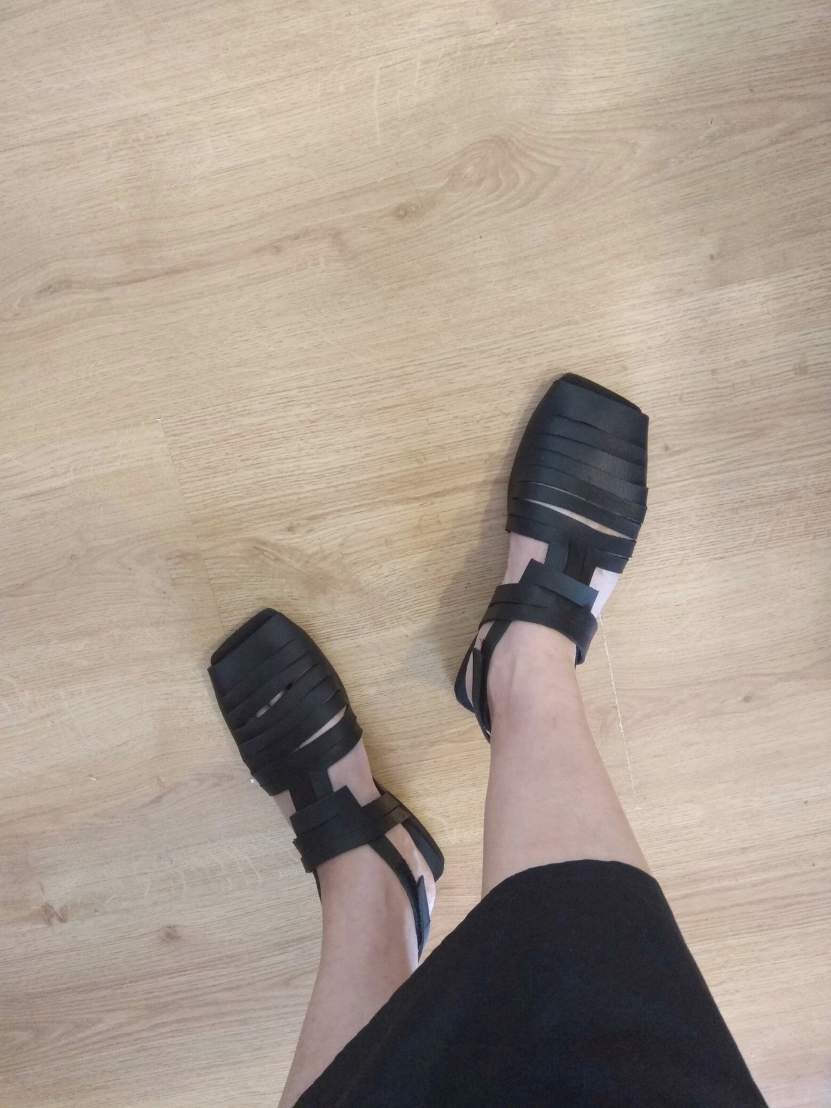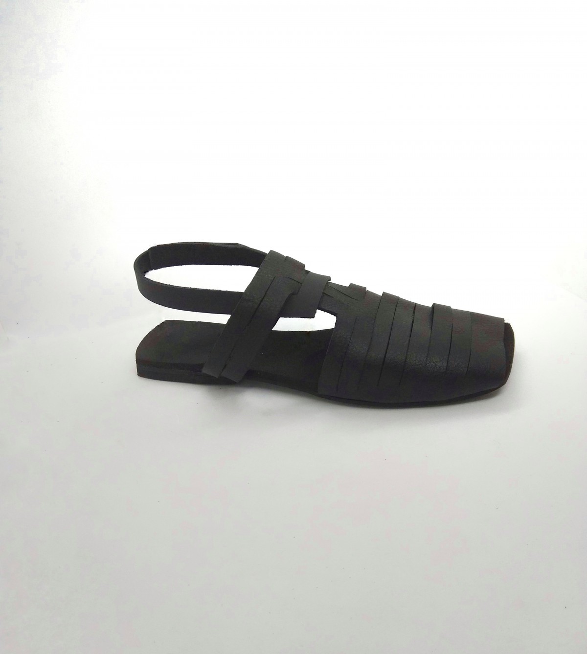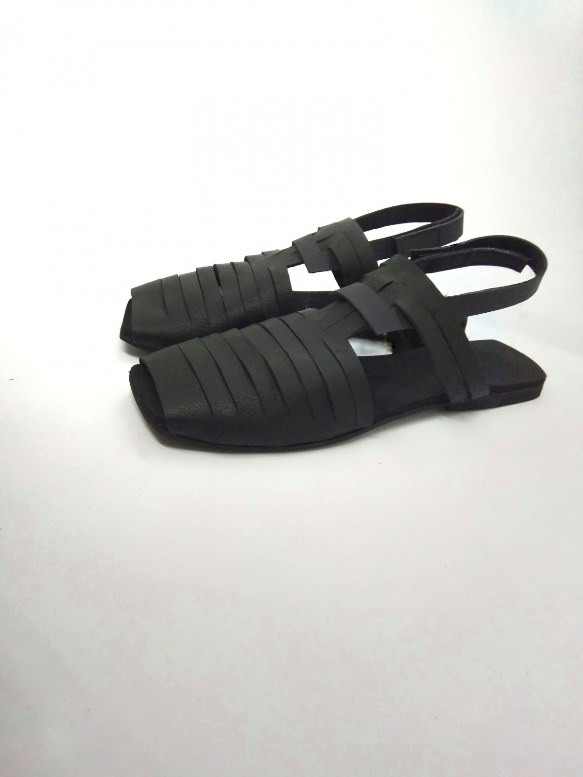 סנדל רצועות מרובע שטוח, שהופך לכפכף בשליפת רצועה. פתוח מקדימה אך לא רואים אצבעות. רפידת ספוג גומי.