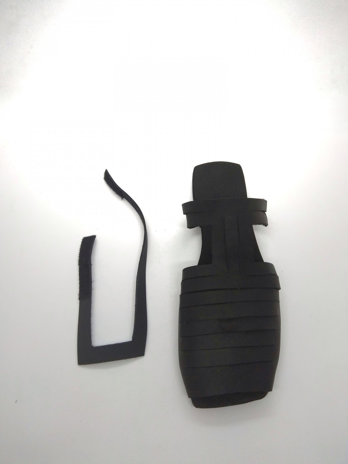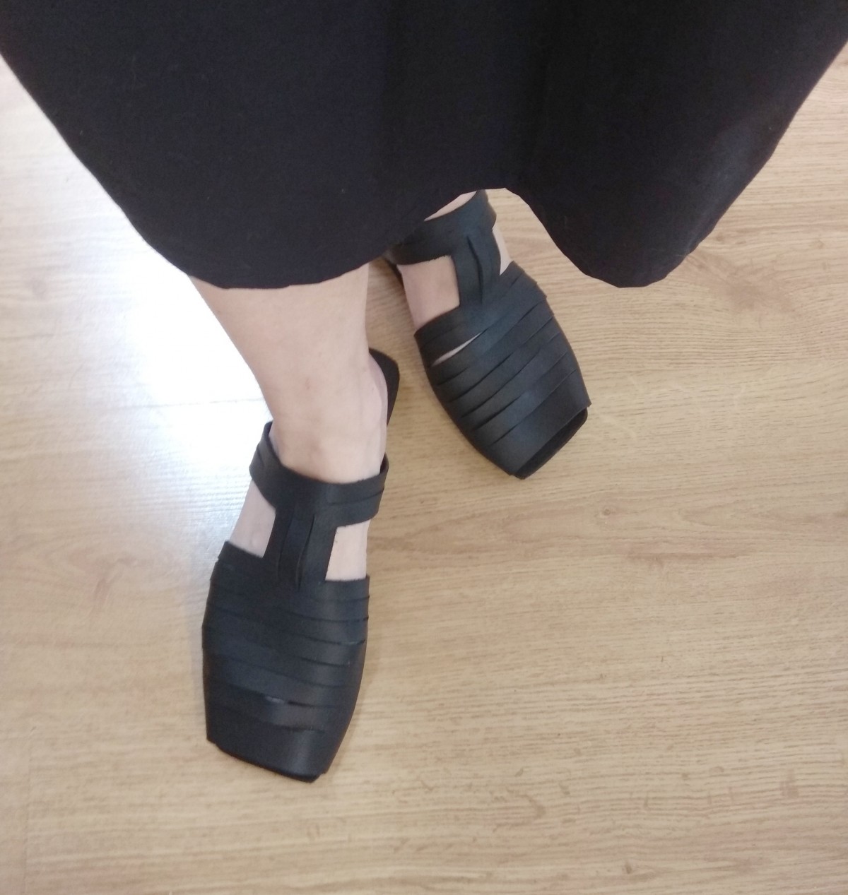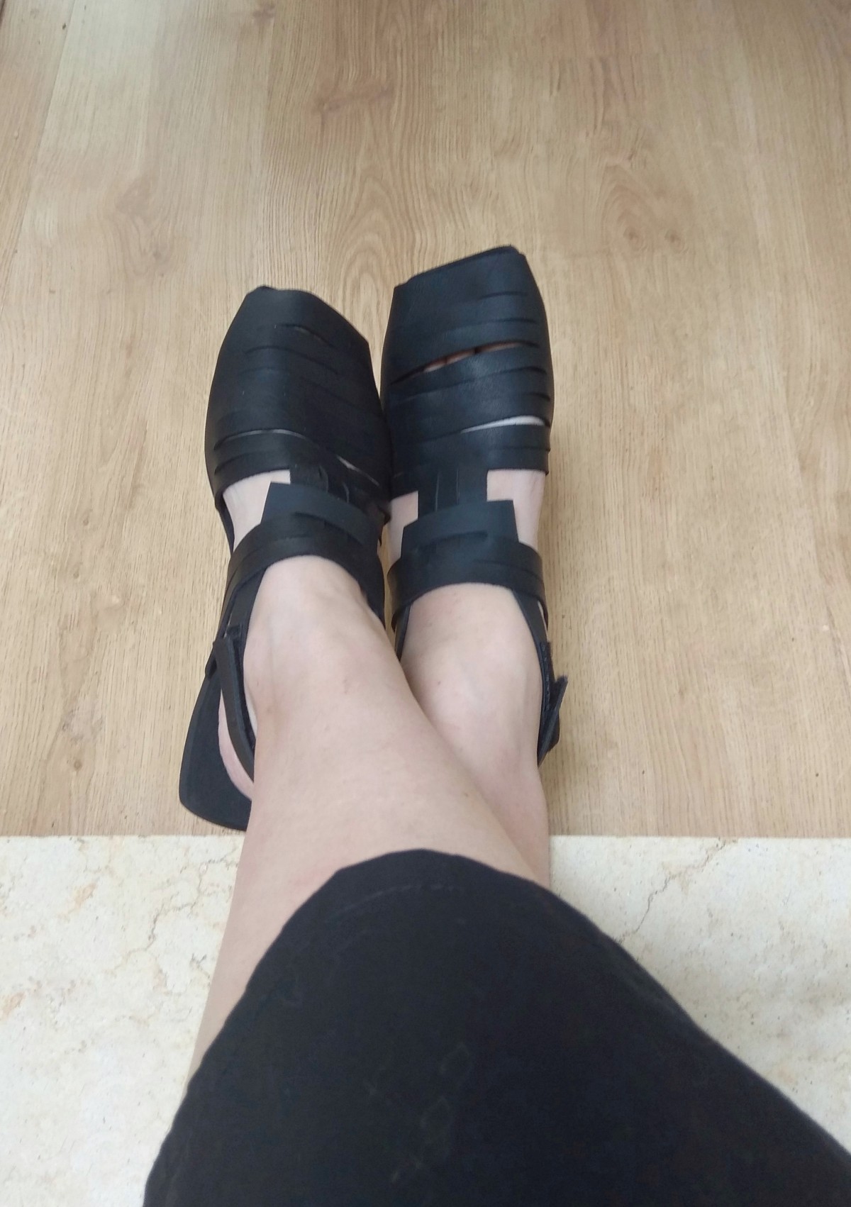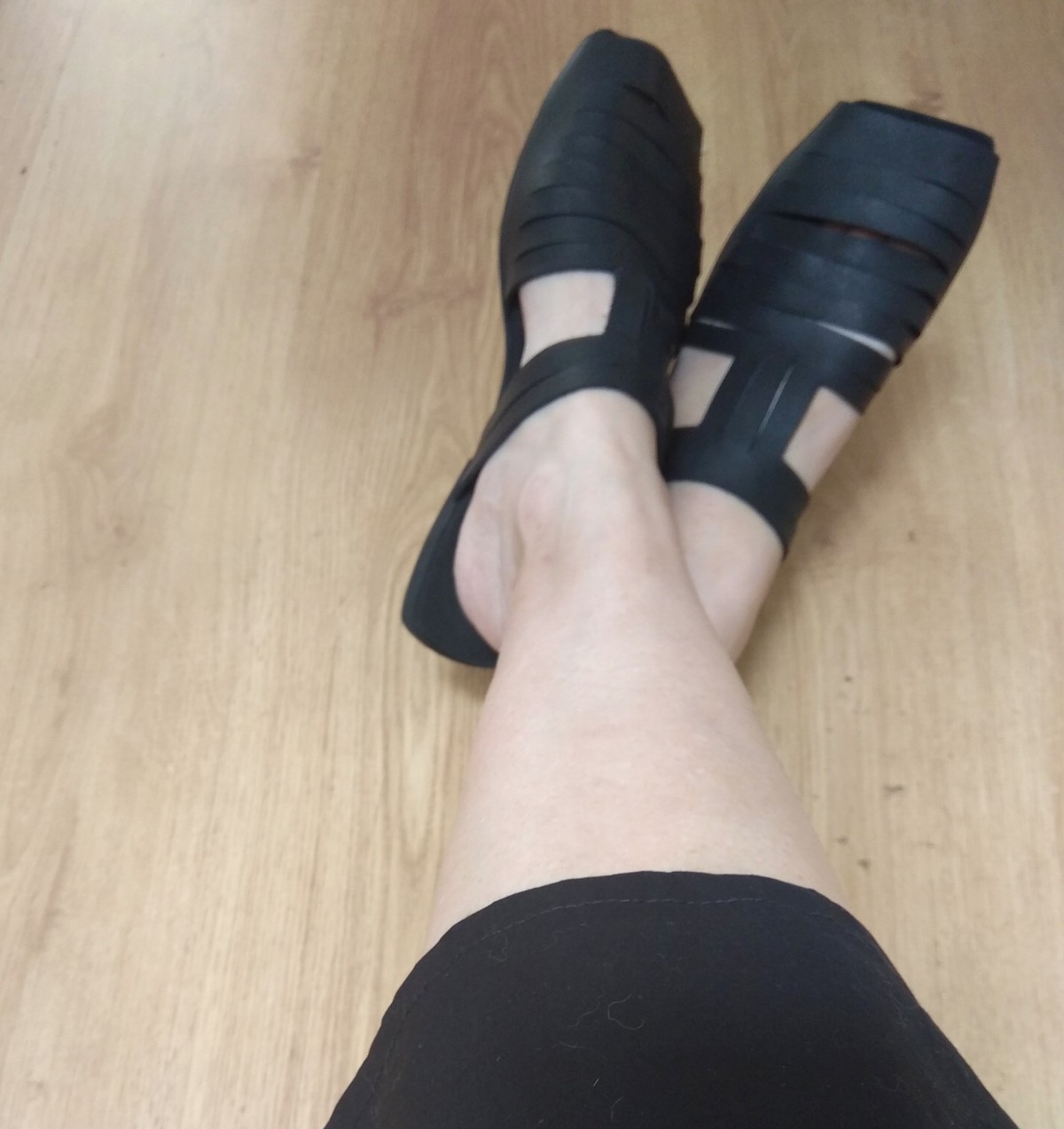 סנדל רצועות מרובע שטוח, שהופך לכפכף בשליפת רצועה. פתוח מקדימה אך לא רואים אצבעות. רפידת ספוג גומי.