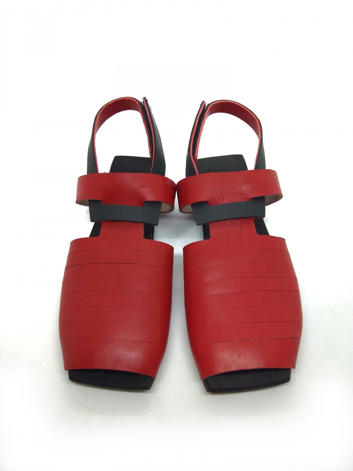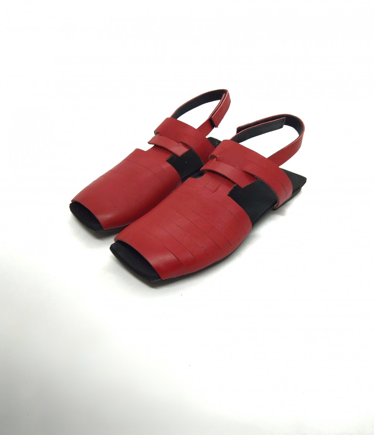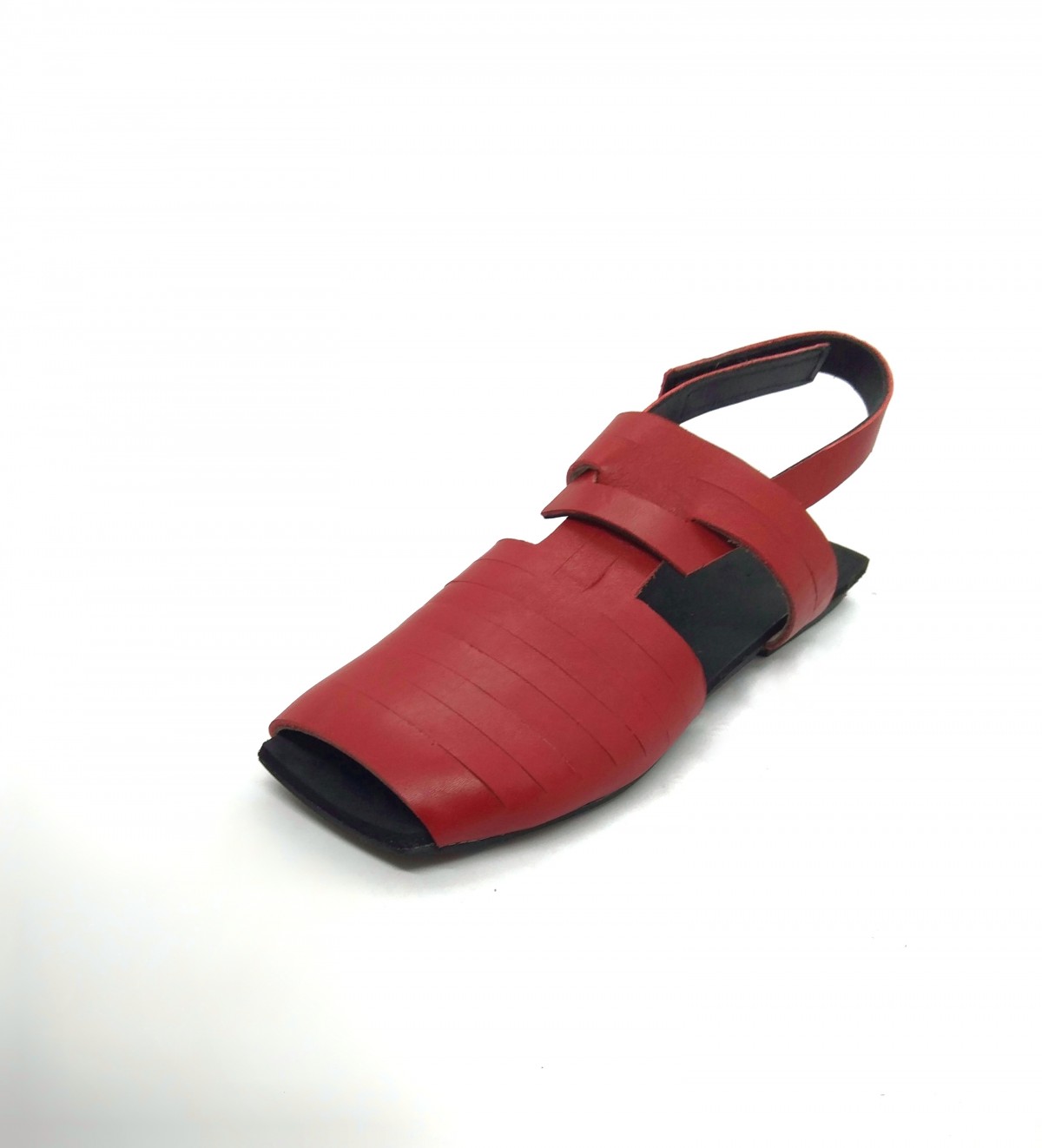 סנדל רצועות מרובע שטוח, שהופך לכפכף בשליפת רצועה. פתוח מקדימה אך לא רואים אצבעות. רפידת ספוג גומי. רצועה דו צדדית, אדום-שחור.