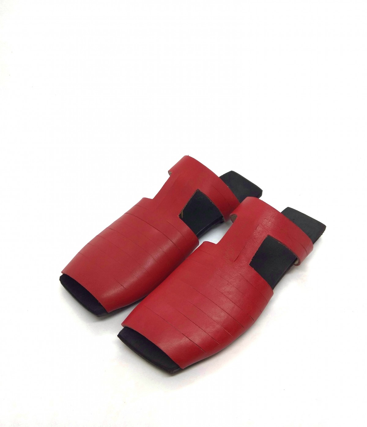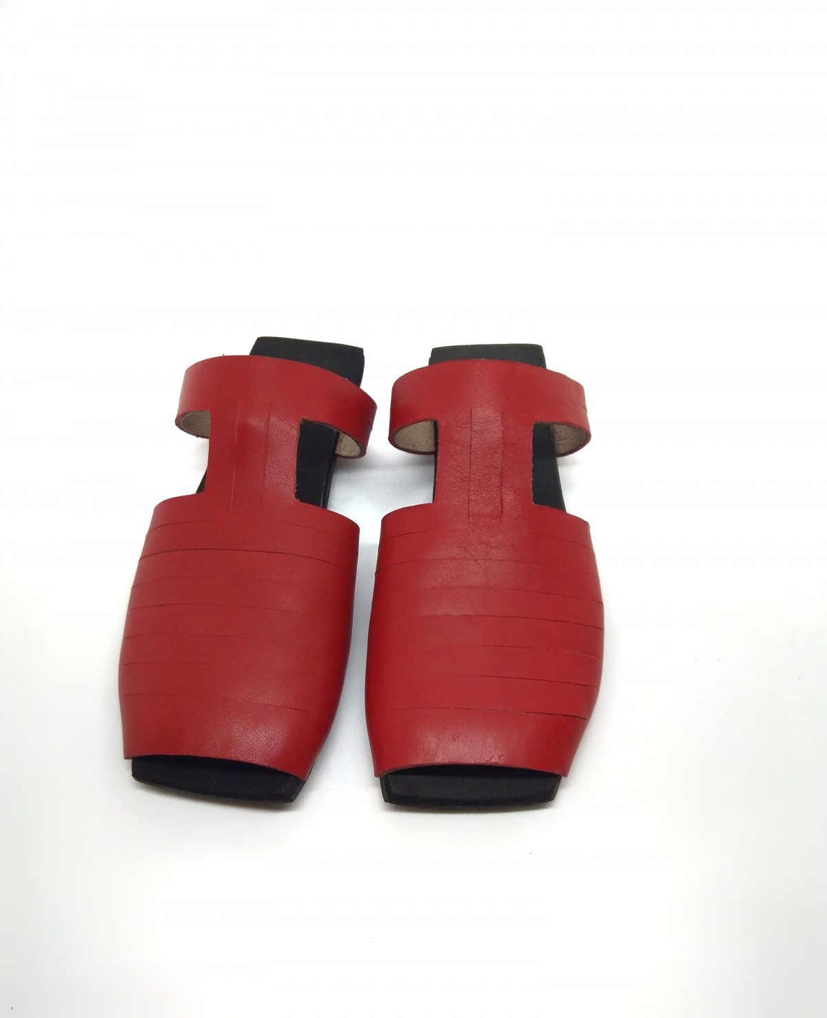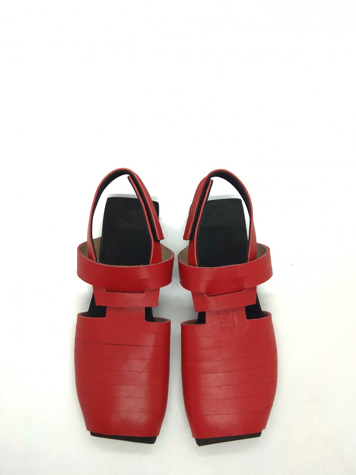 סנדל רצועות מרובע שטוח, שהופך לכפכף בשליפת רצועה. פתוח מקדימה אך לא רואים אצבעות. רפידת ספוג גומי. רצועה דו צדדית, אדום-שחור.