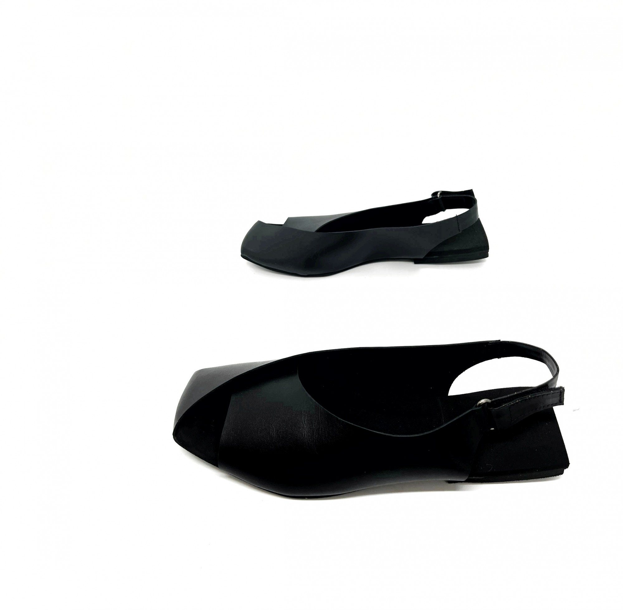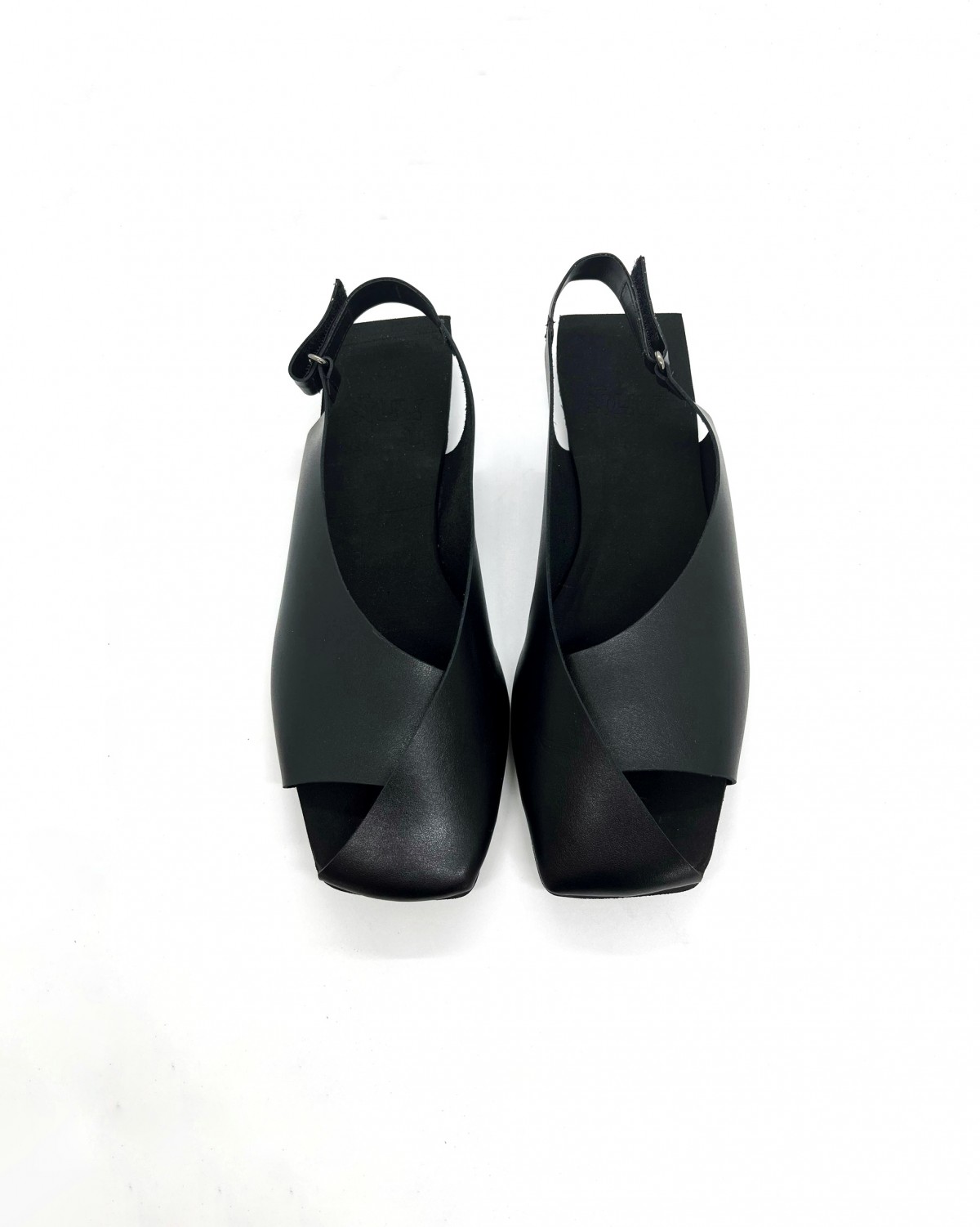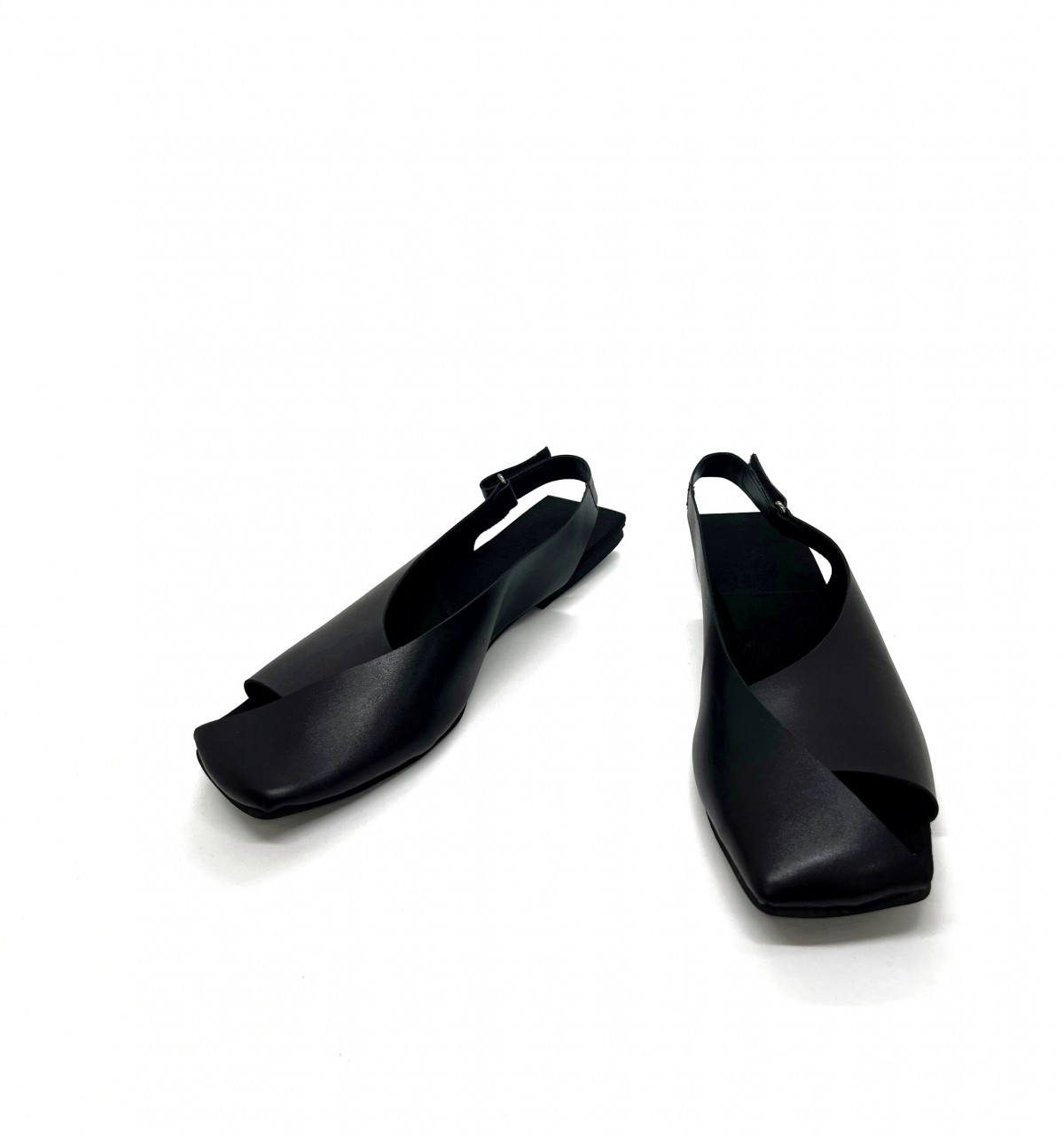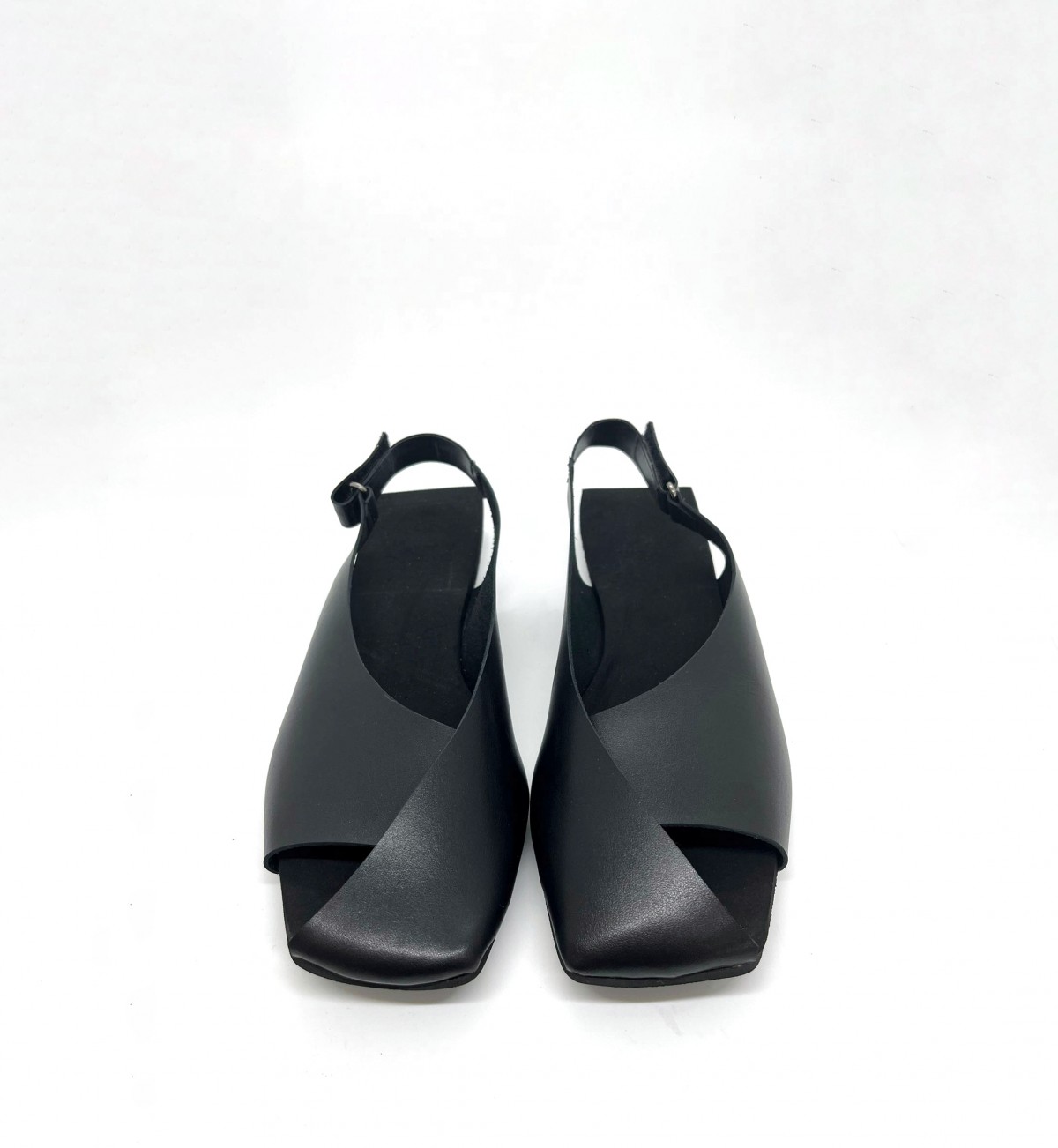 סנדל מרובע שטוח עם רצועה אחורית שנסגרת באמצעות אבזם או סקוץ'. הבוהן הגדולה מוסתרת. רפידת ספוג גומי.