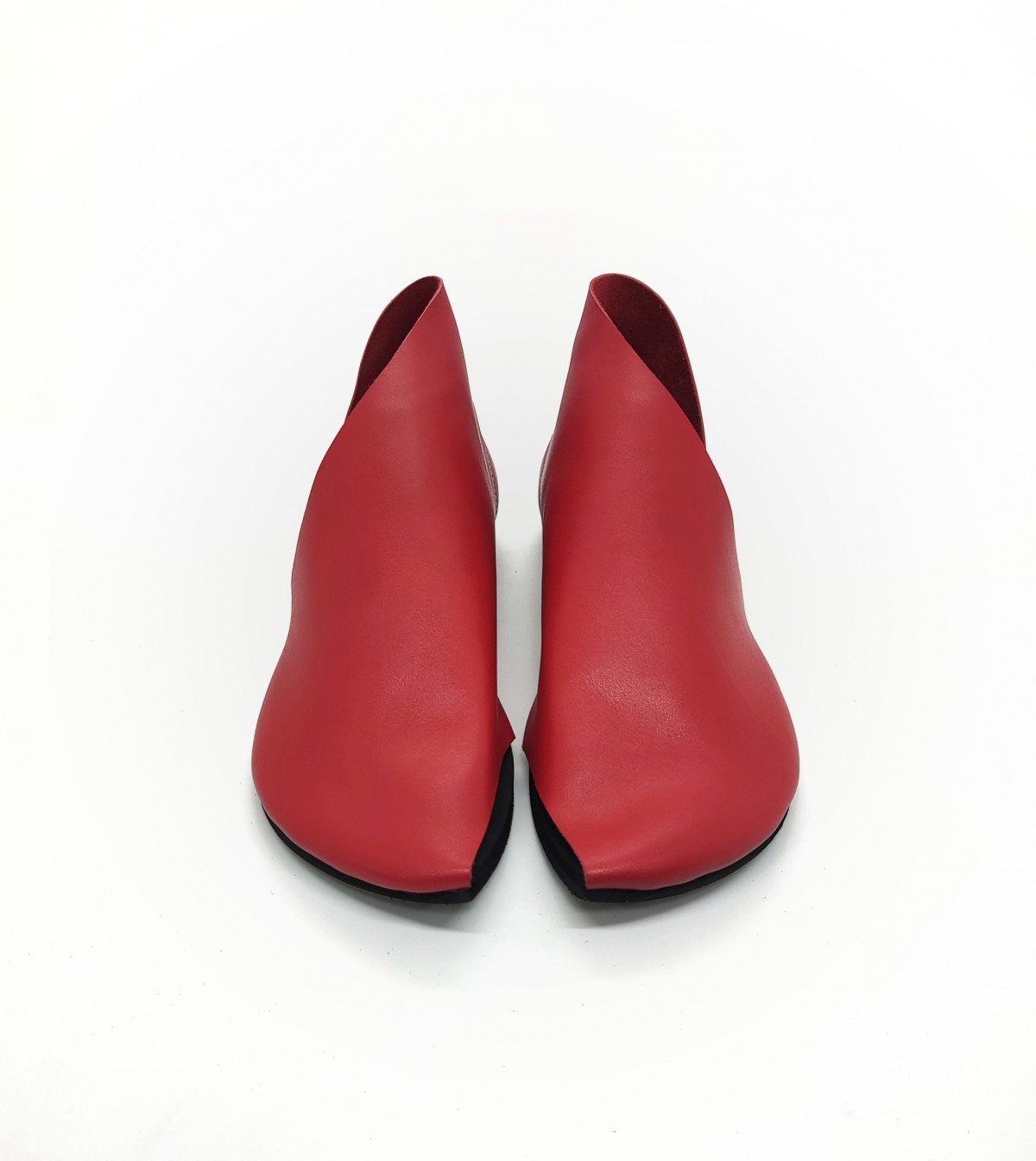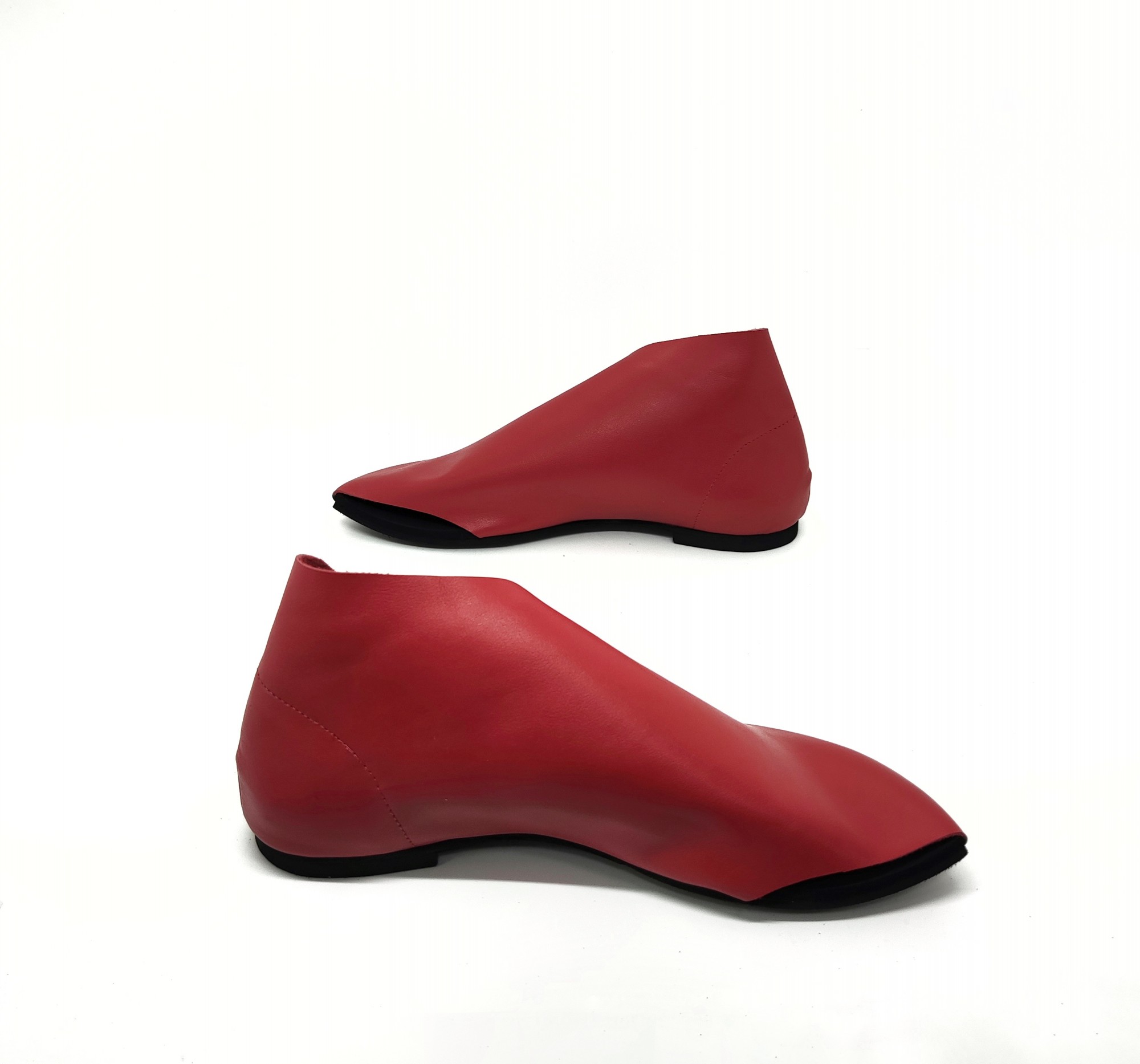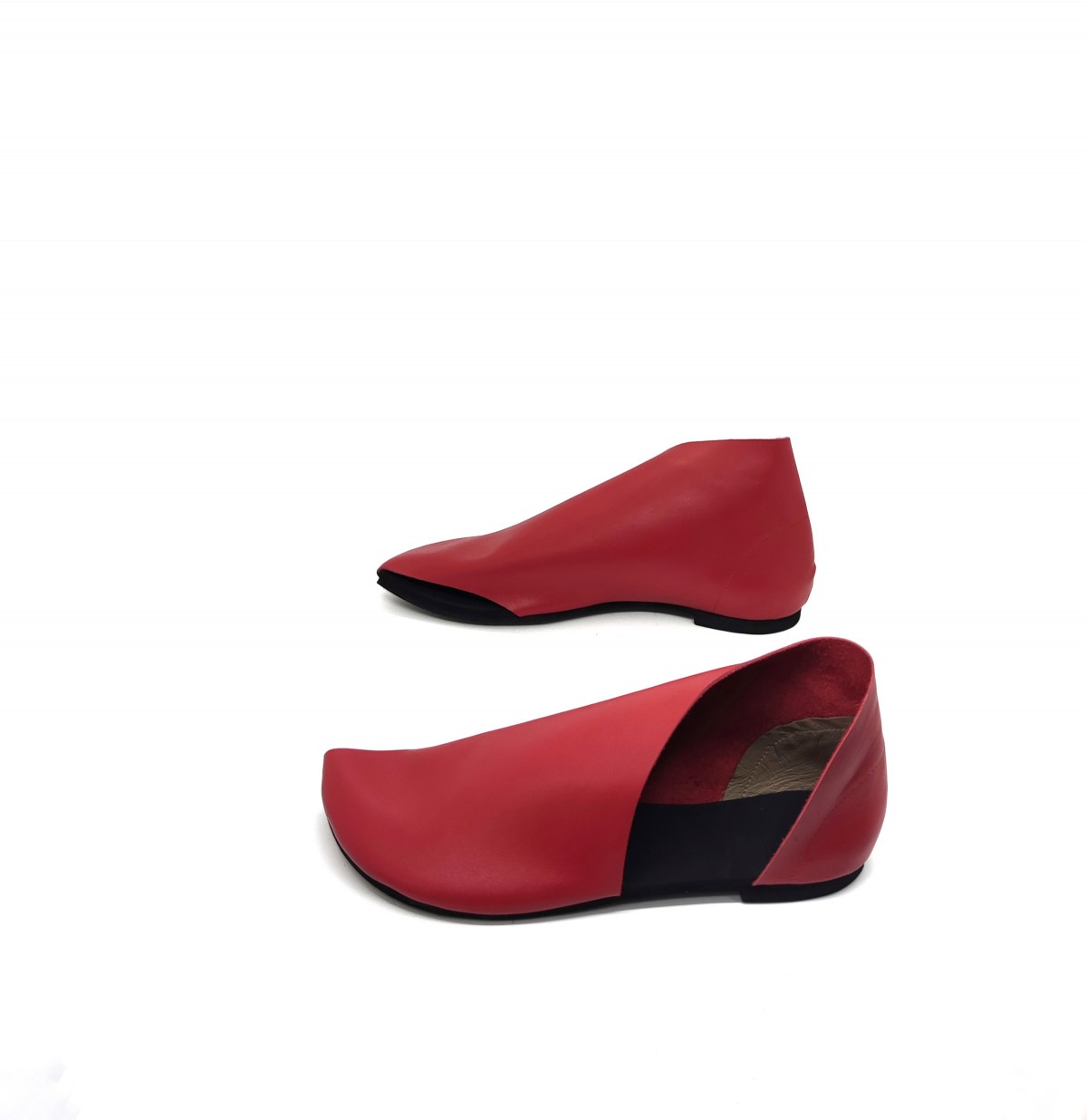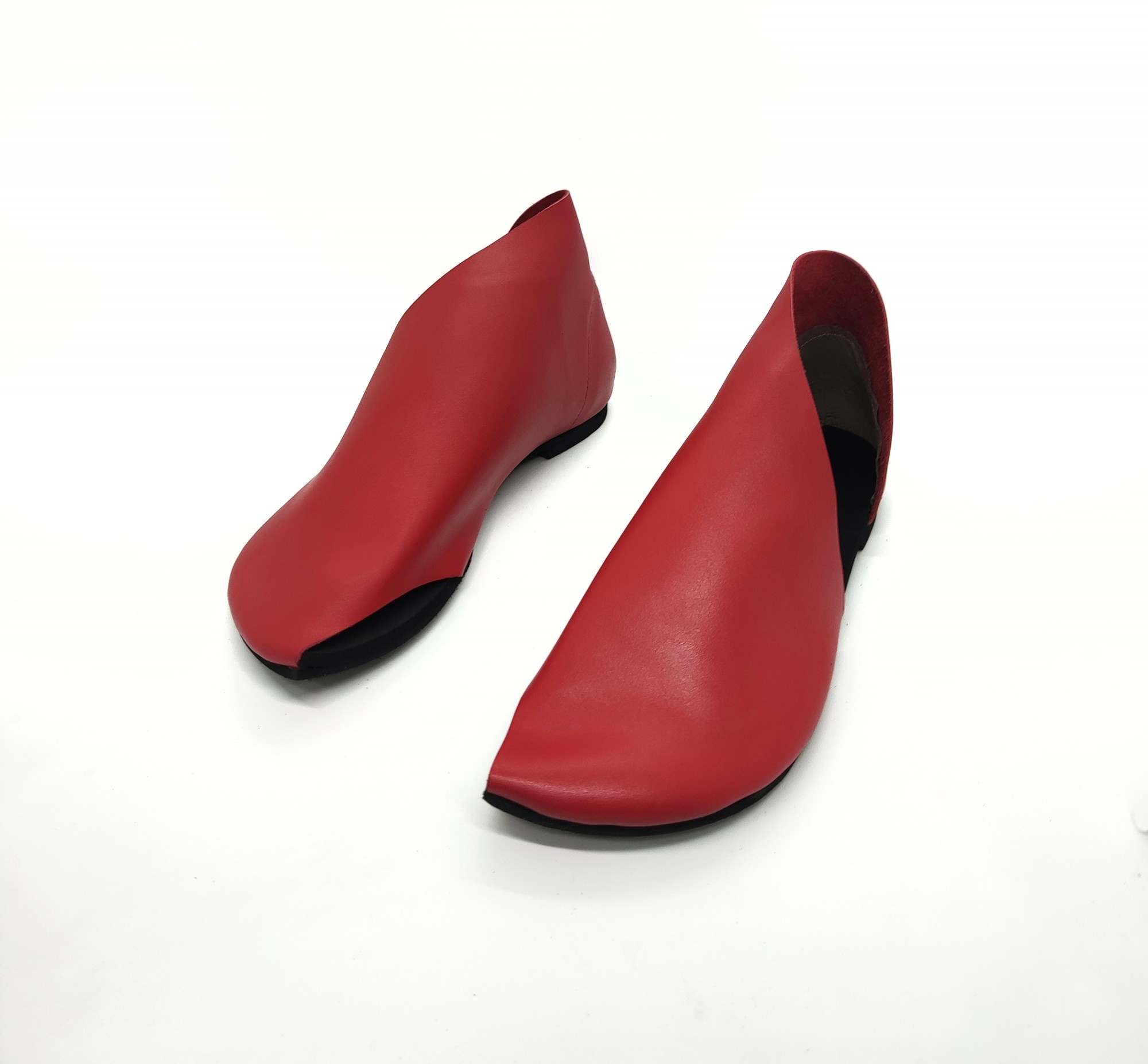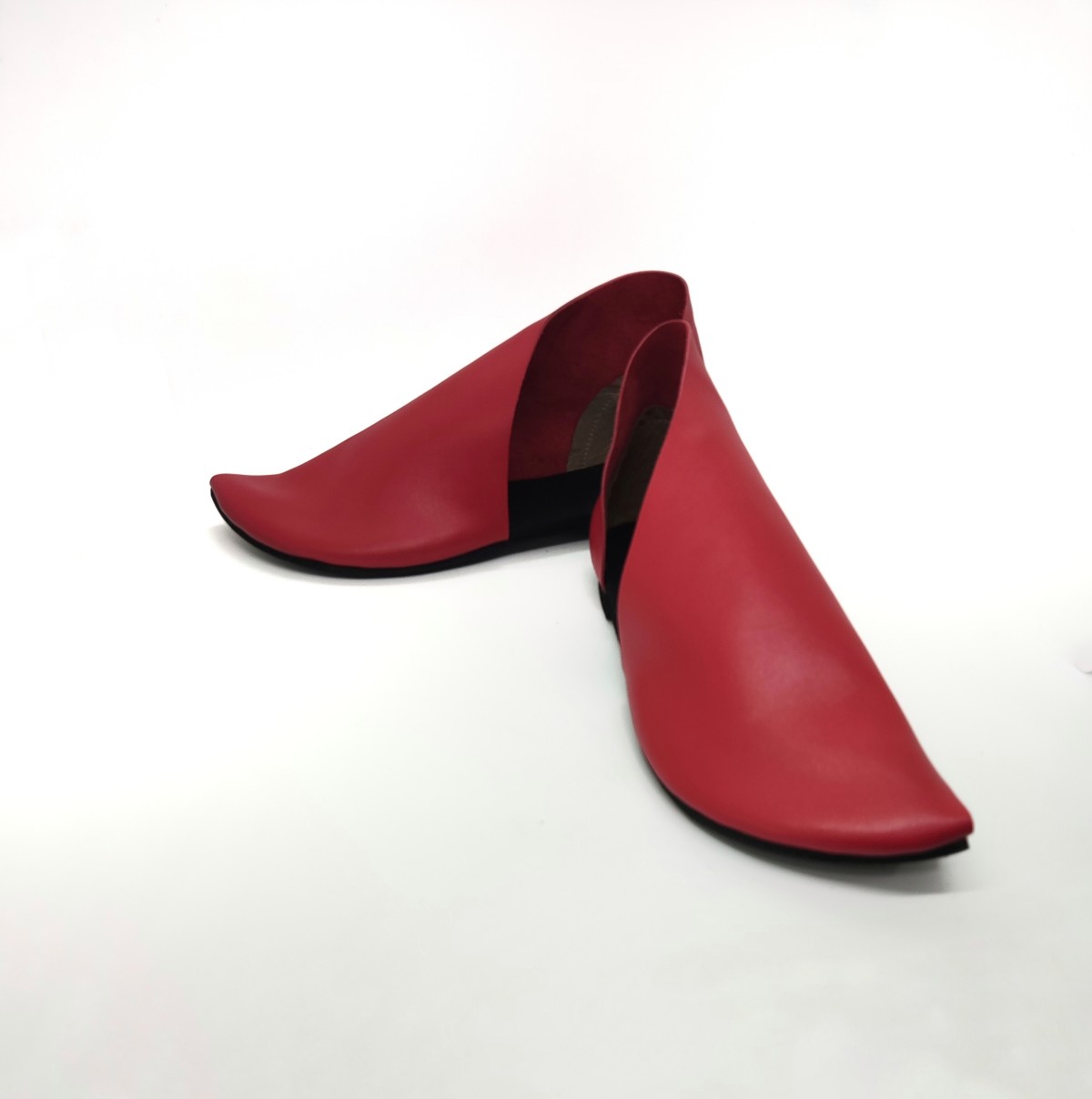 נעל שטוחה ללא סגירה עם פתח גדול בצד החיצוני ופתח איוורור ליד הבוהן הגדולה.עור עם טקסטורה, רפידת ספוג גומי