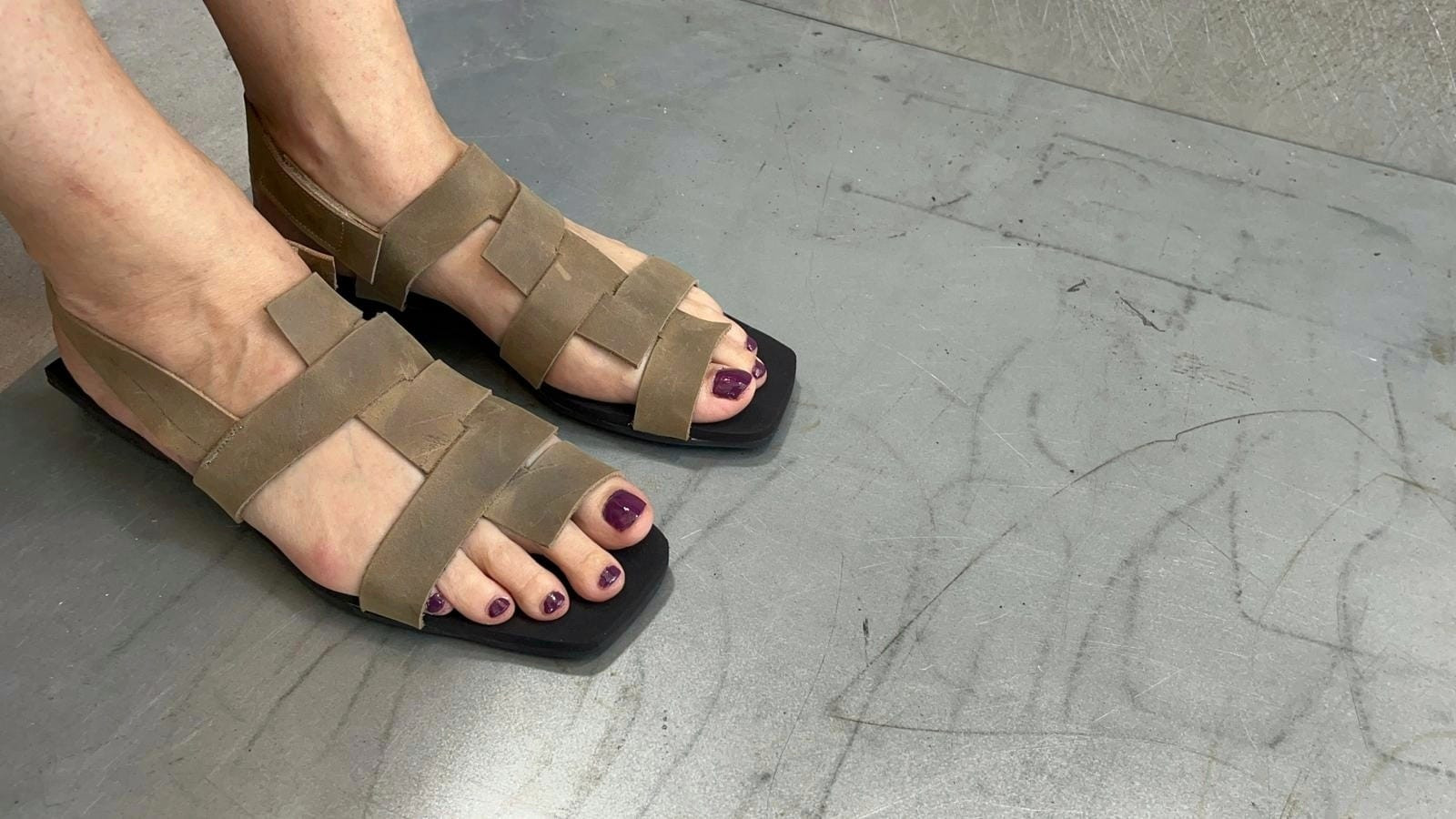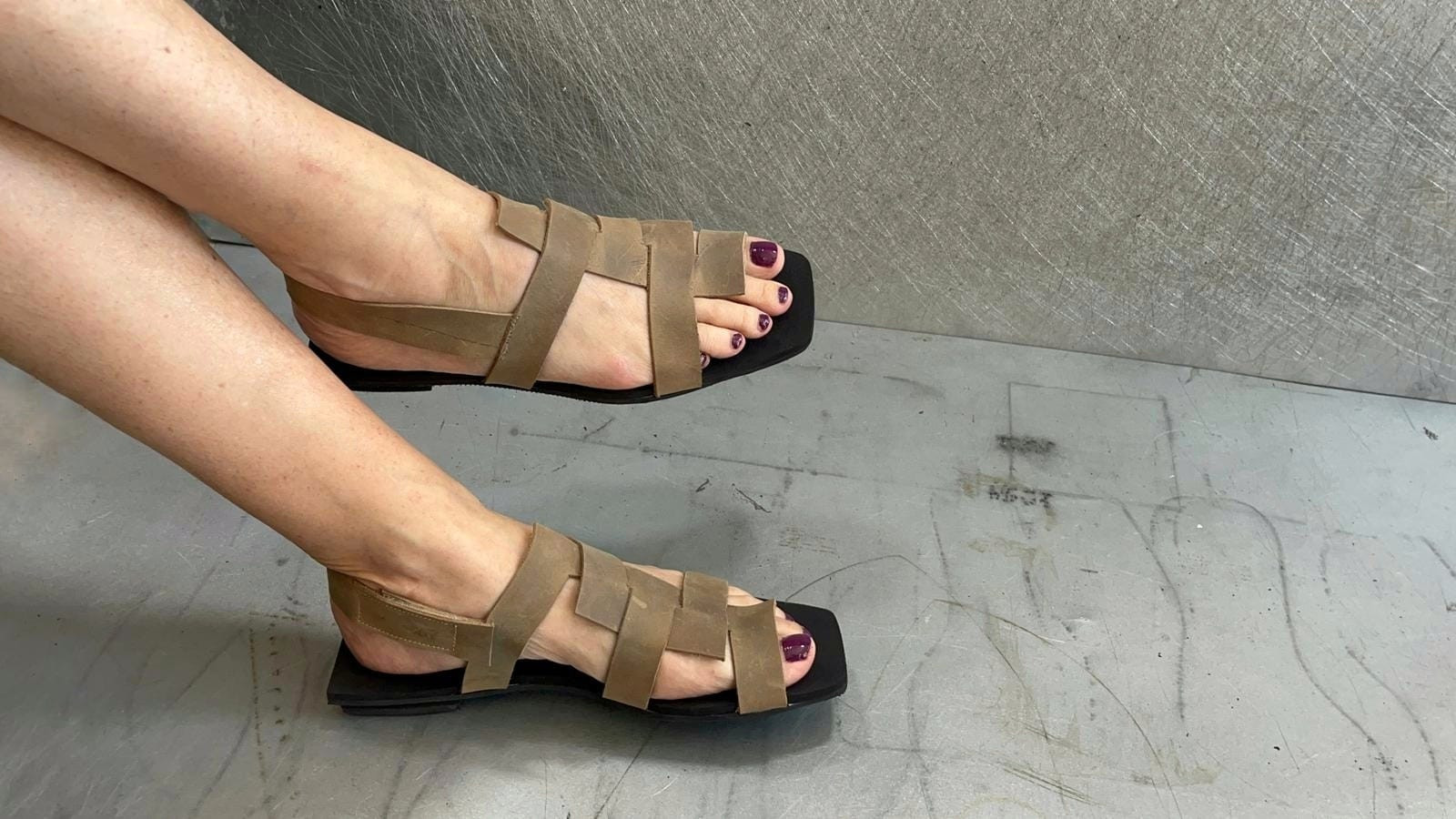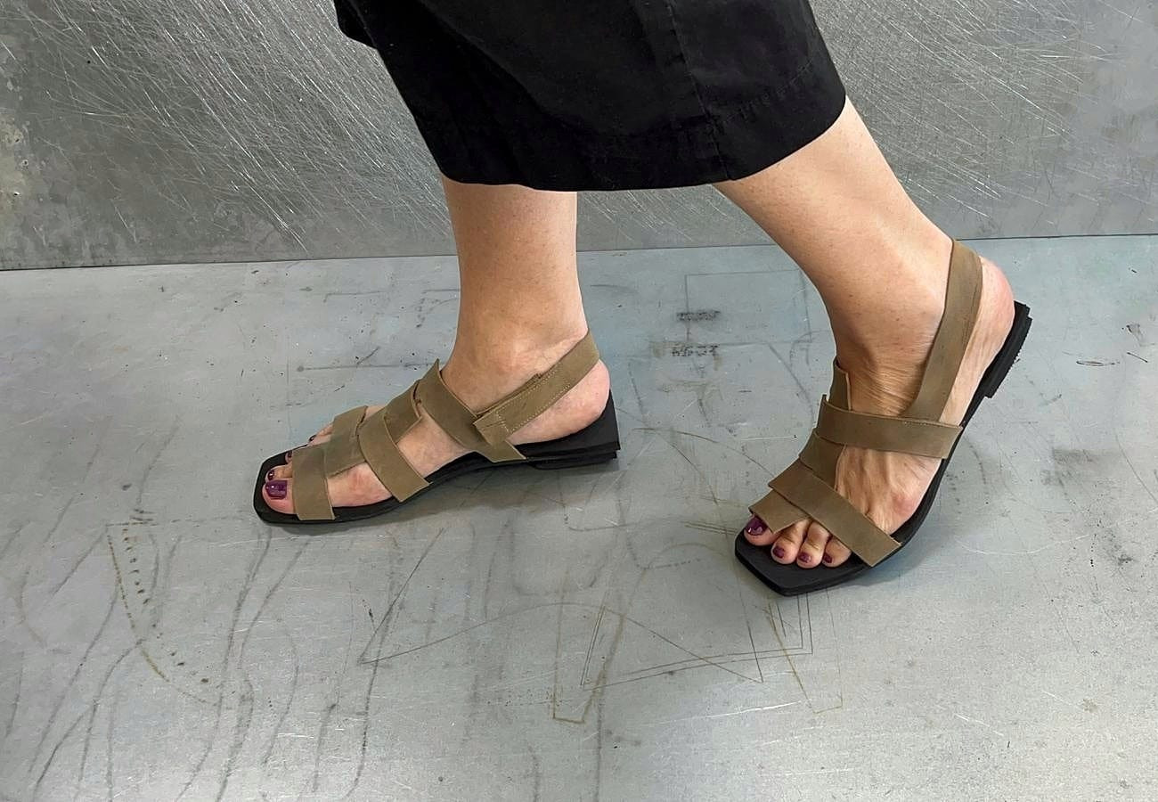 סנדל שטוח קלוע עם סגירת סקוץ'. רפידת ספוג גומי, עור נובוק.