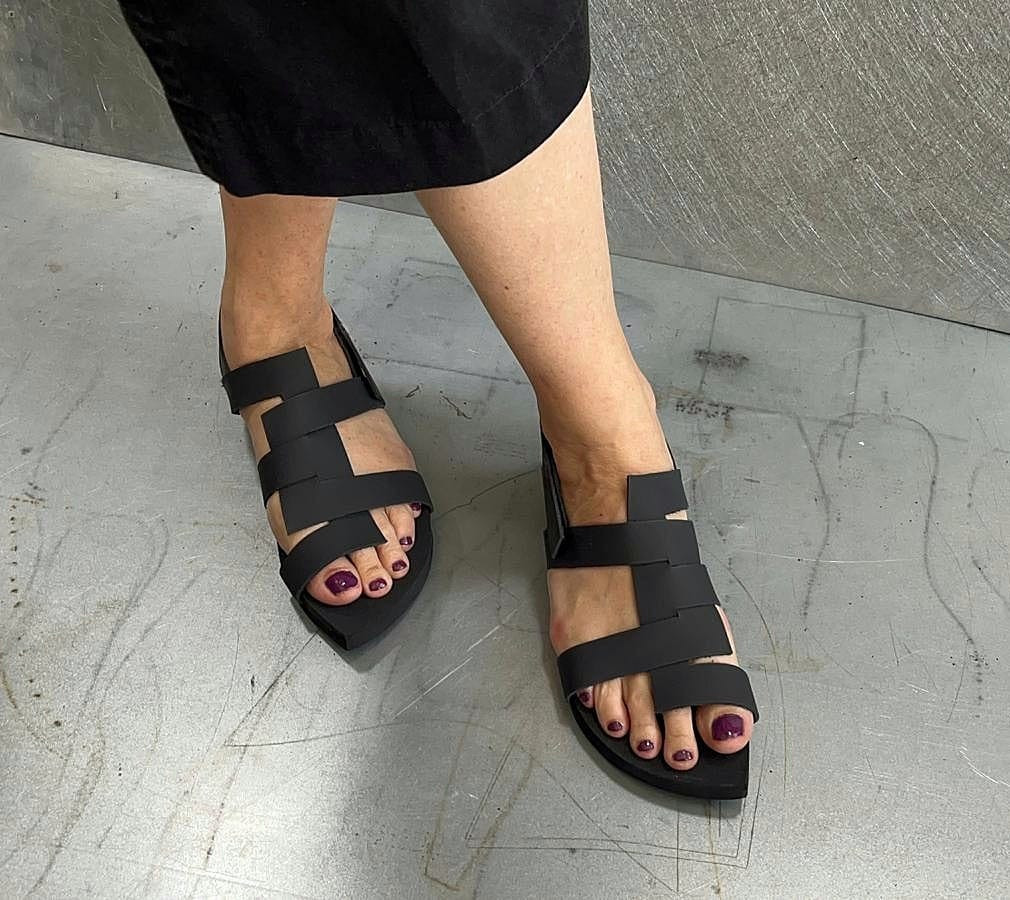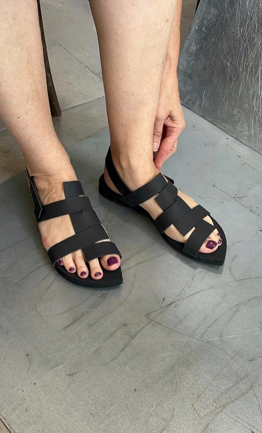סנדל שטוח קלוע עם סגירת סקוץ'. רפידת ספוג גומי, עור נובוק.