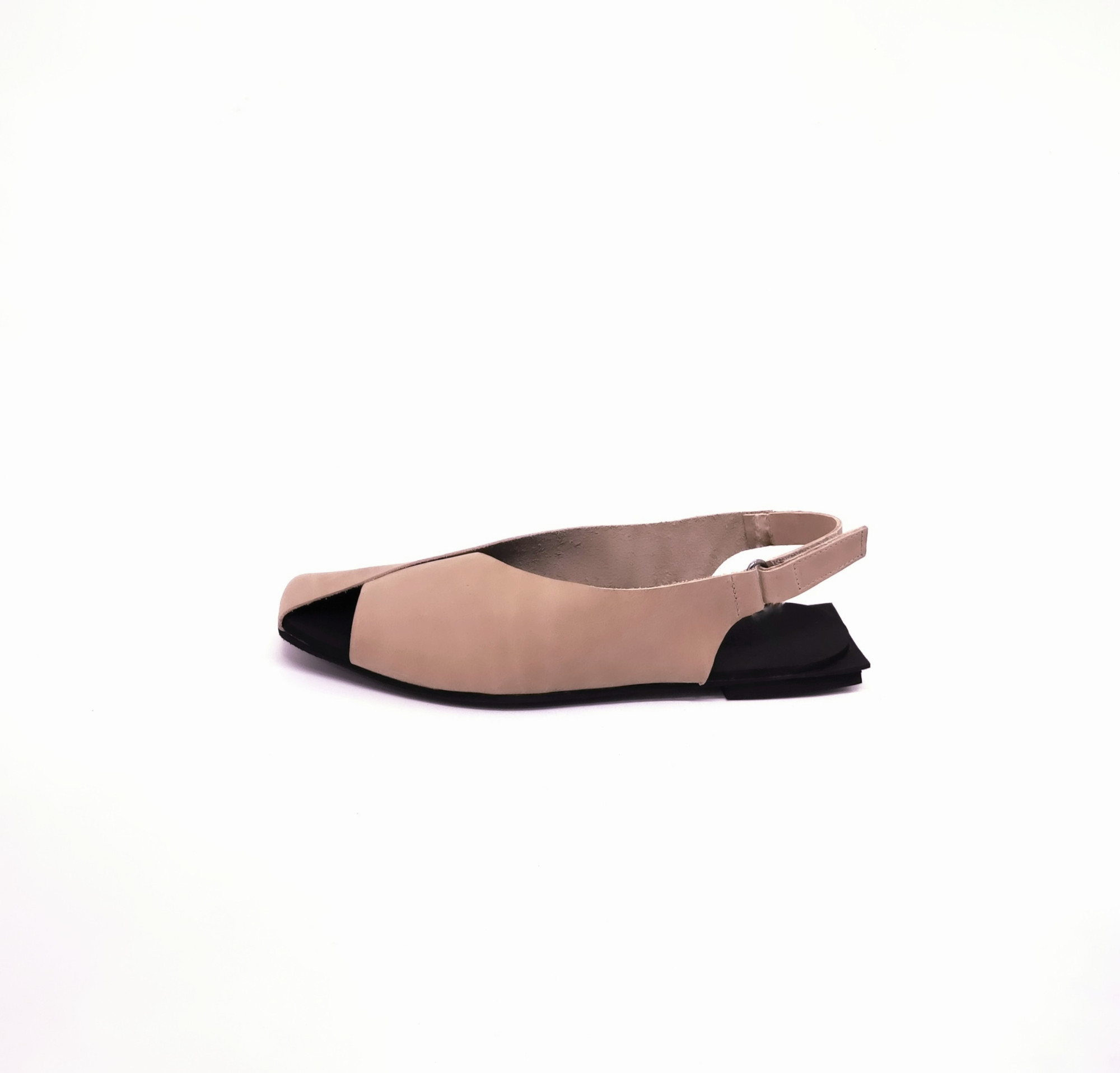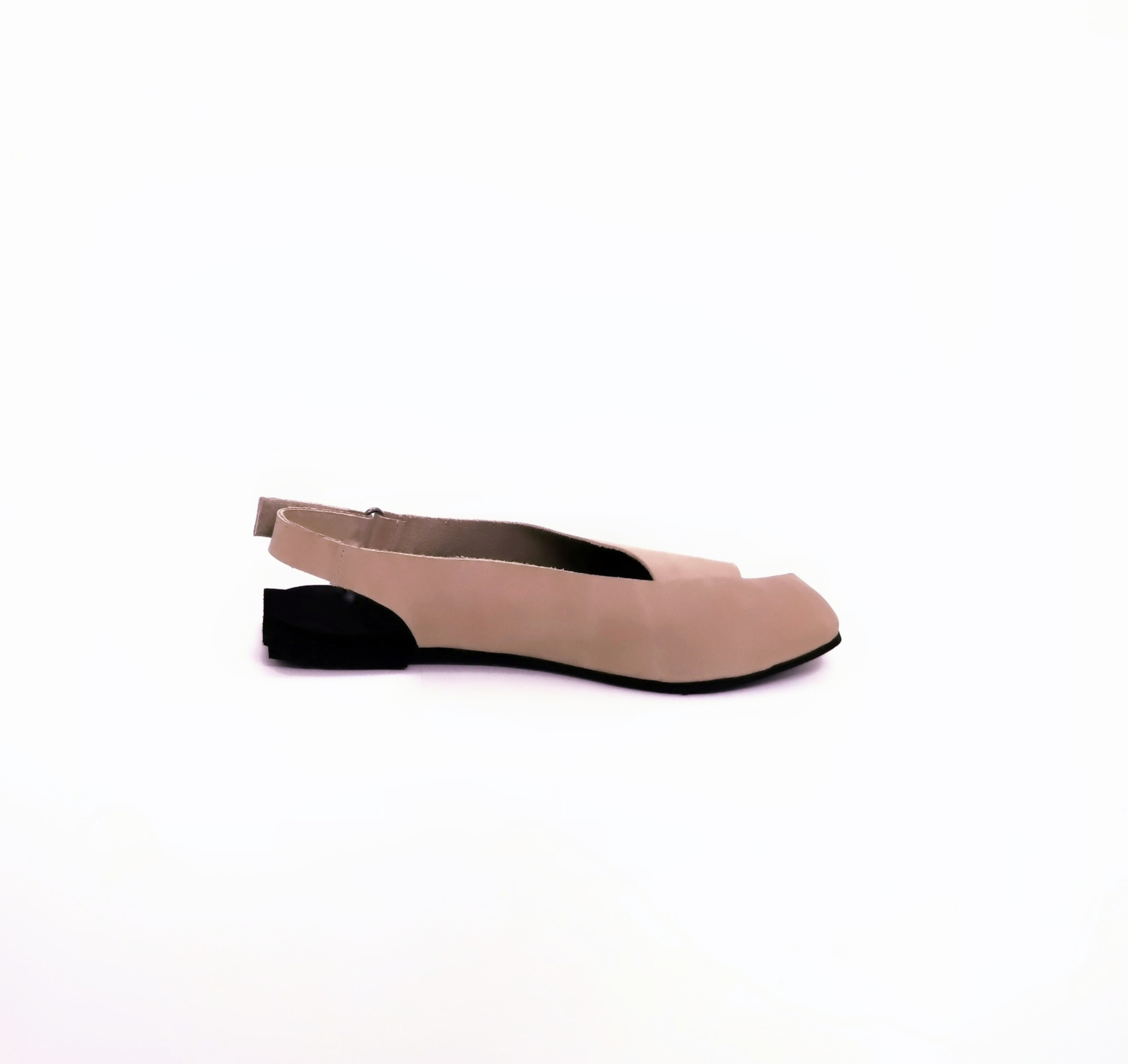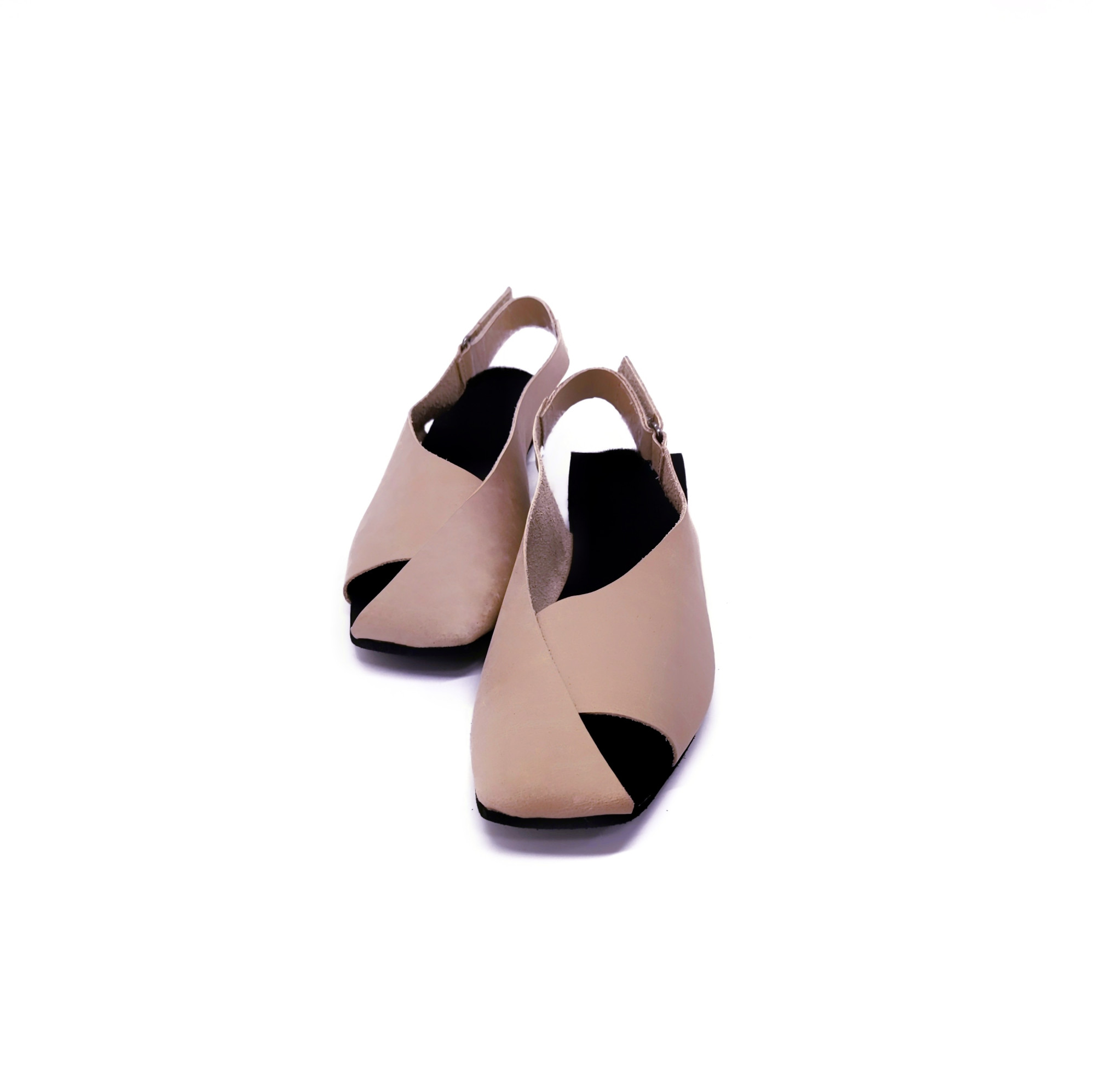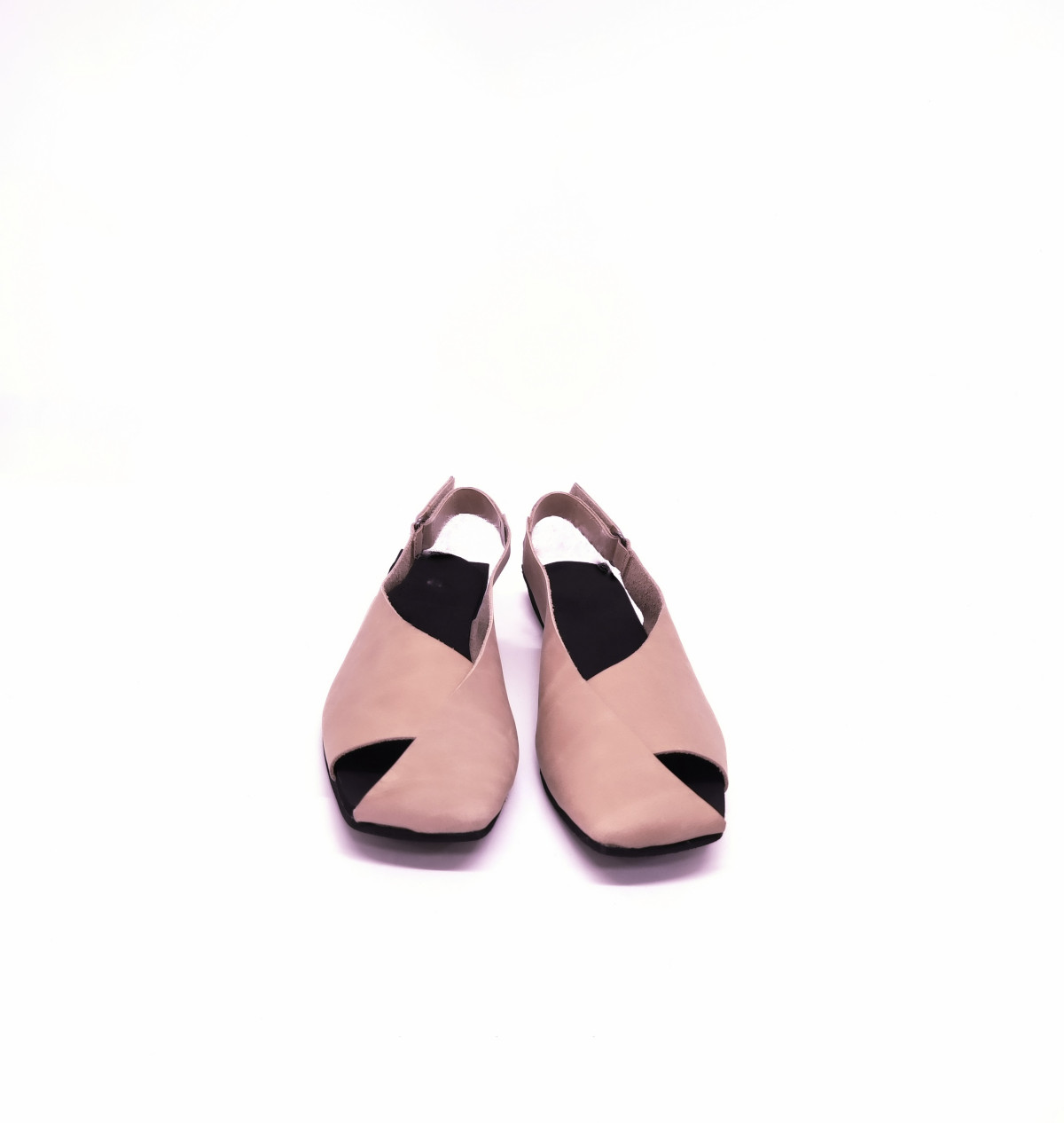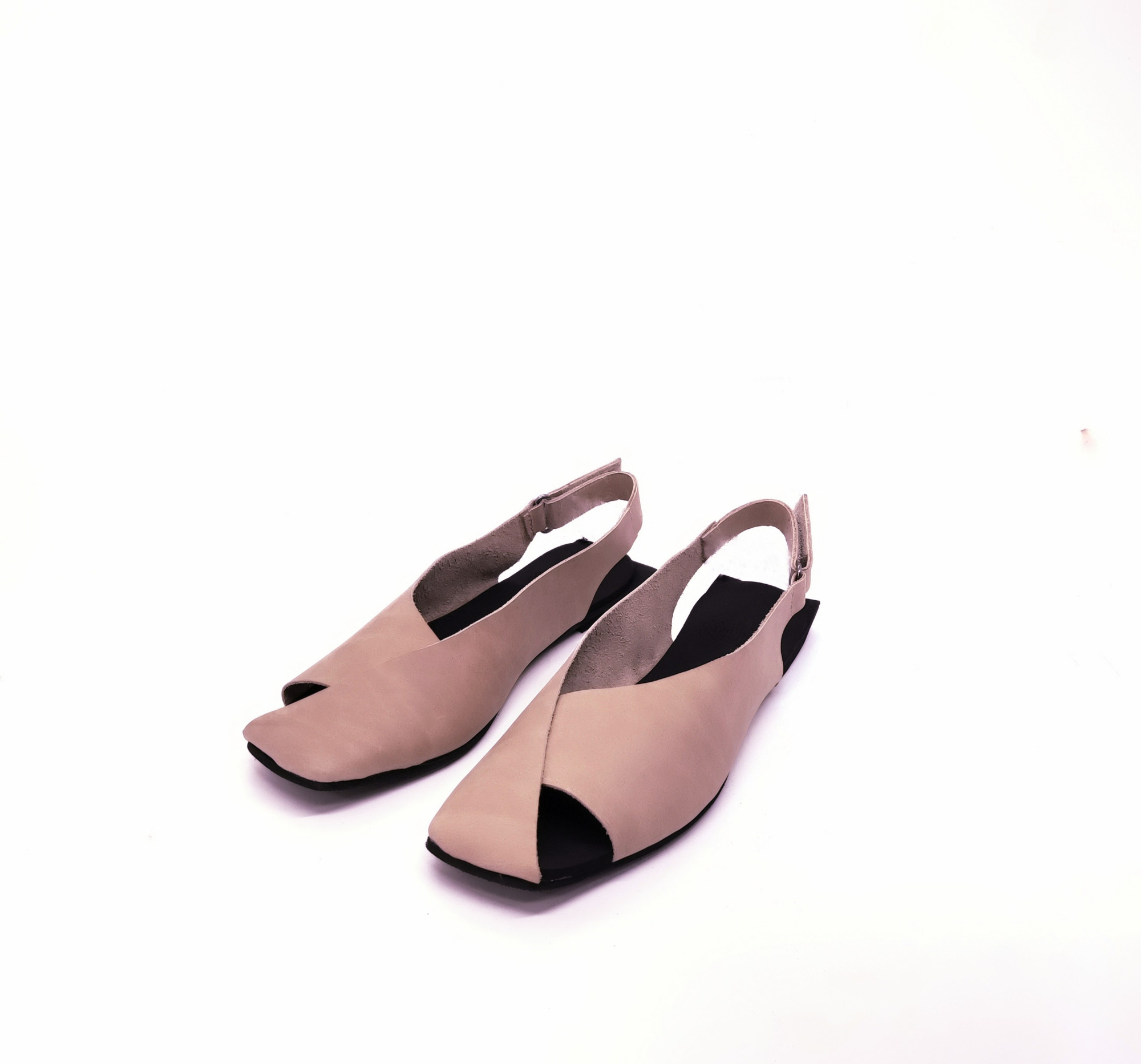 סנדל מרובע שטוח עם רצועה אחורית שנסגרת באמצעות אבזם או סקוץ'. הבוהן הגדולה מוסתרת. רפידת ספוג גומי.